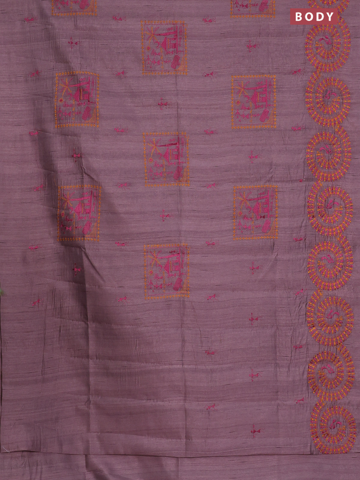 Semi raw silk saree pastel pueple shade with embroidery work buttas and warli design embroidery border