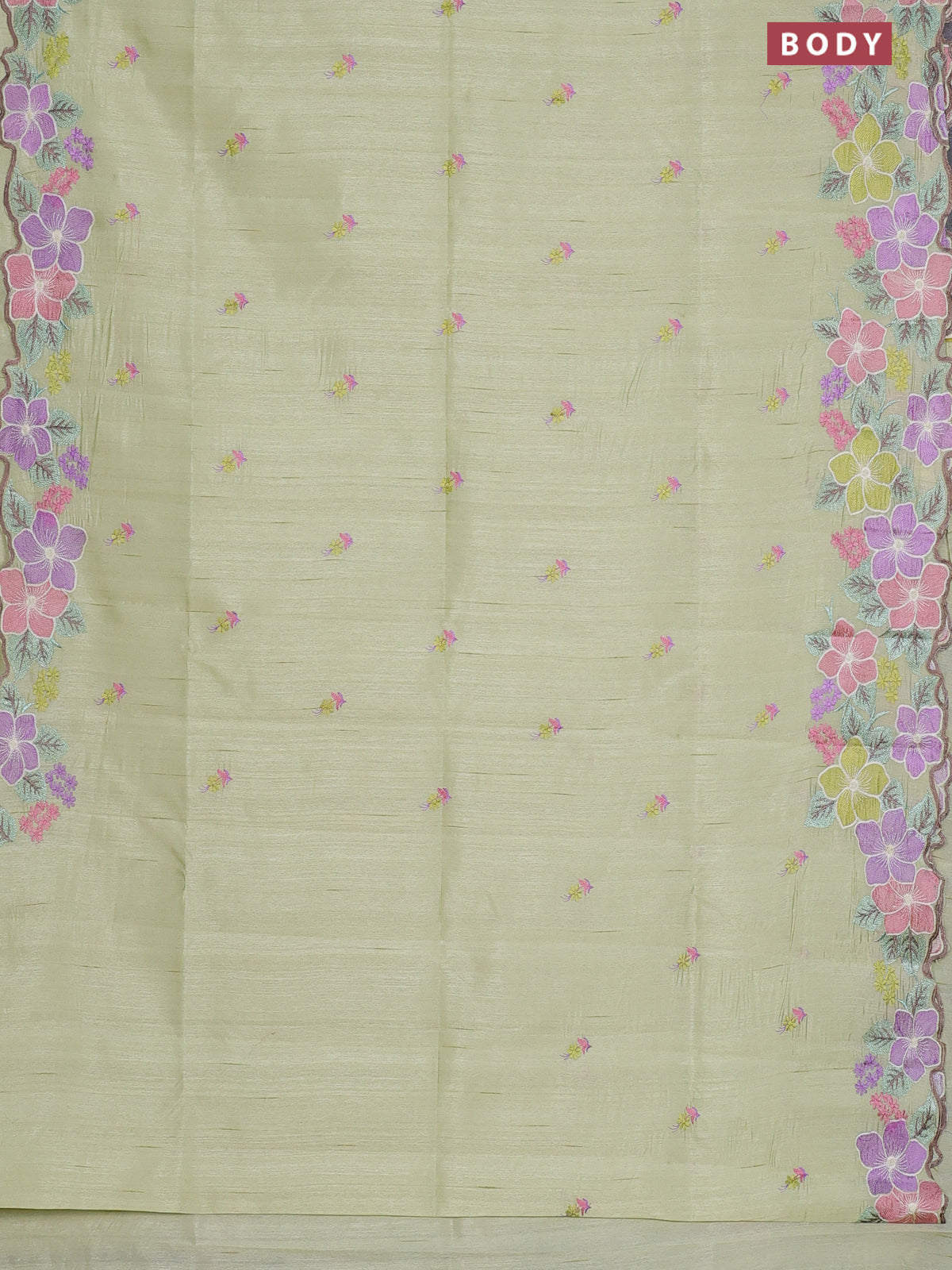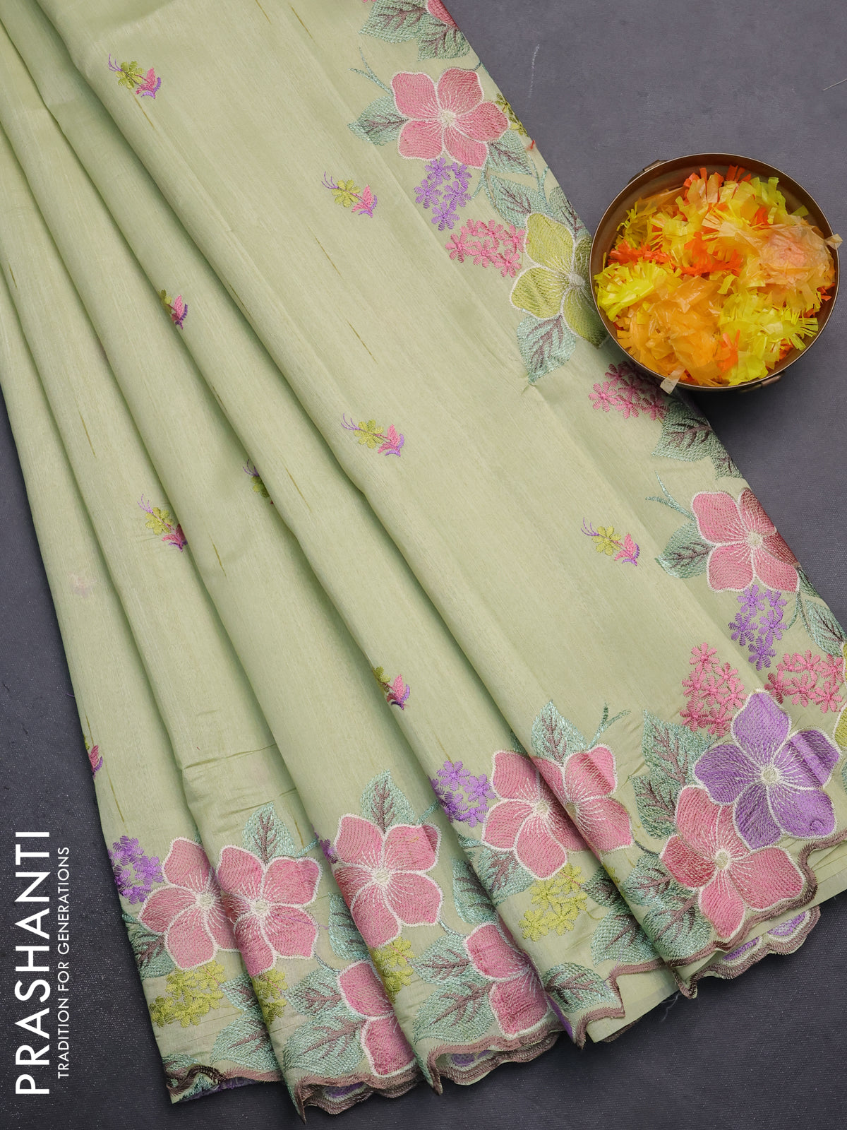 Semi raw silk saree pista green with embroidery work buttas and floral embroidery border