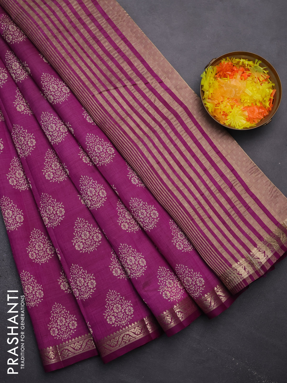 Semi raw silk saree purple with butta prints and zari woven border