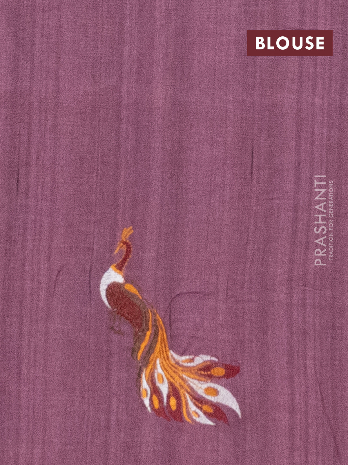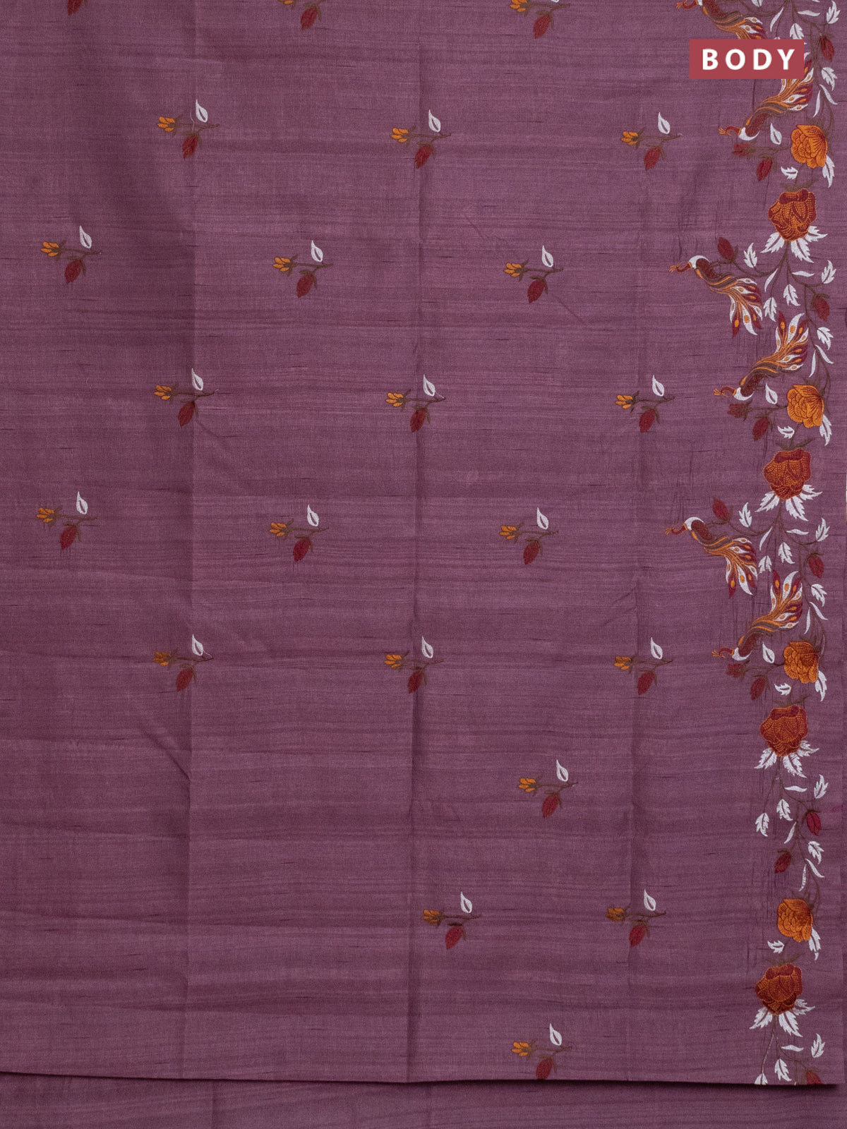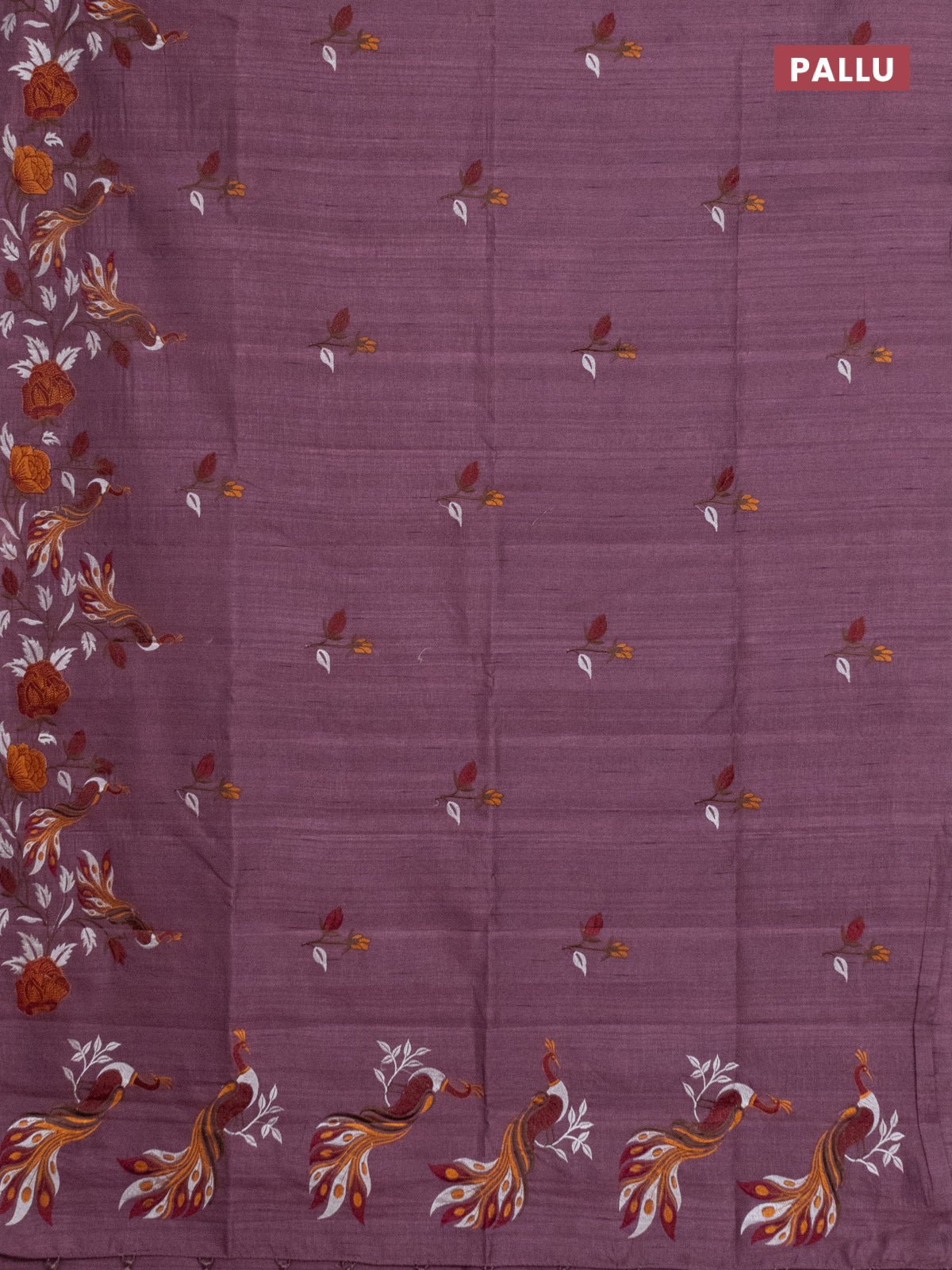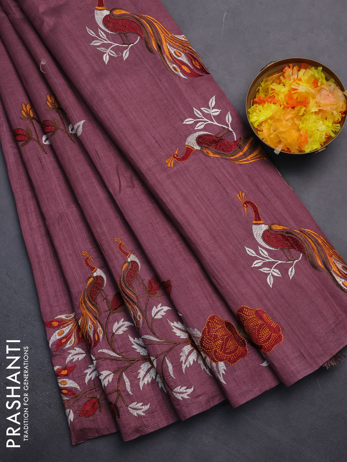Semi raw silk saree rosy brown with embroidery work buttas and peacock embroidery border