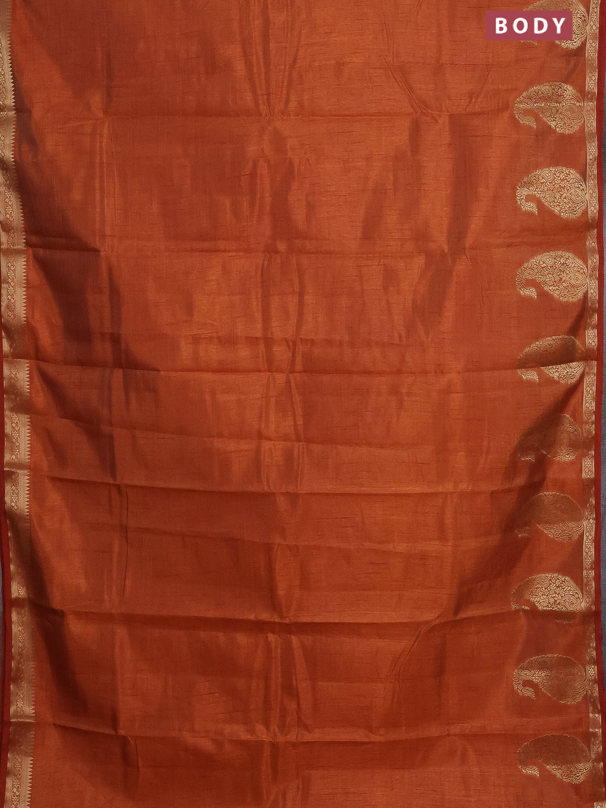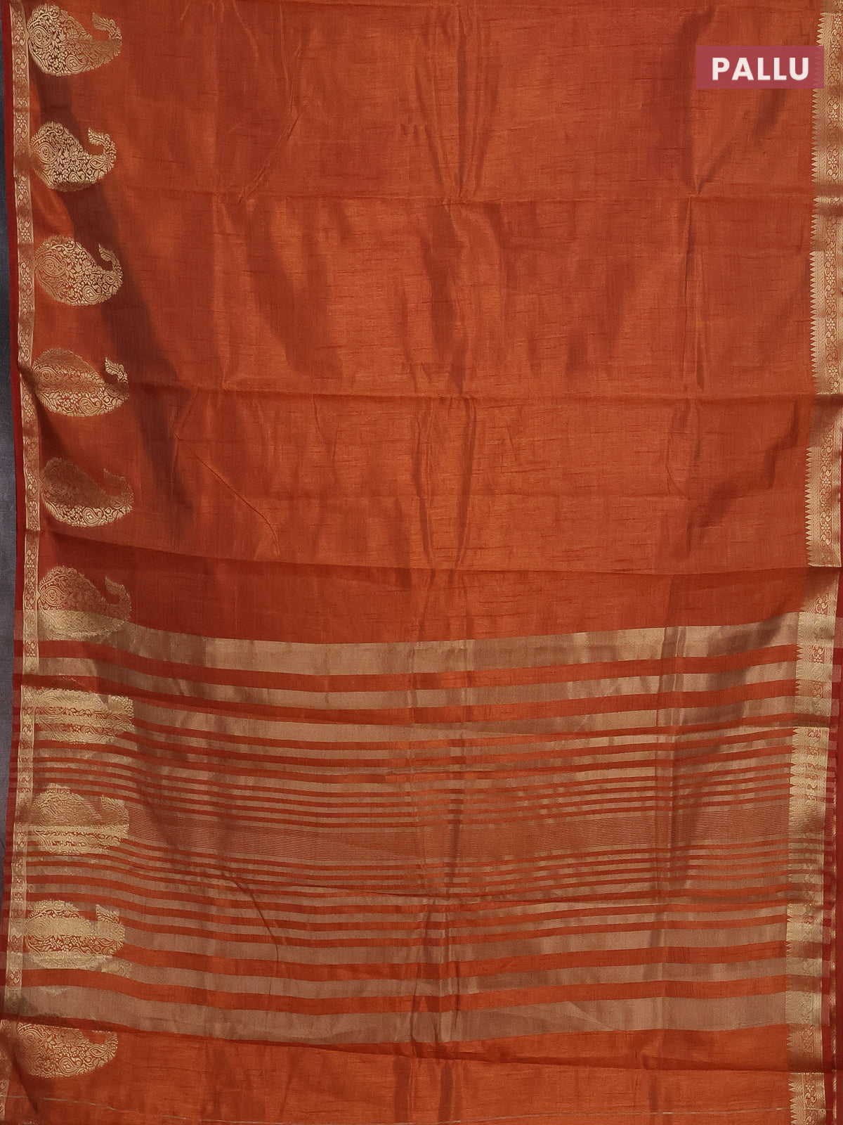 Semi raw silk saree rust shade with plain body and paisley design zari woven butta border