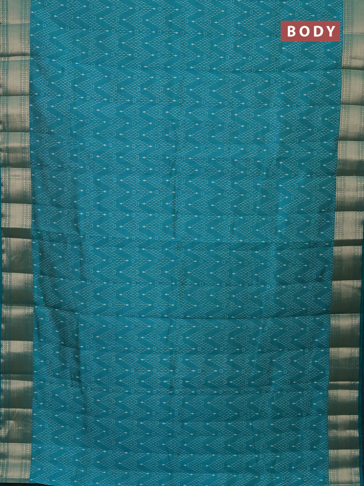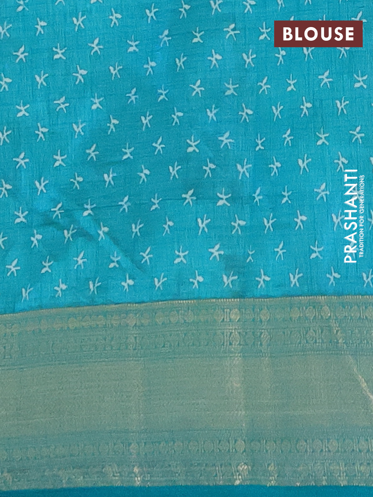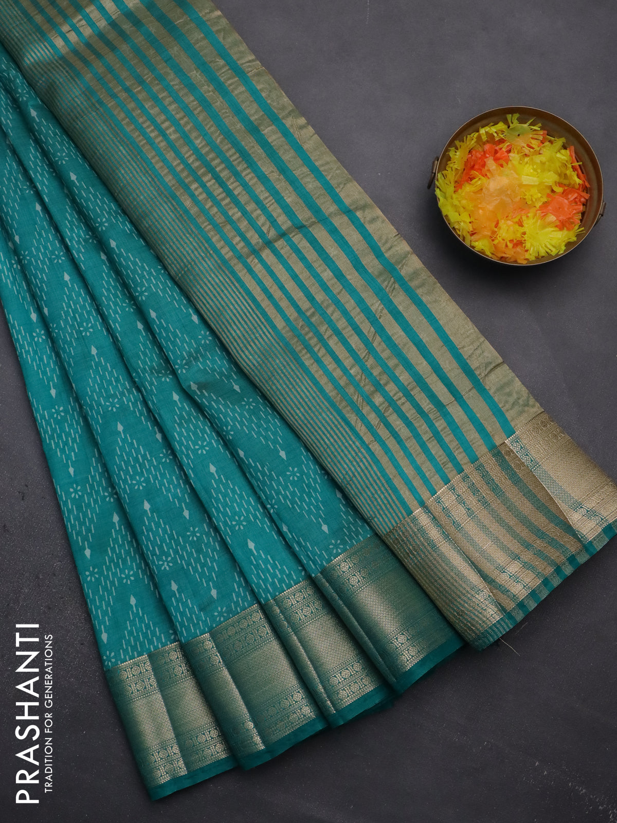 Semi raw silk saree teal blue with allover prints and zari woven border