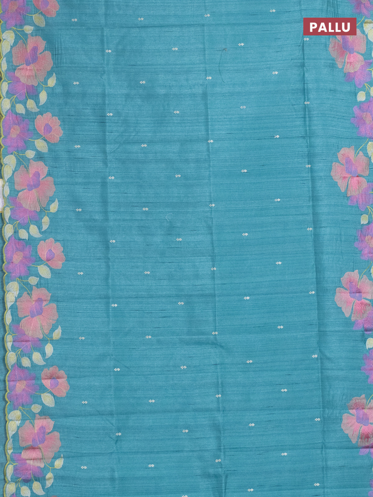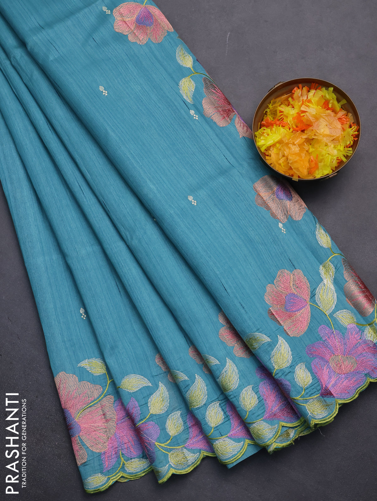 Semi raw silk saree teal blue with embroidery work buttas and floral embroidery border