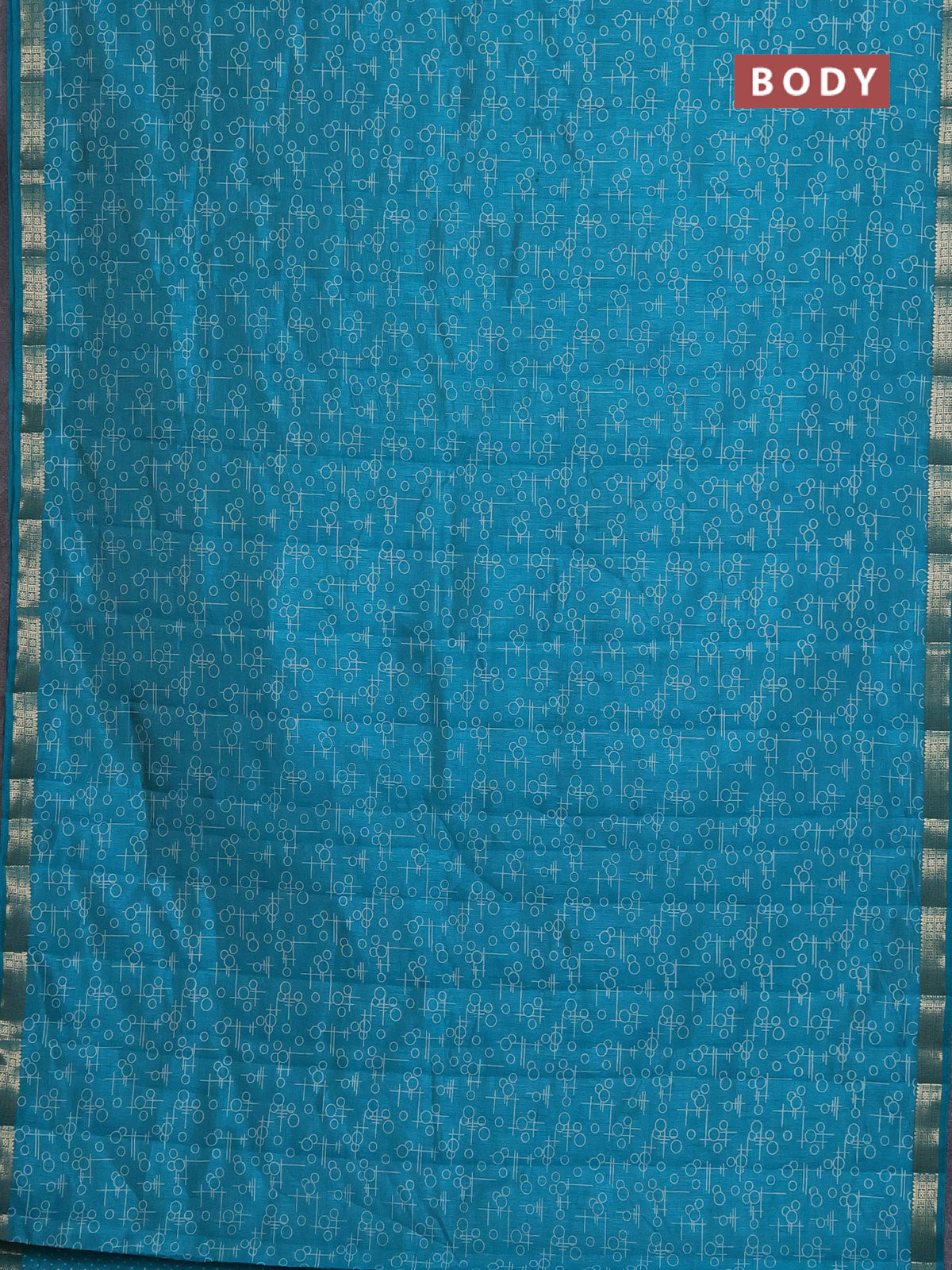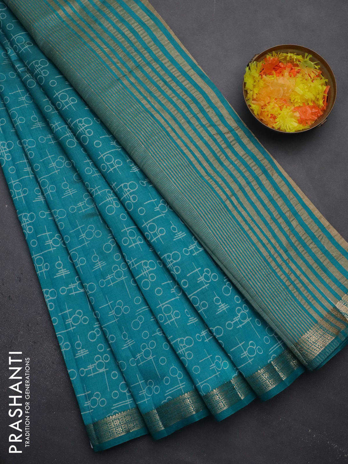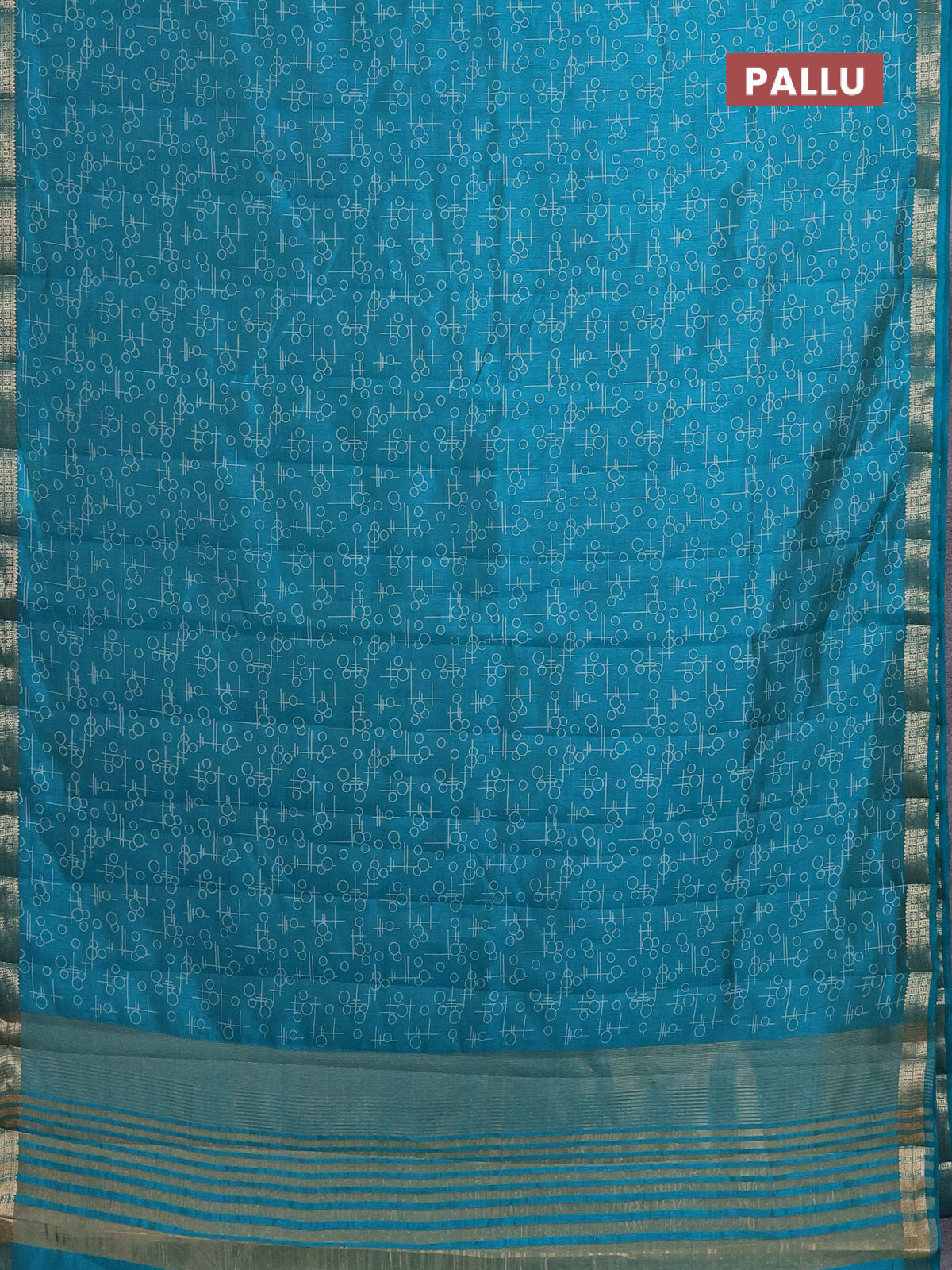 Semi raw silk saree teal blue with geometric prints and zari woven border