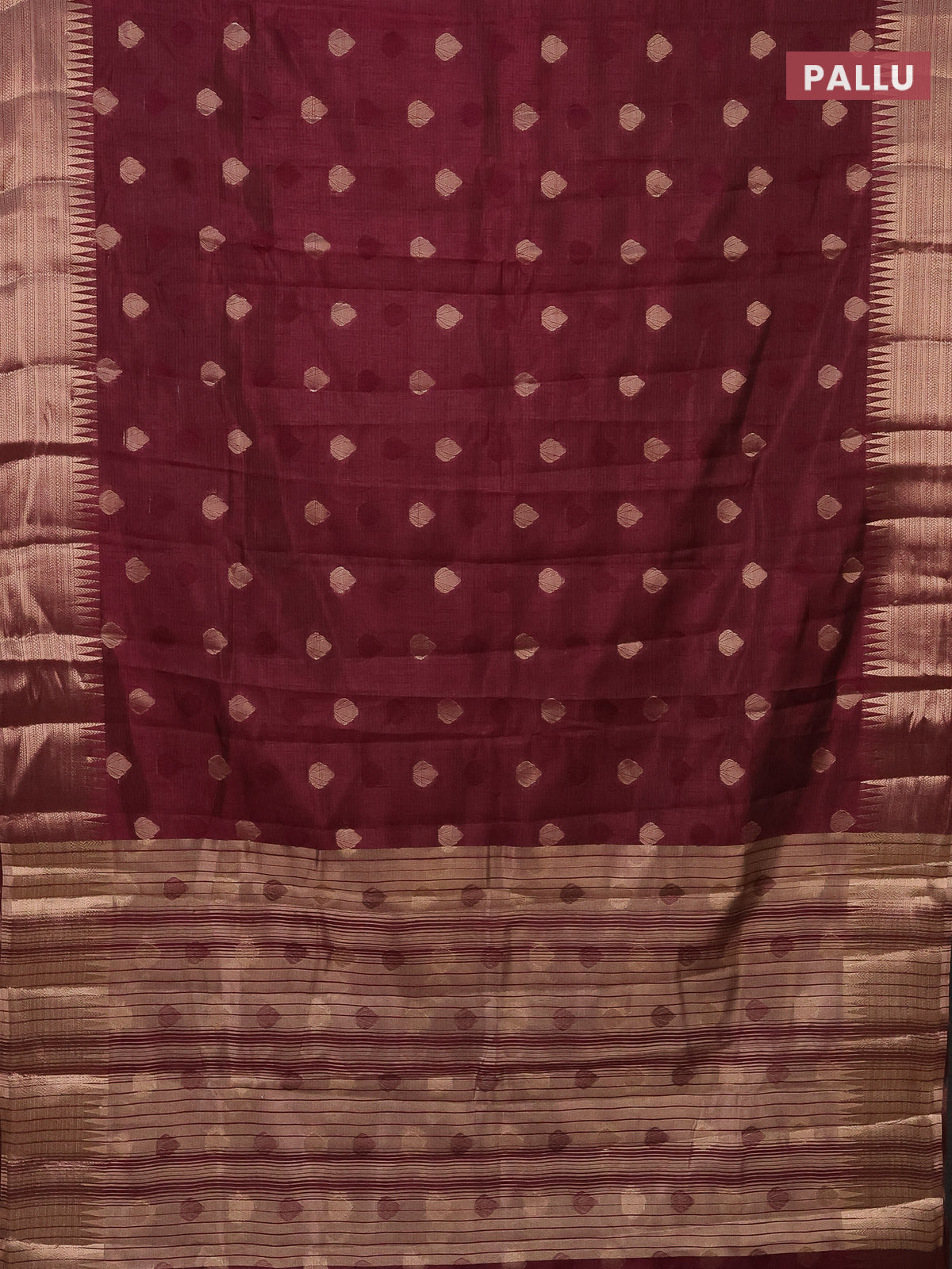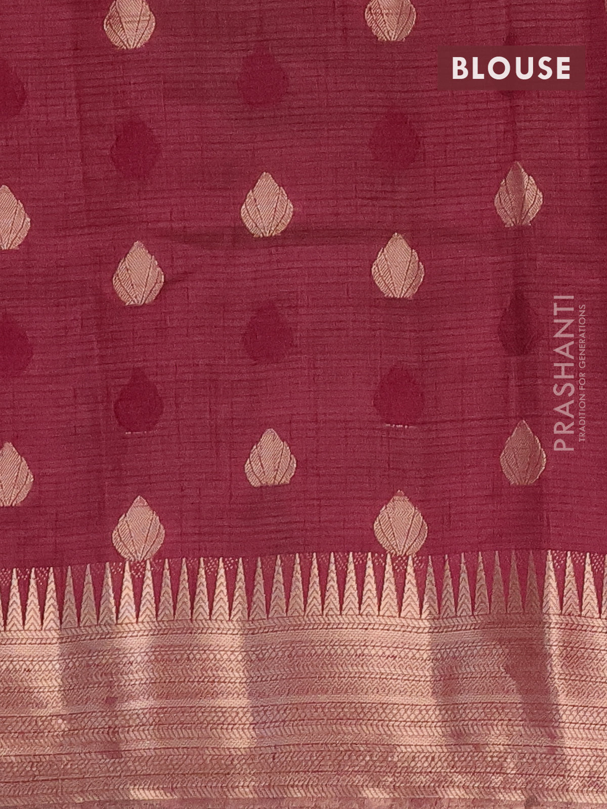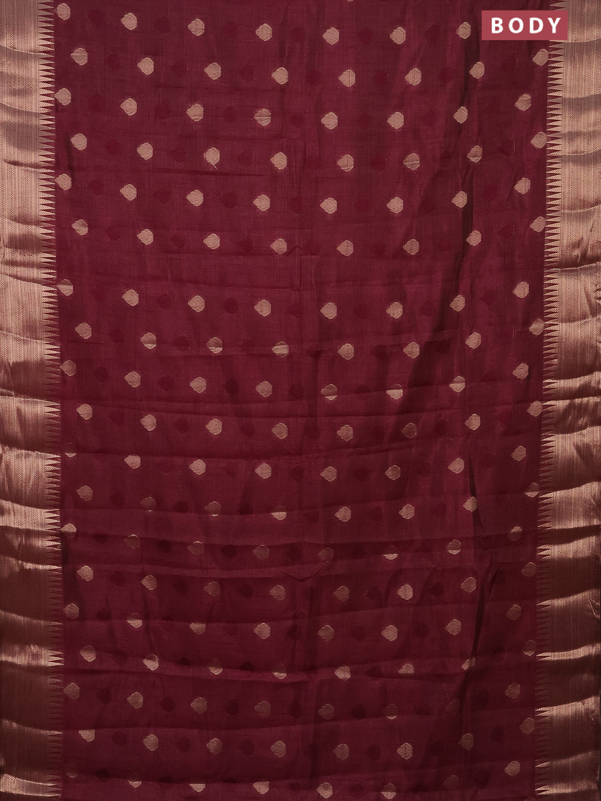 Semi raw silk saree wine shade with thread & zari woven buttas and temple design zari woven border