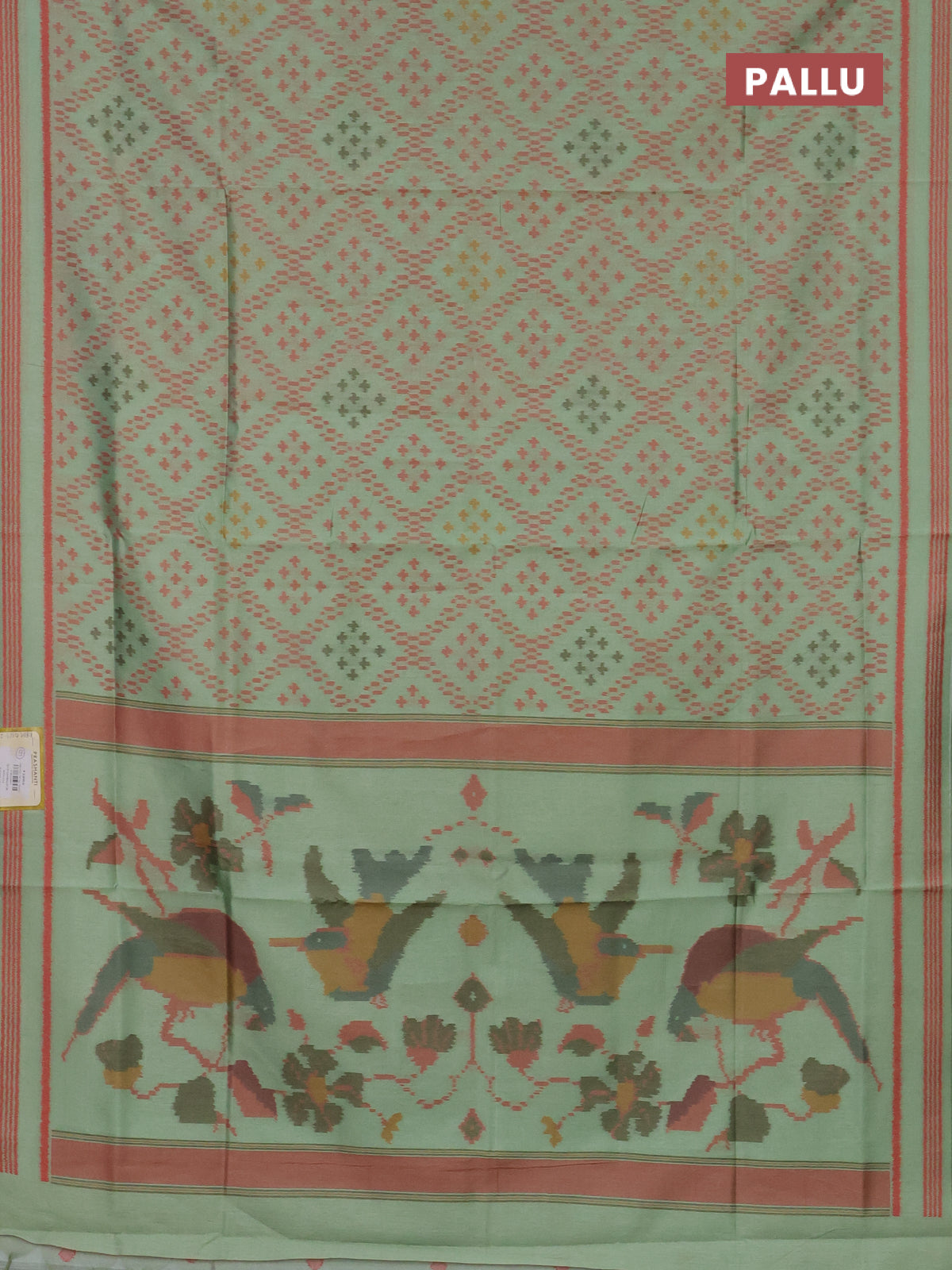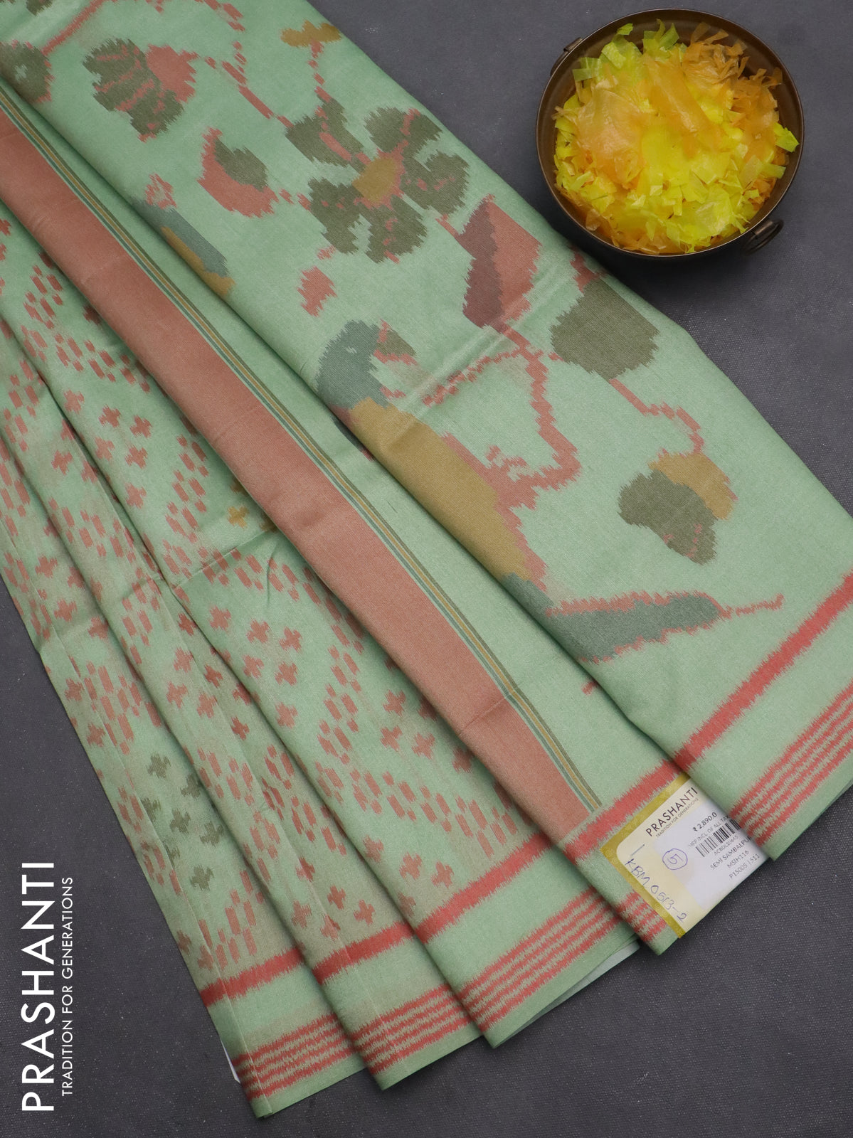 Semi sambalpuri silk saree pista green and peach orange with allover ikat weaves and thread woven border