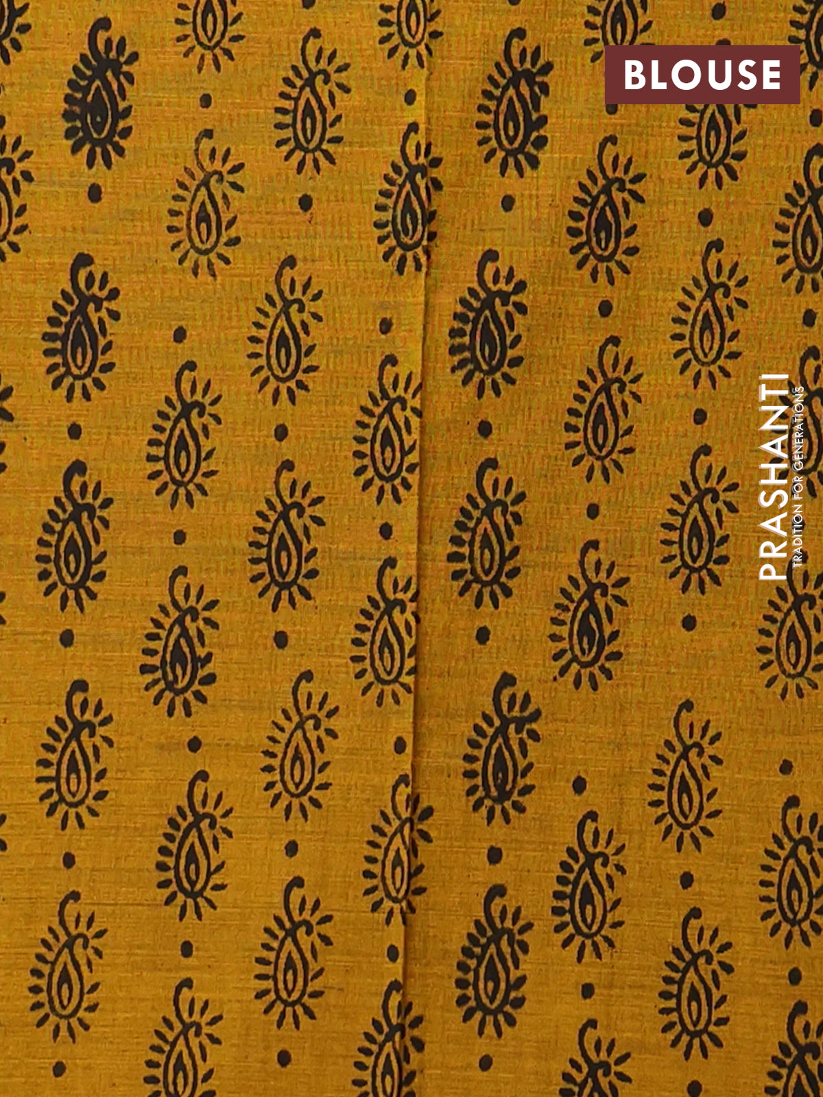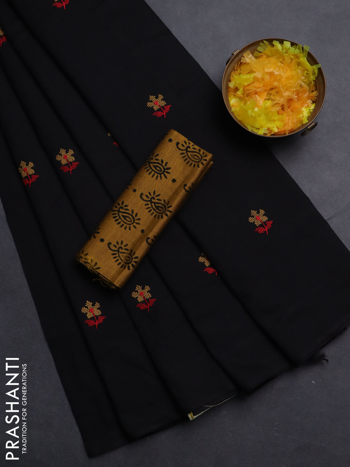 Semi silk cotton saree black and mustard shade with embroided buttas in borderless style