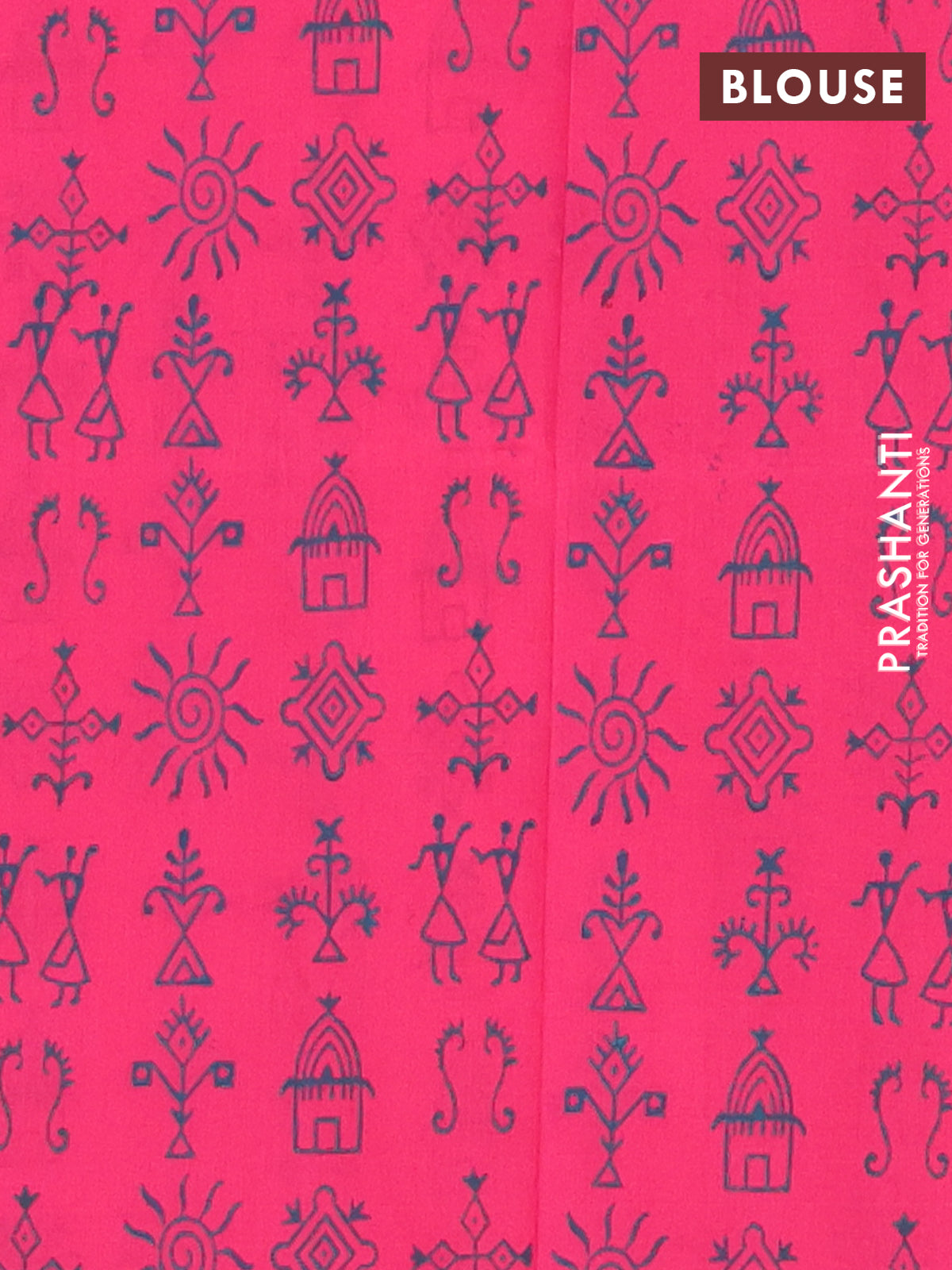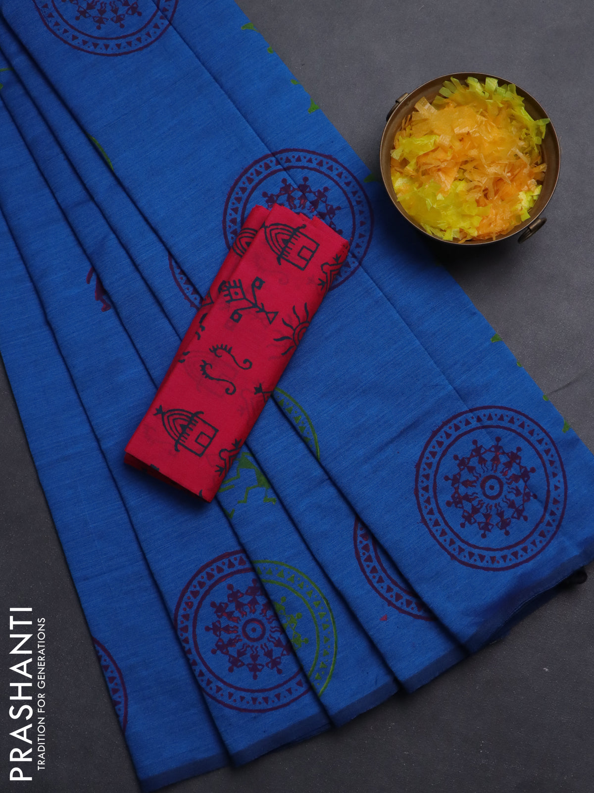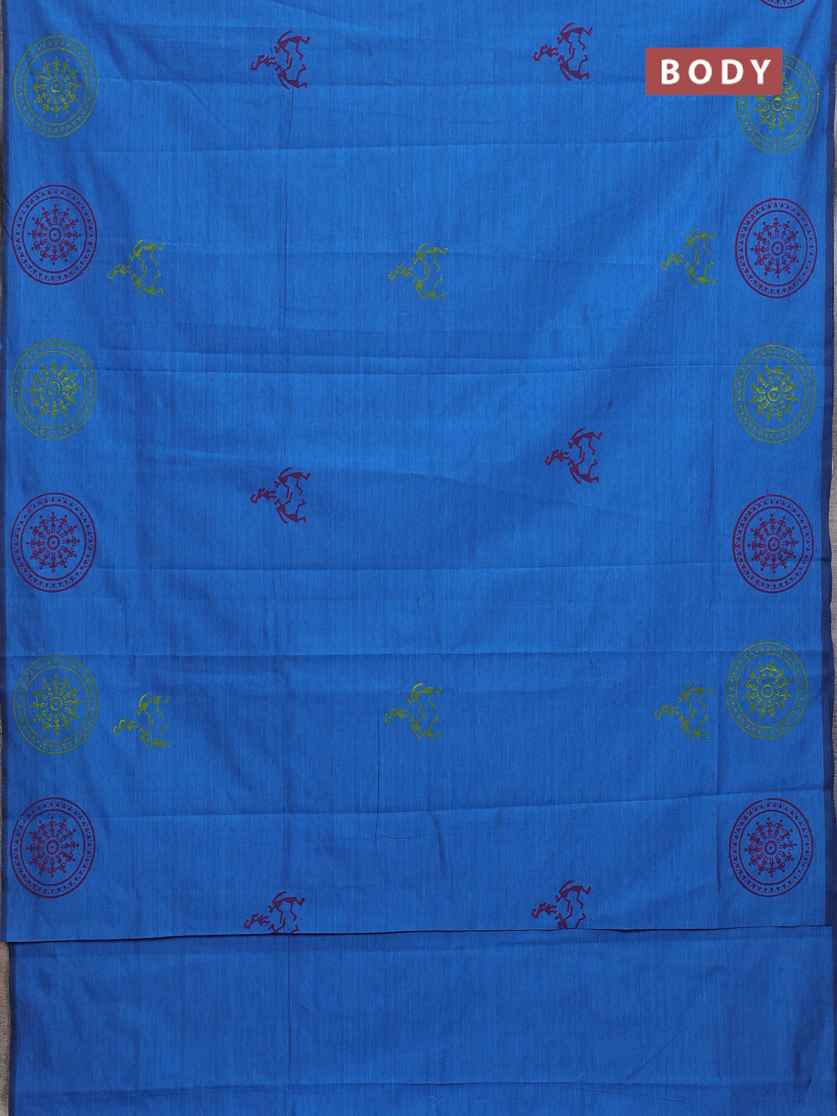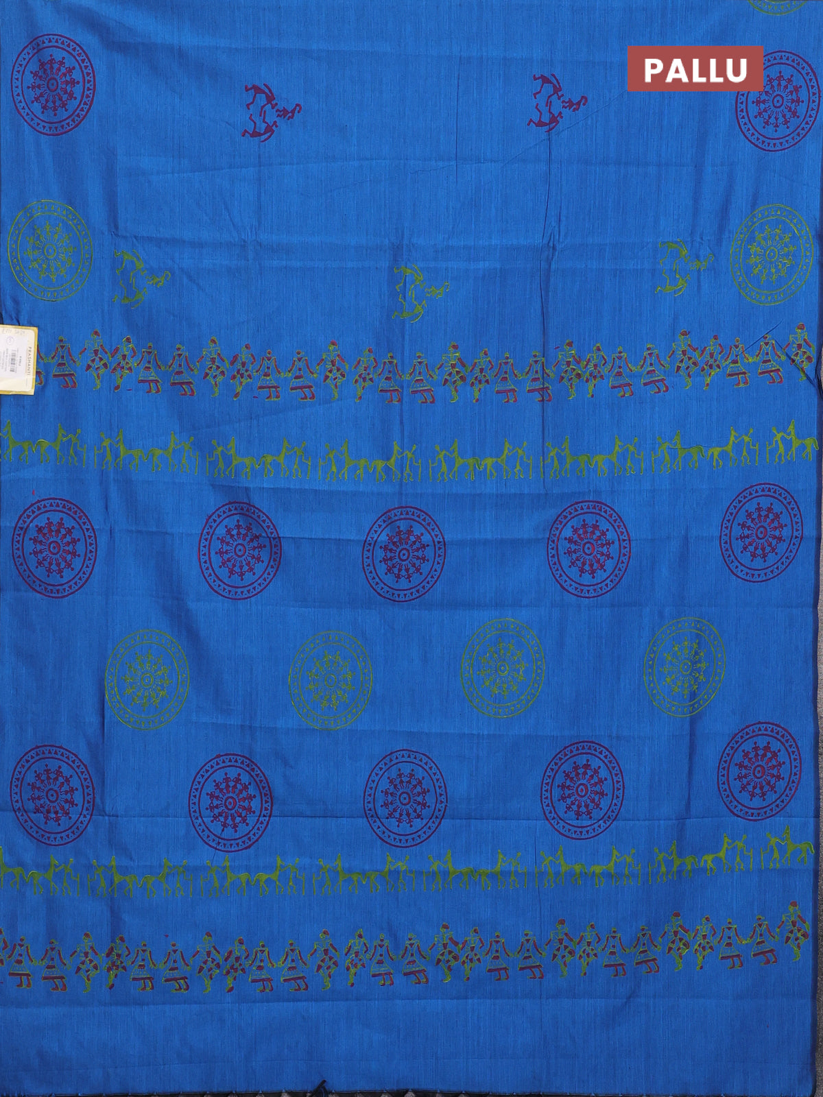 Semi silk cotton saree cs blue and pink with warli butta prints in borderless style