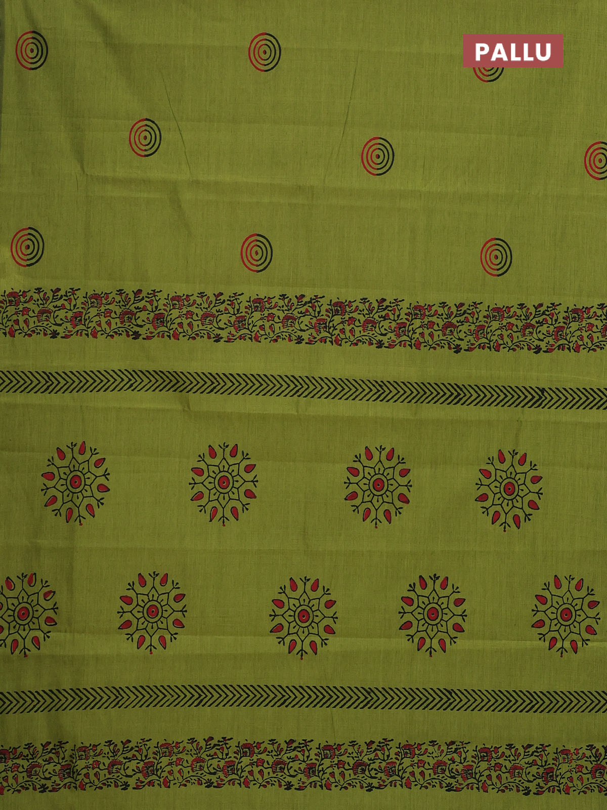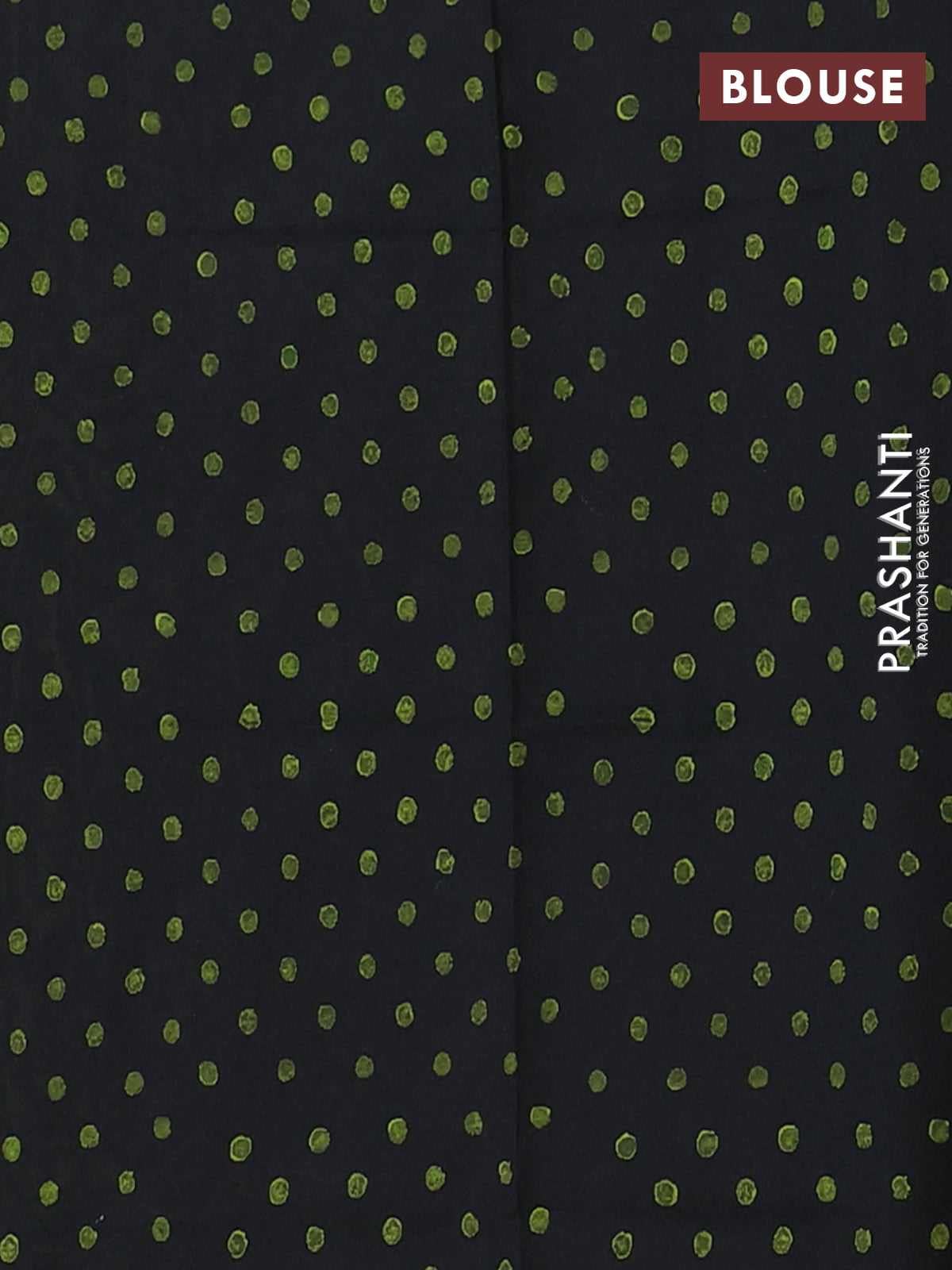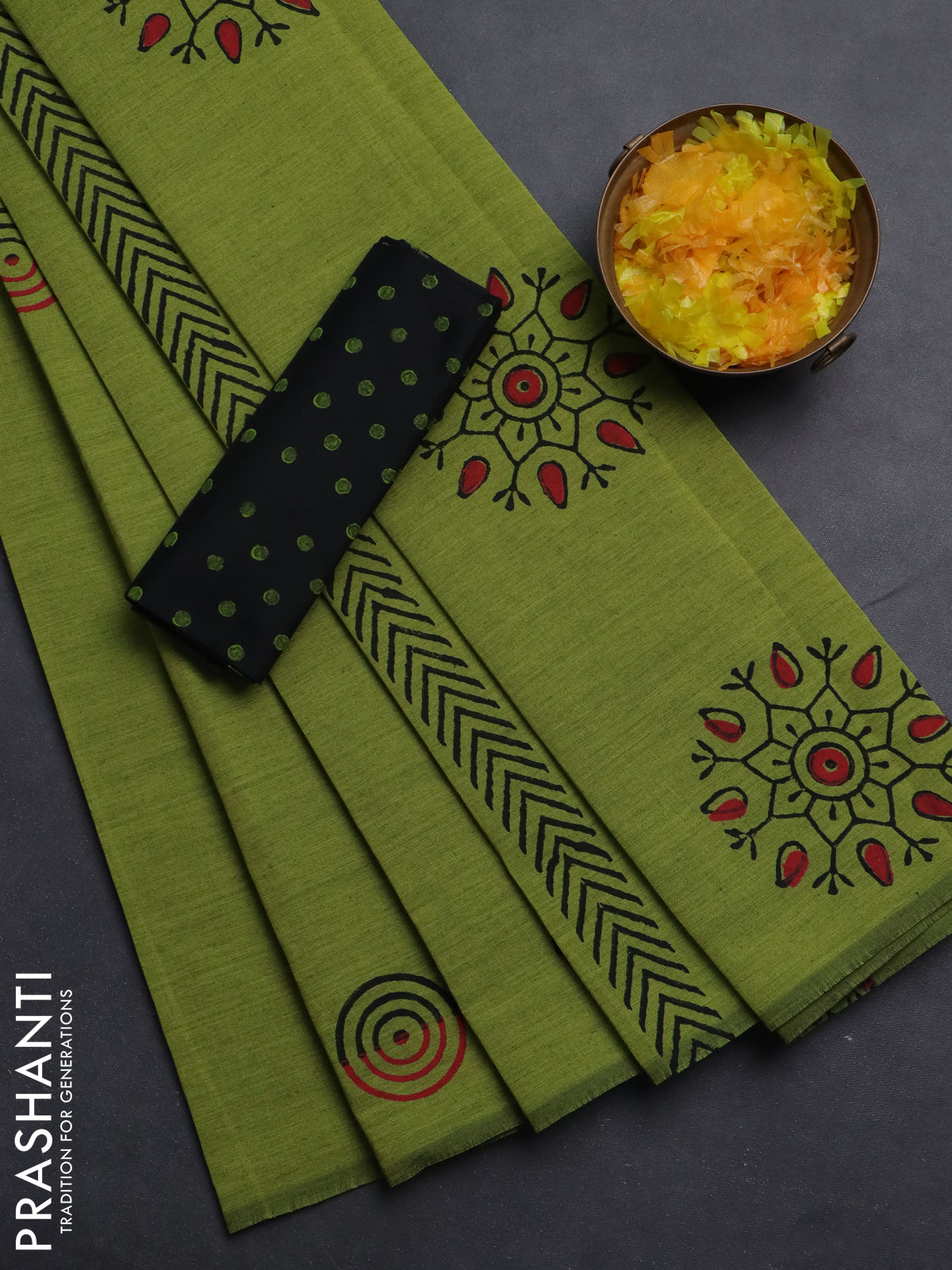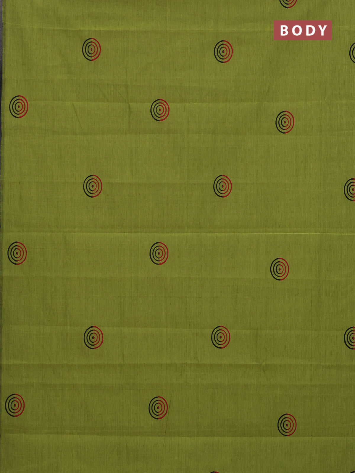 Semi silk cotton saree light green and black with butta prints in borderless style