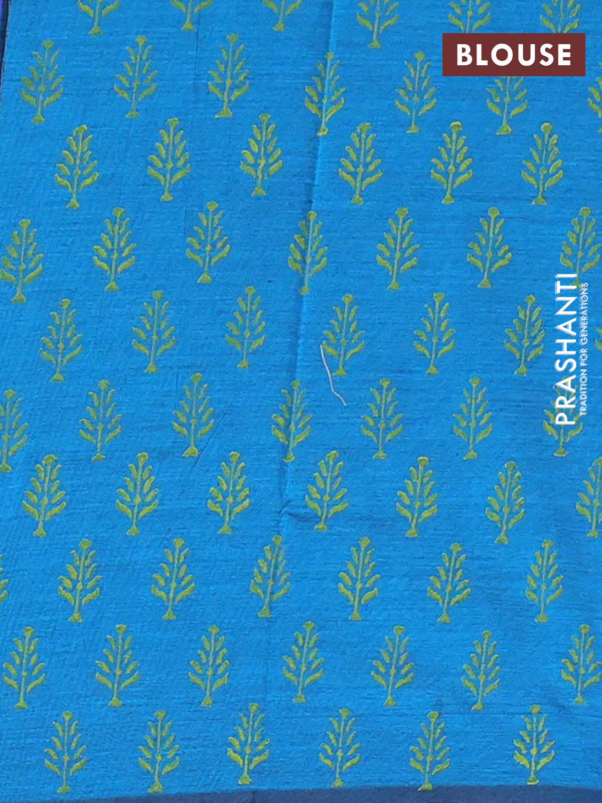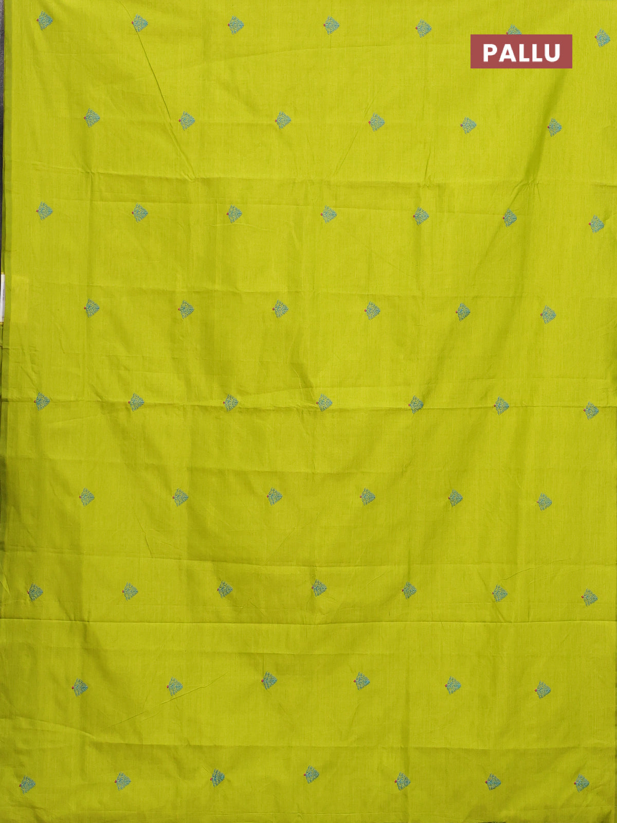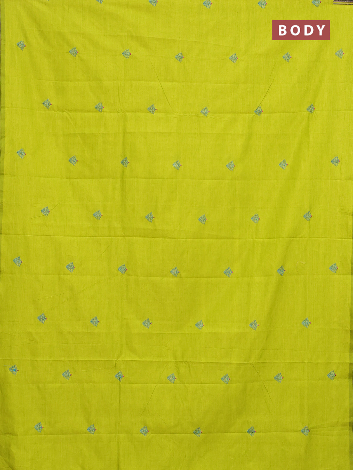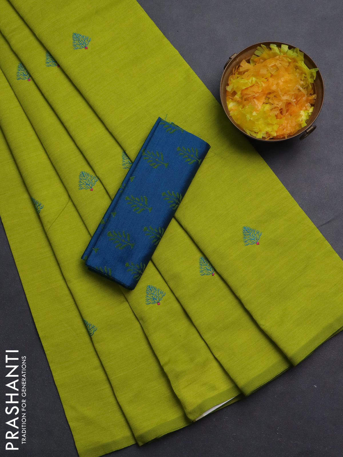 Semi silk cotton saree lime green and cs blue with embroided buttas in borderless style