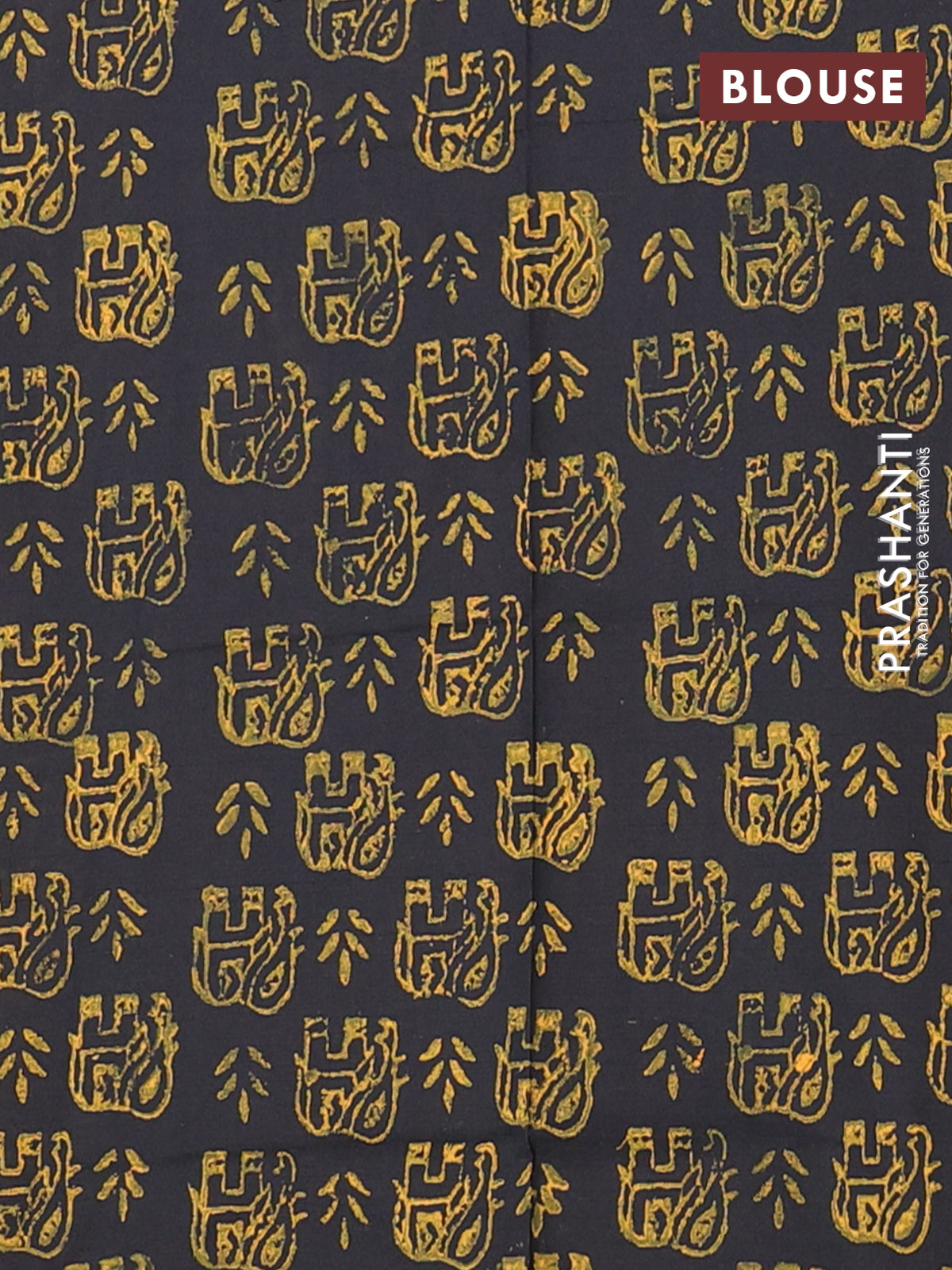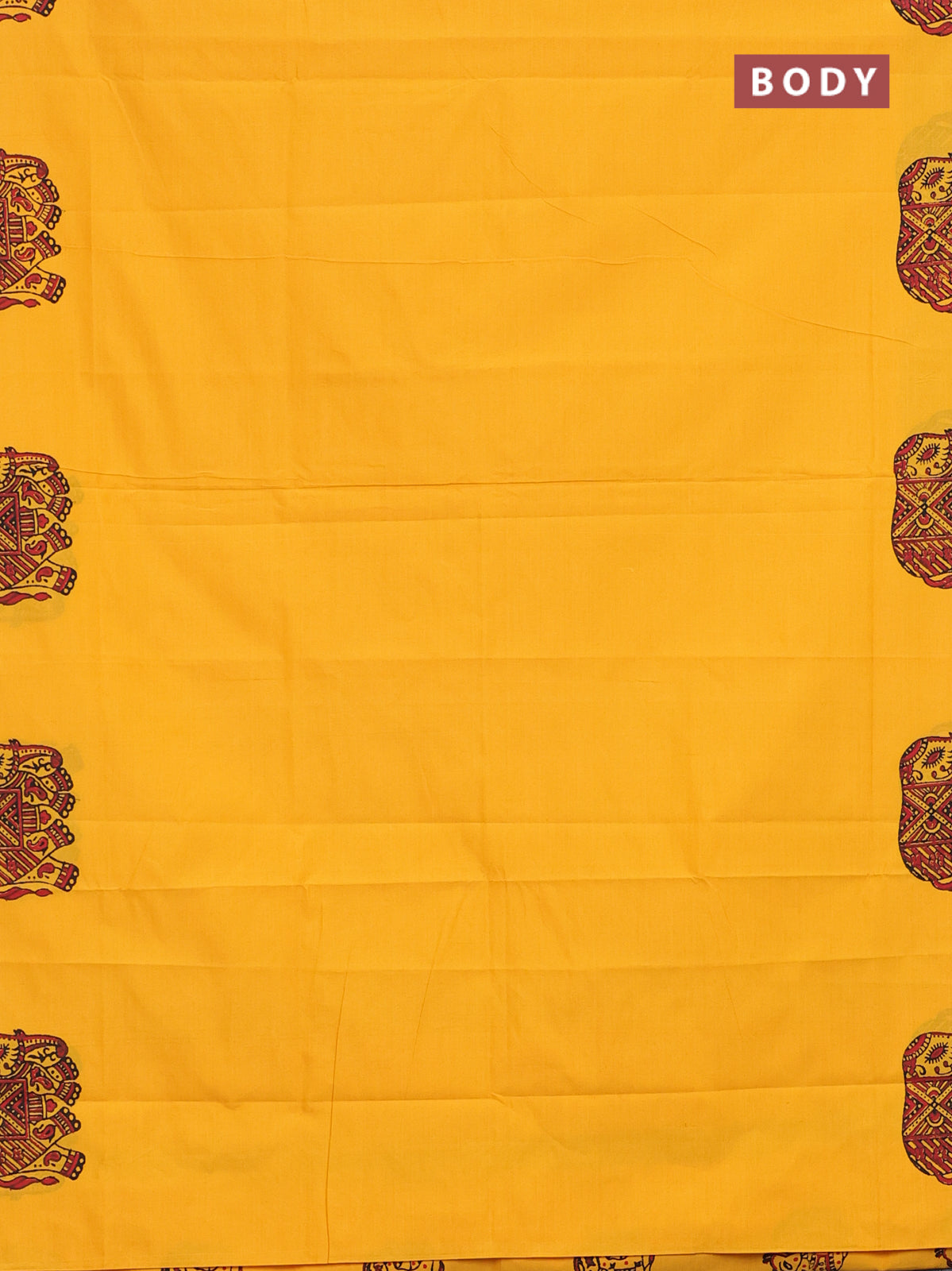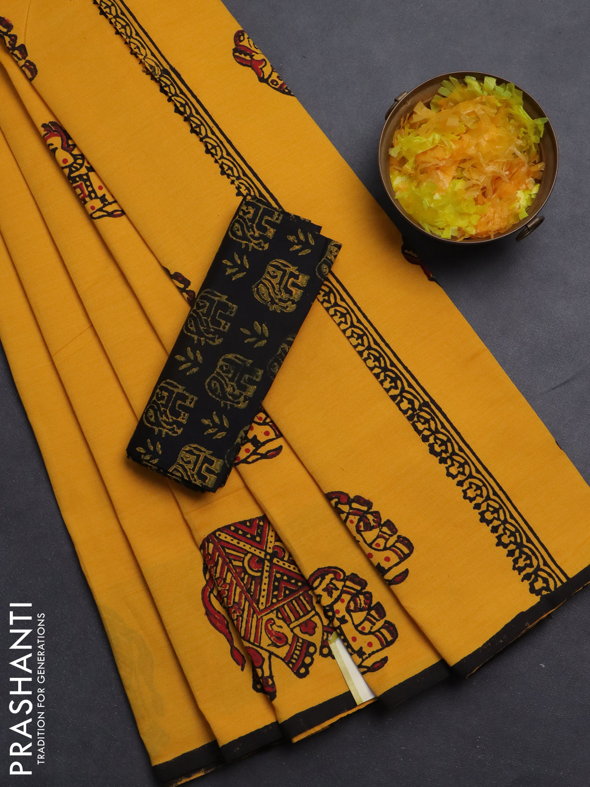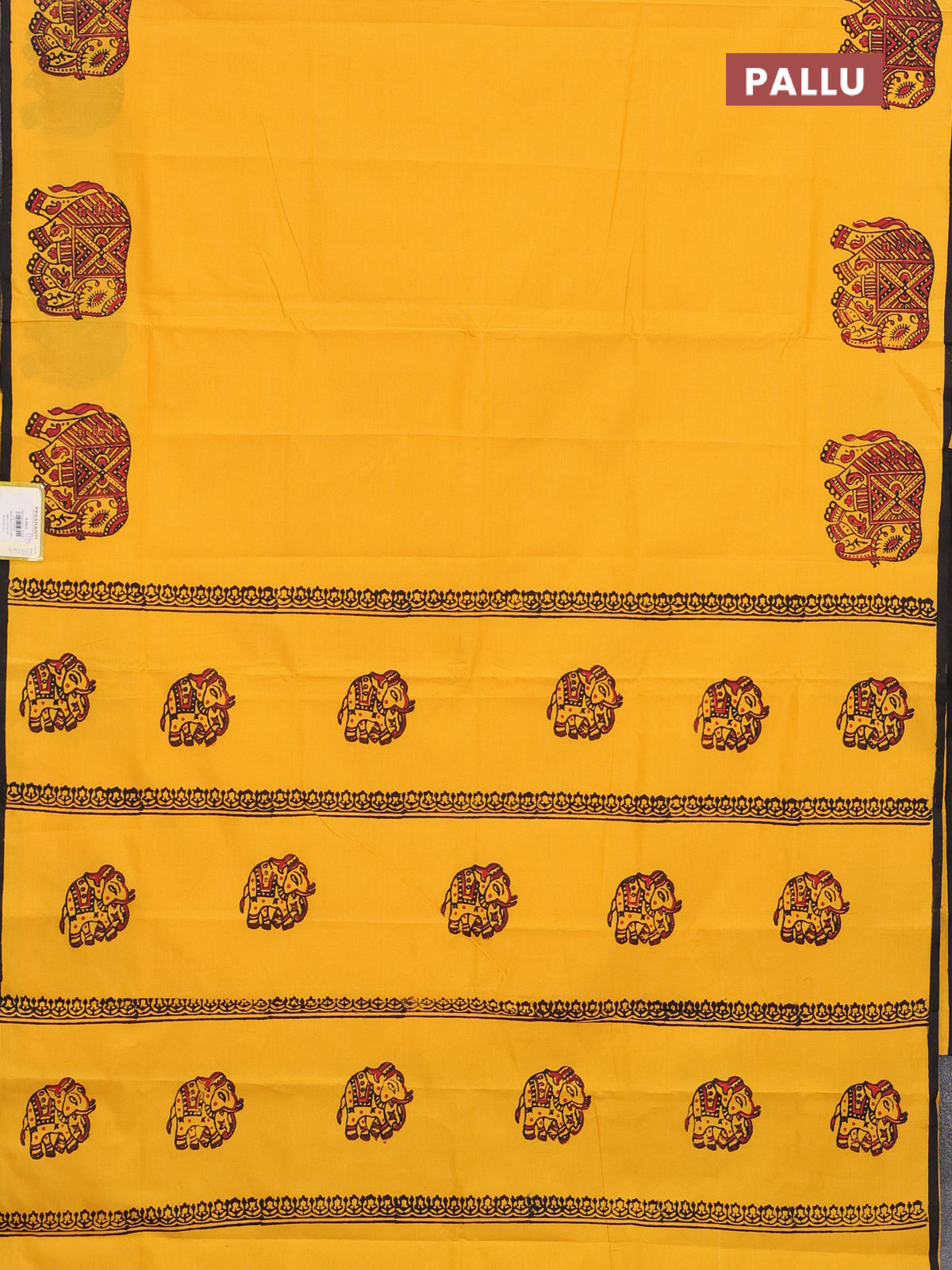 Semi silk cotton saree mango yellow and black with elephant butta prints and piping border