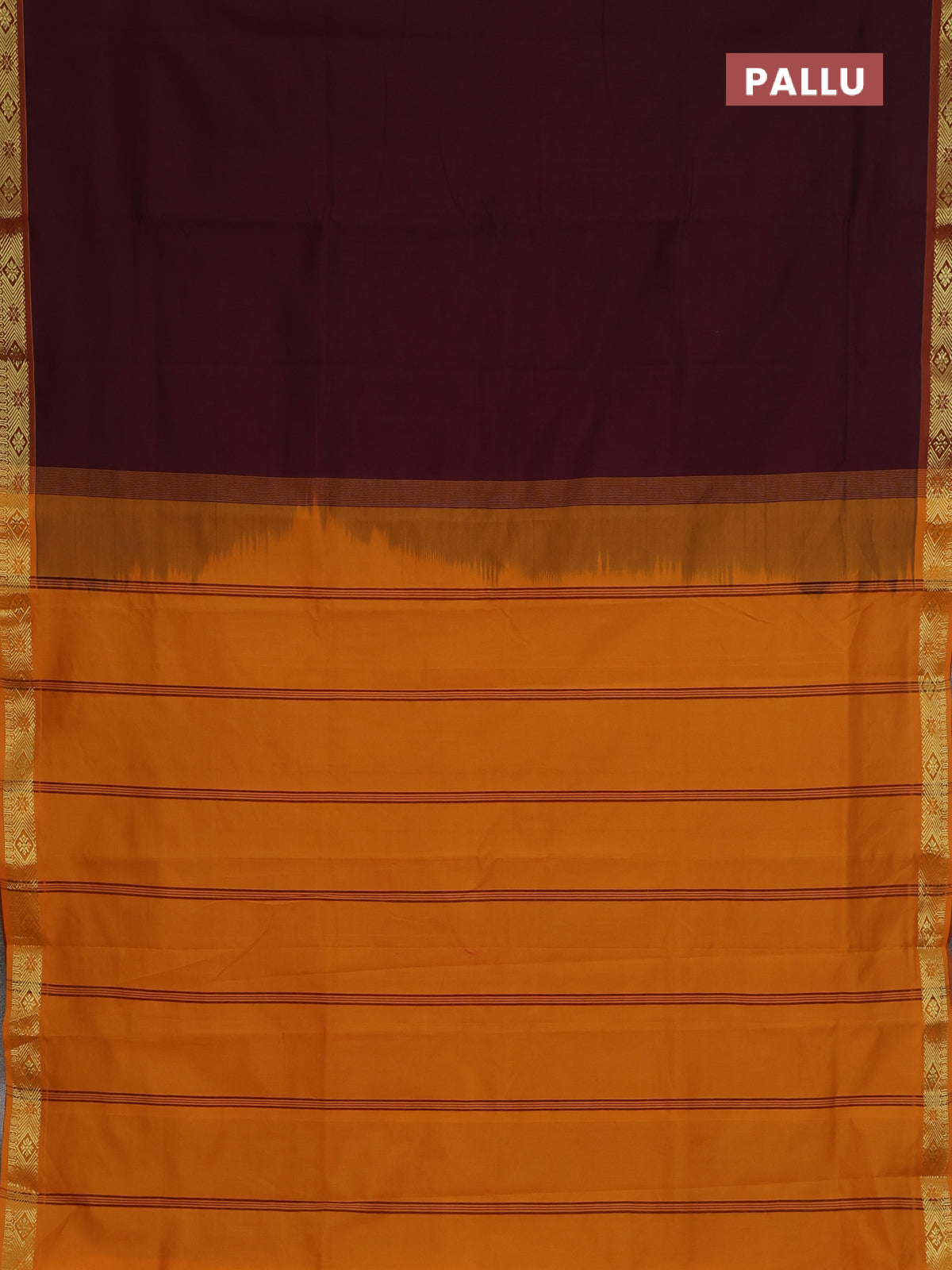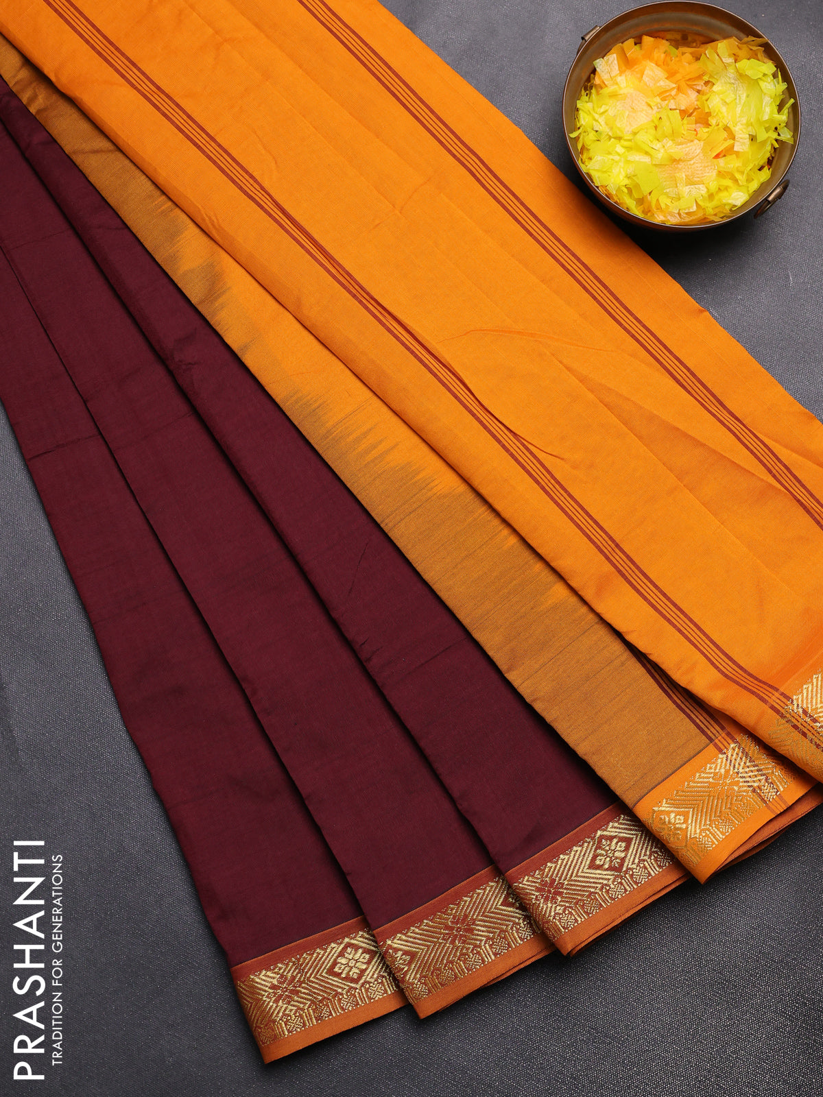 Semi silk cotton saree maroon and mango yellow with zari woven buttas and zari woven border