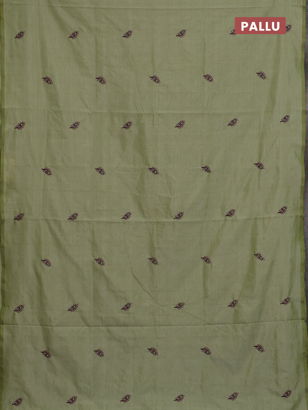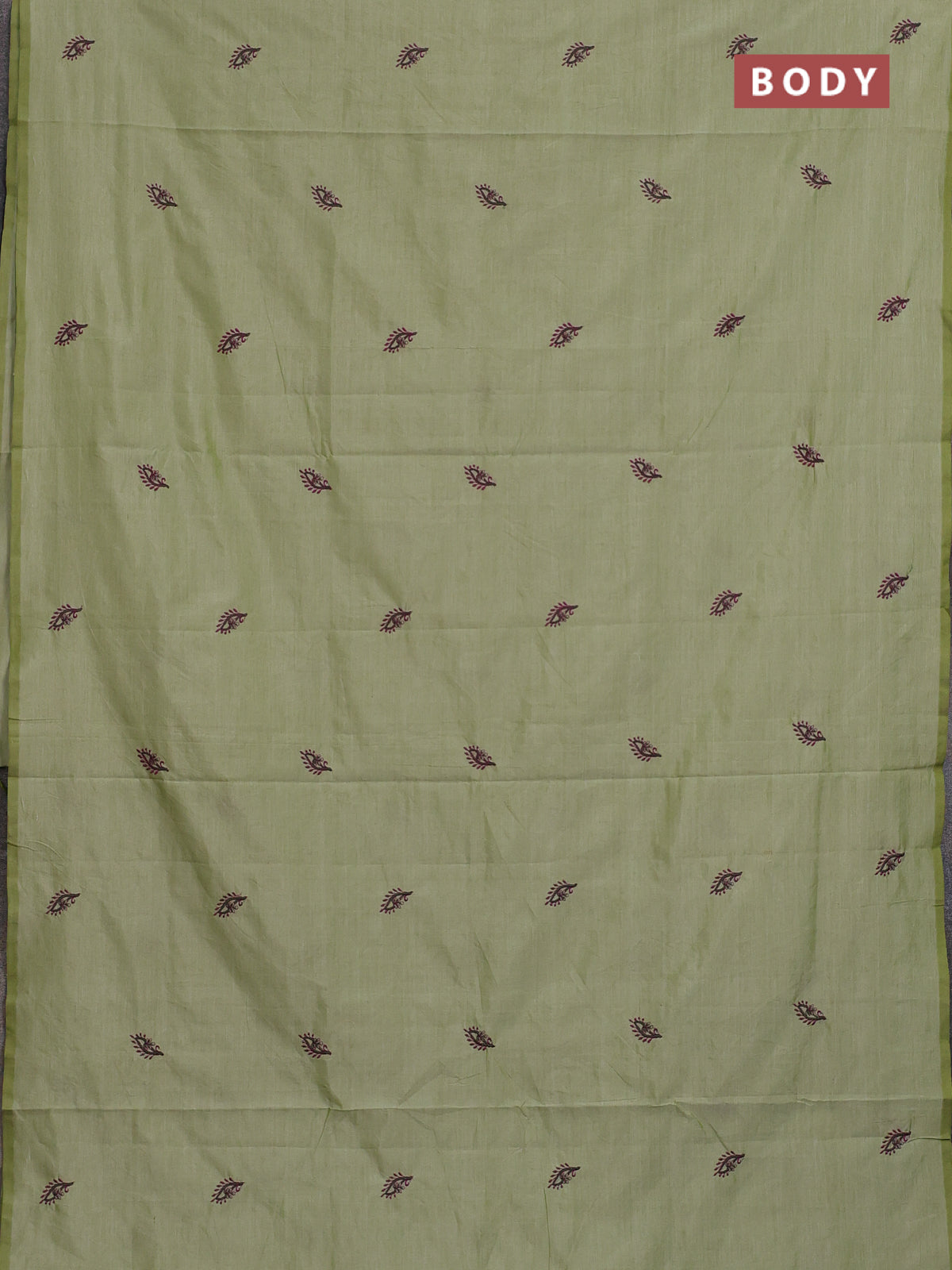 Semi silk cotton saree mild pista green and purple with embroided buttas in borderless style