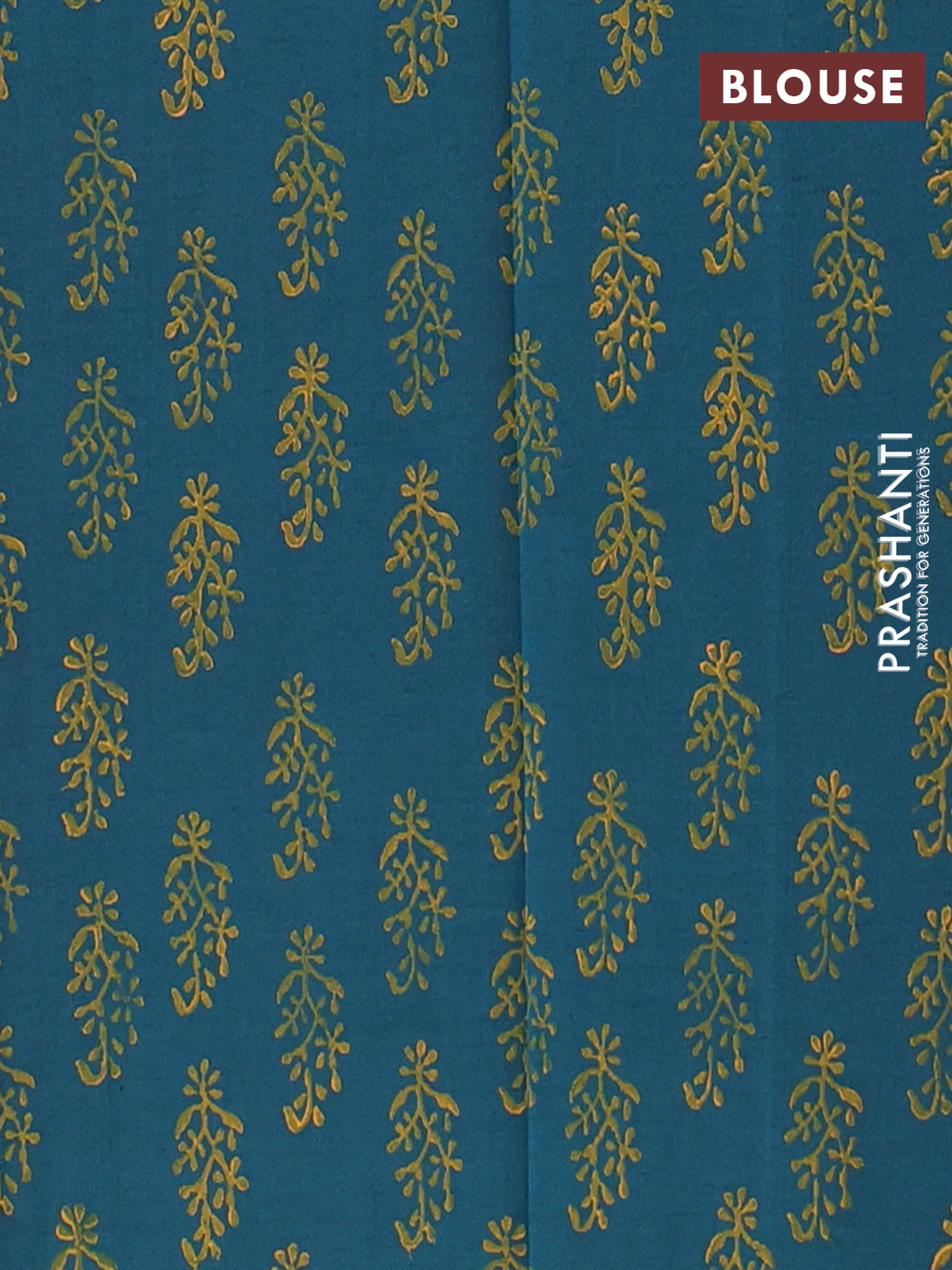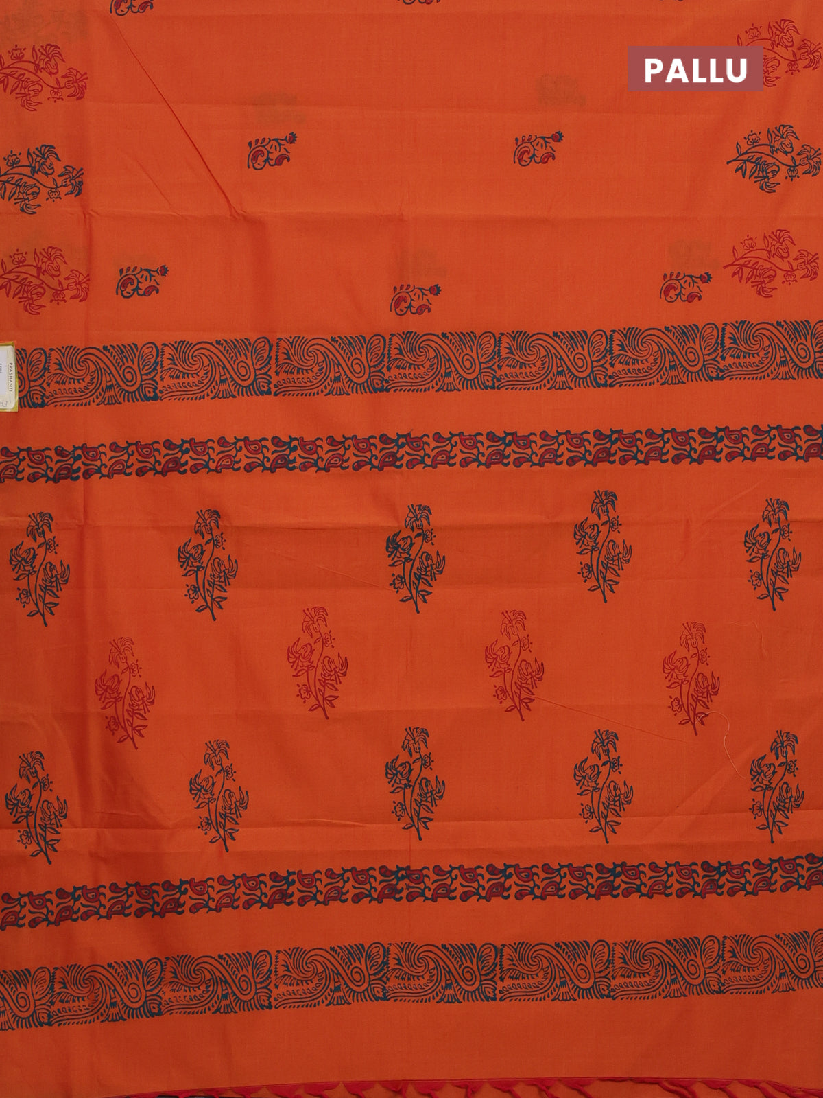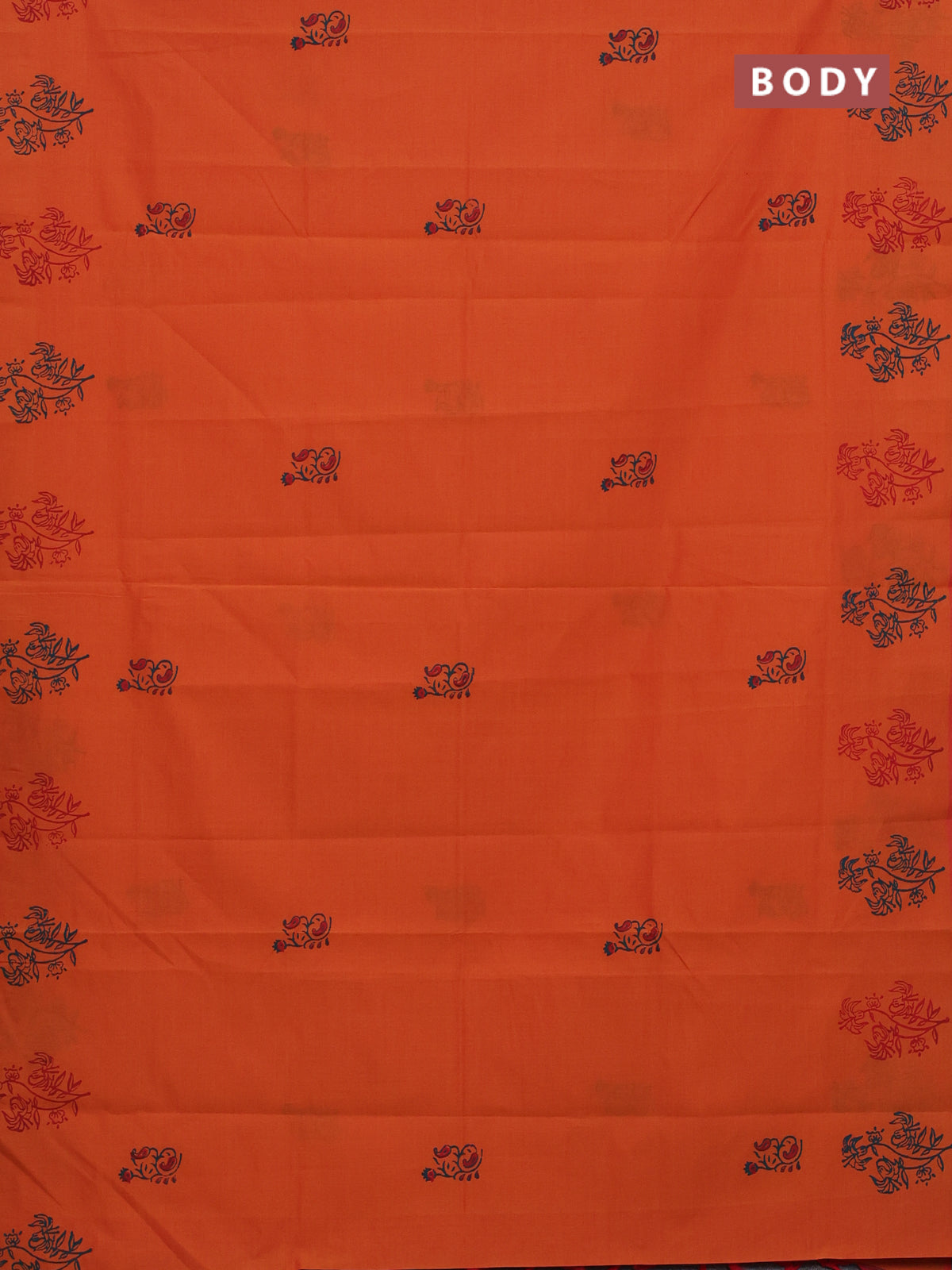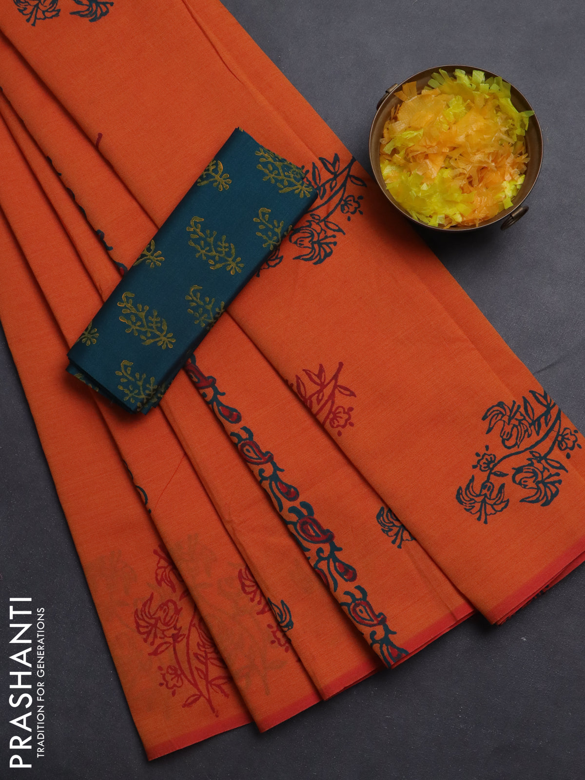 Semi silk cotton saree orange and peacock green with butta prints in borderless style