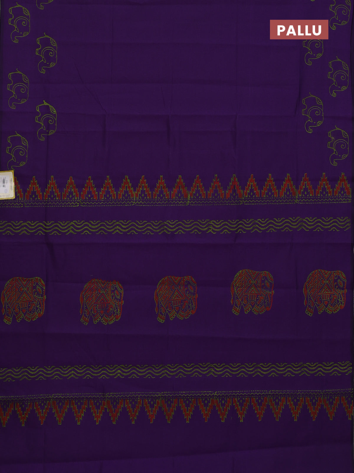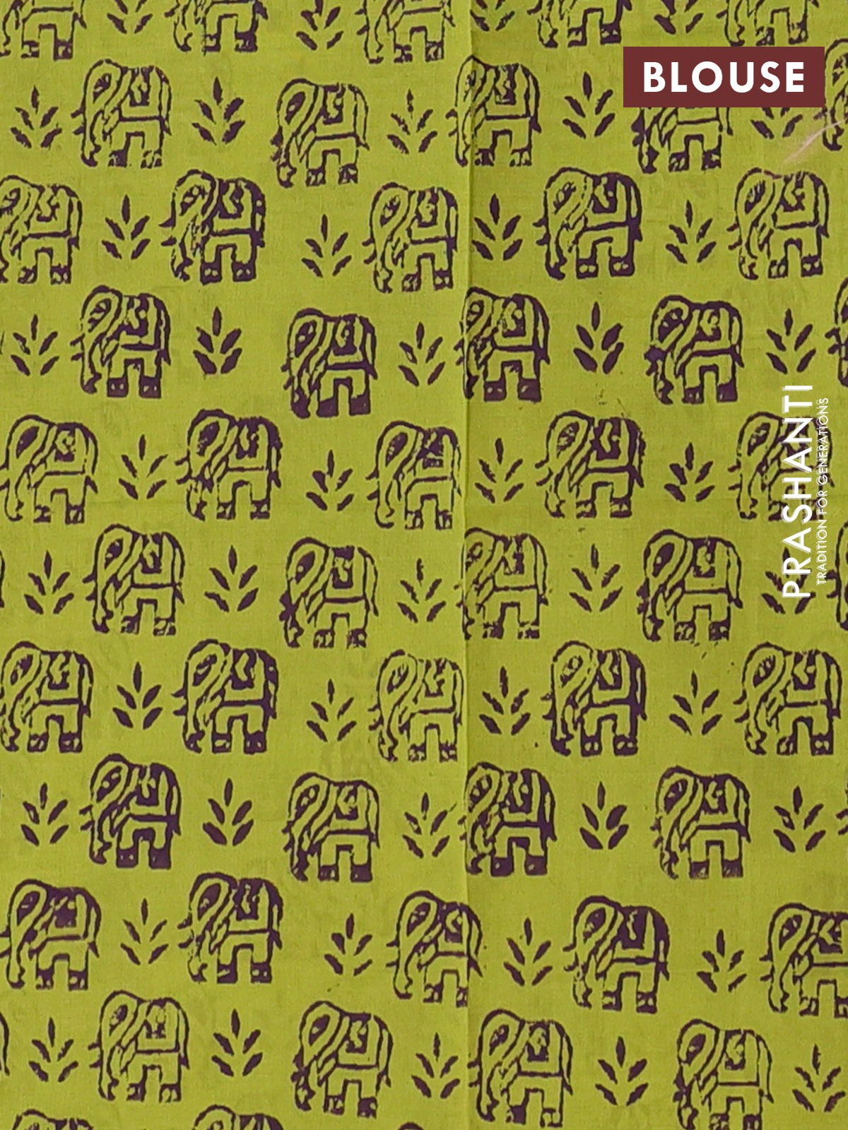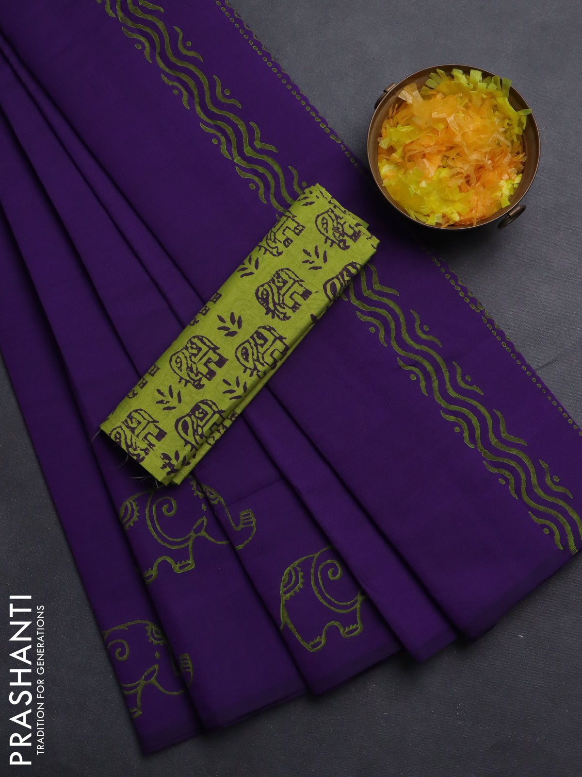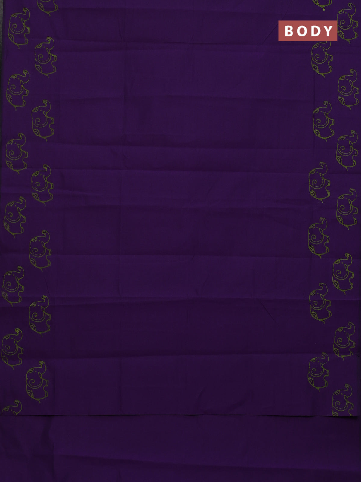 Semi silk cotton saree violet and fluorescent green with butta prints in borderless style