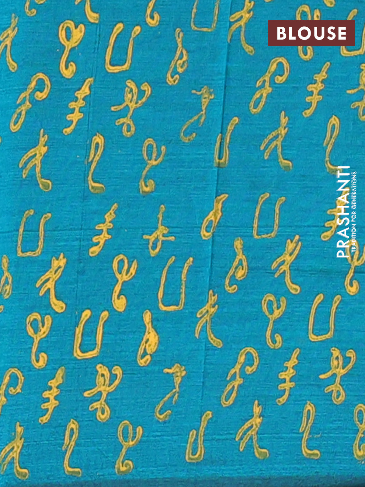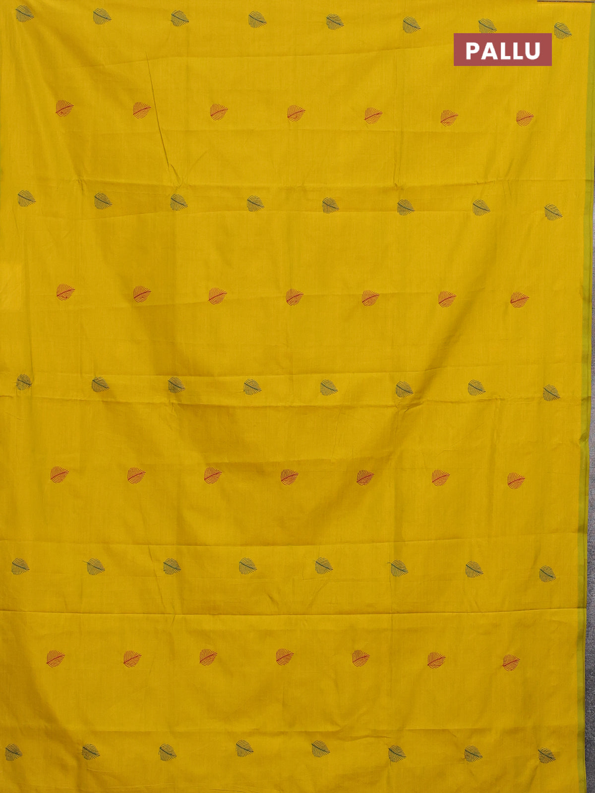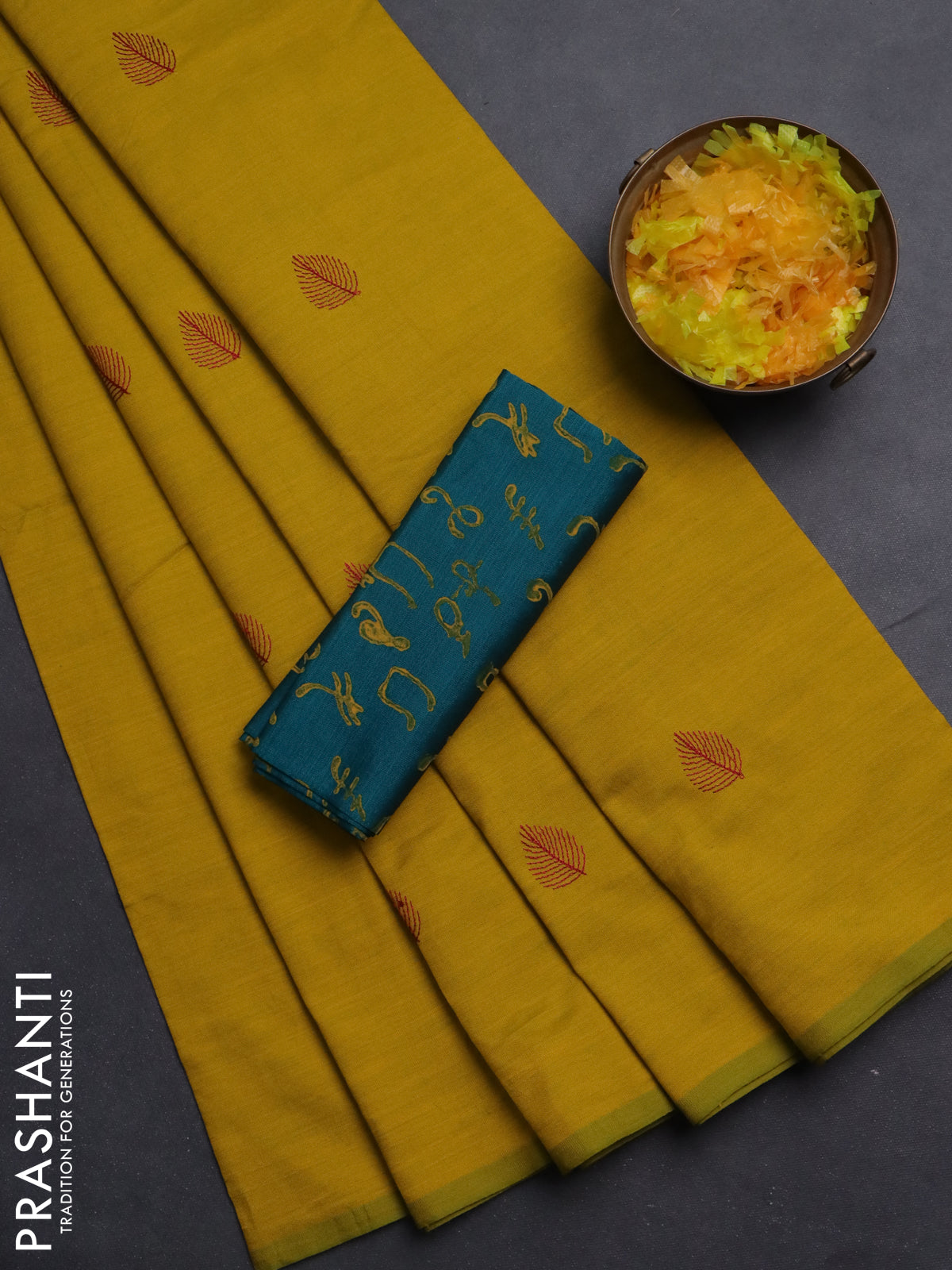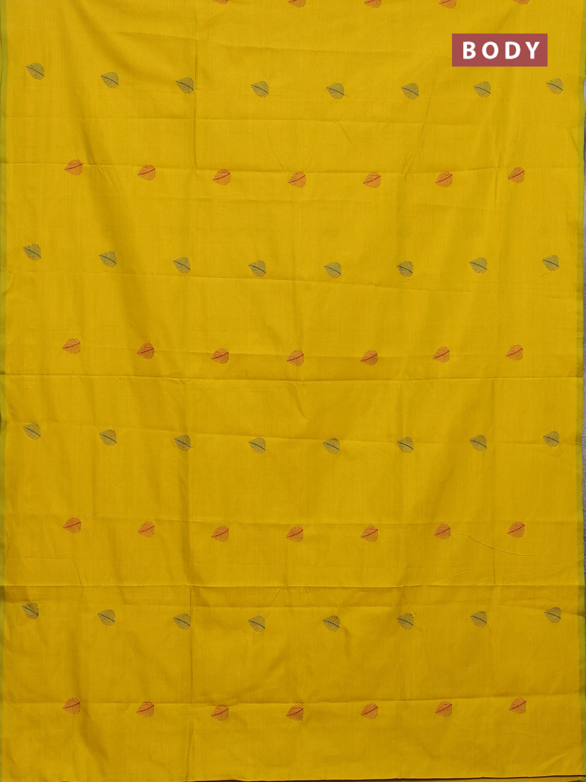 Semi silk cotton saree yellow and peacock green with embroided buttas in borderless style