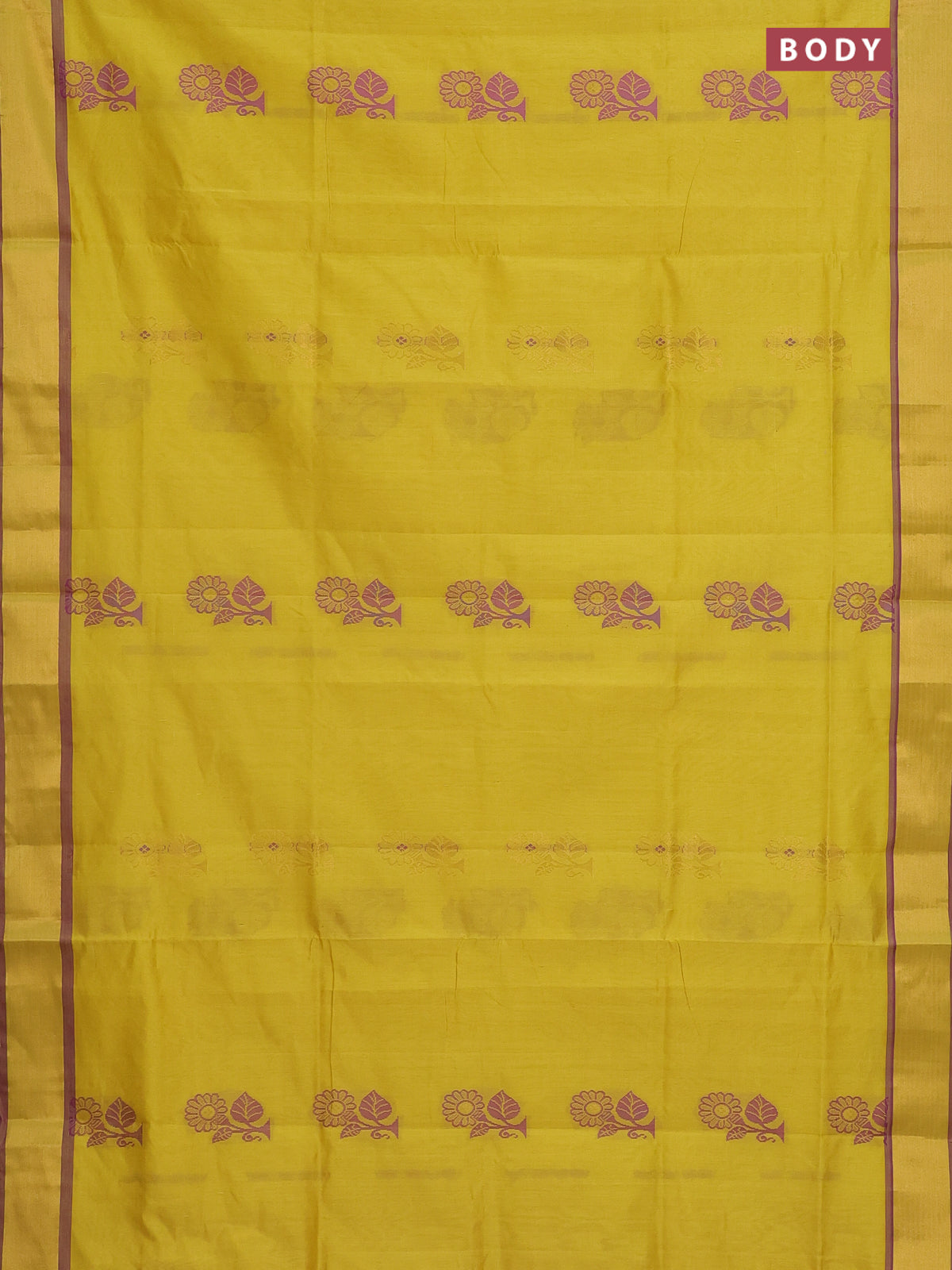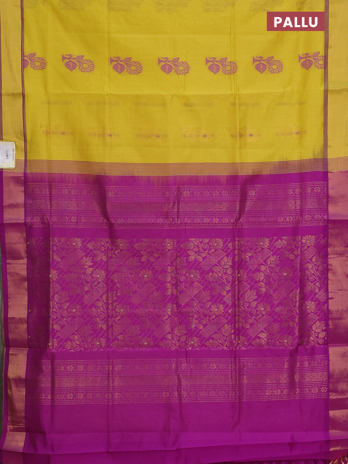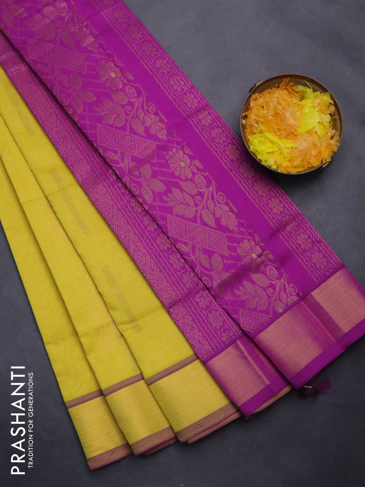 Semi silk cotton saree yellow and purple with thread & zari woven buttas and zari woven border