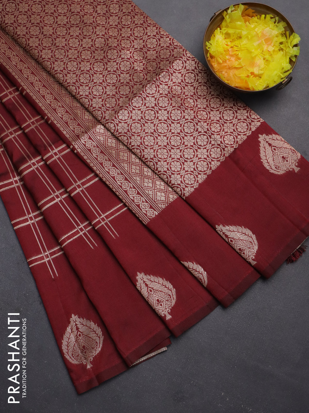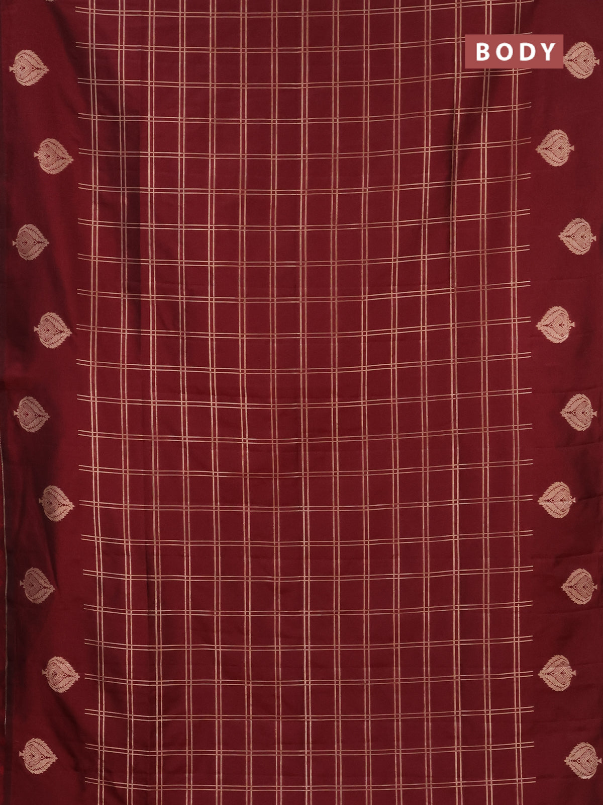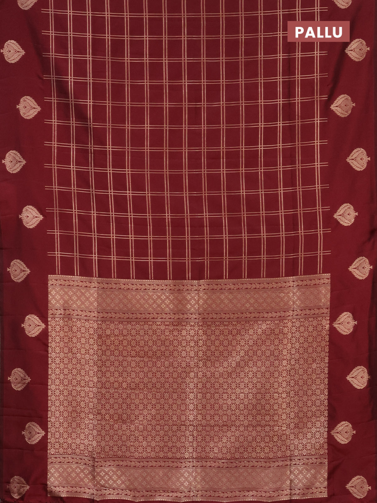 Semi soft silk saree maroon with allover zari checked pattern and zari woven butta border