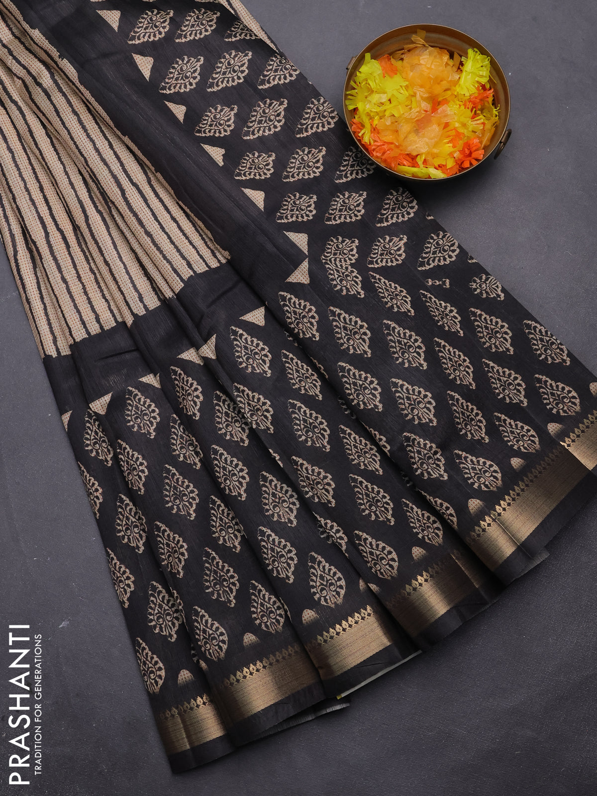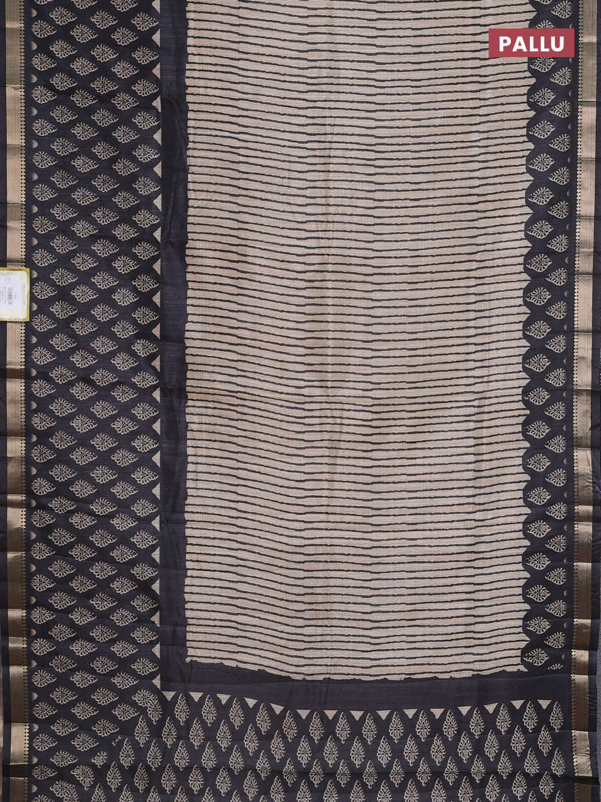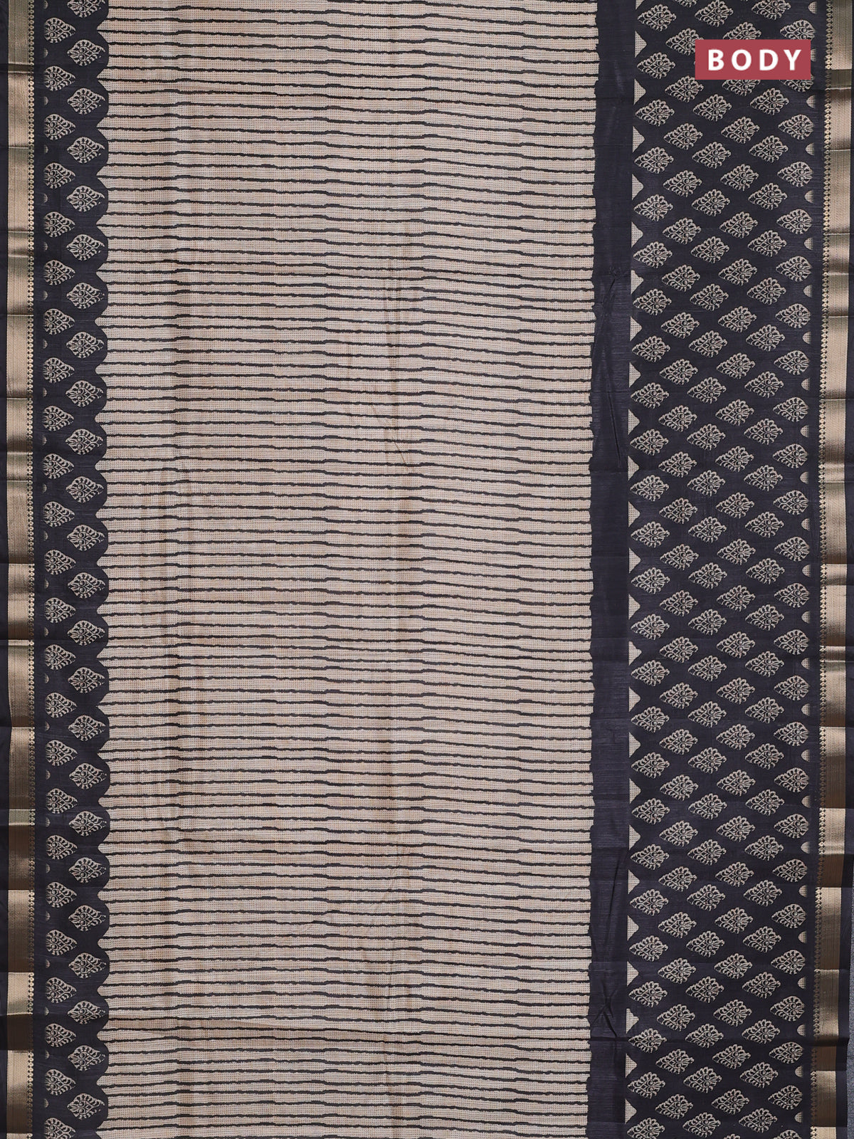 Semi tussar saree beige and black with stripes pattern and zari woven border