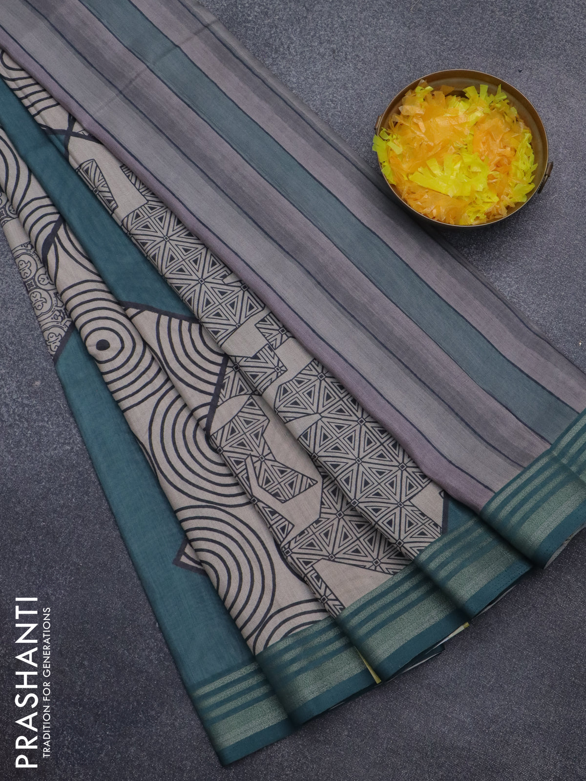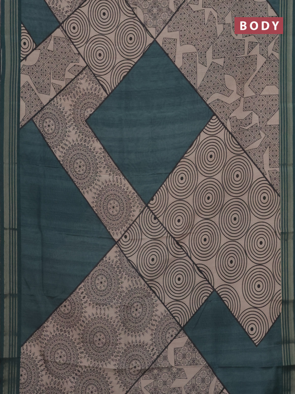 Semi tussar saree beige and teal green with allover geometric prints and zari woven border