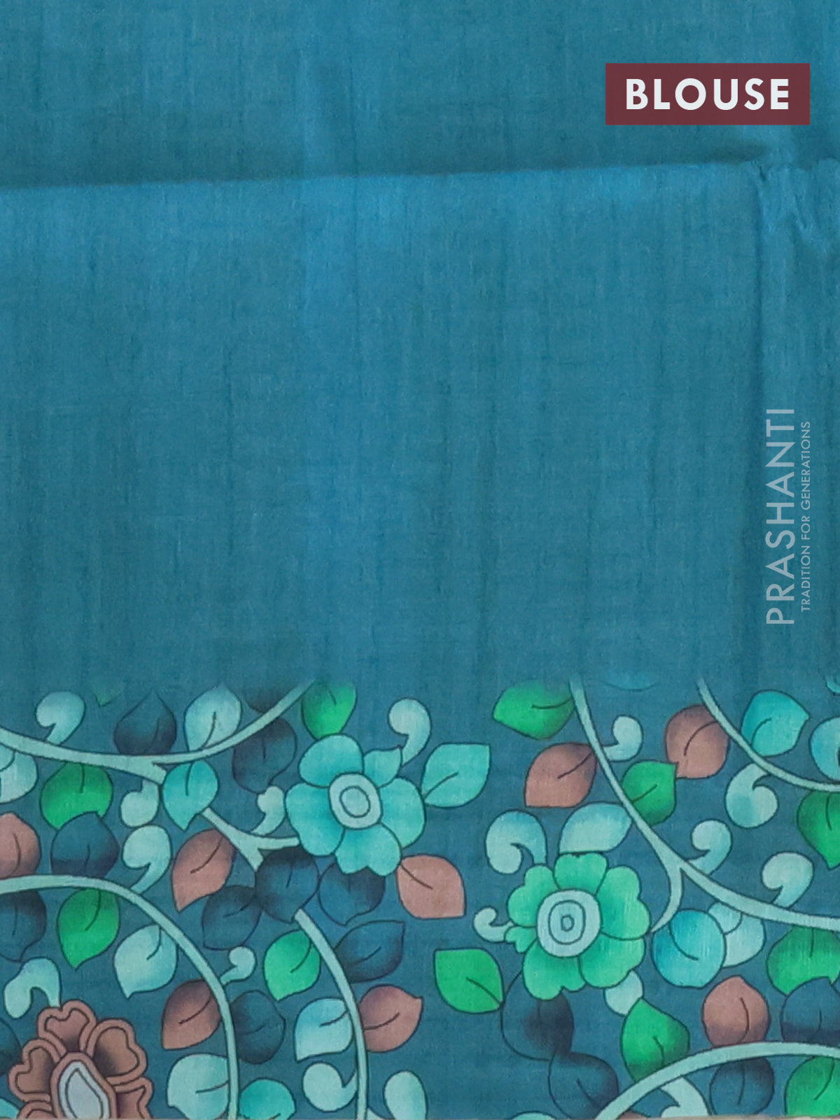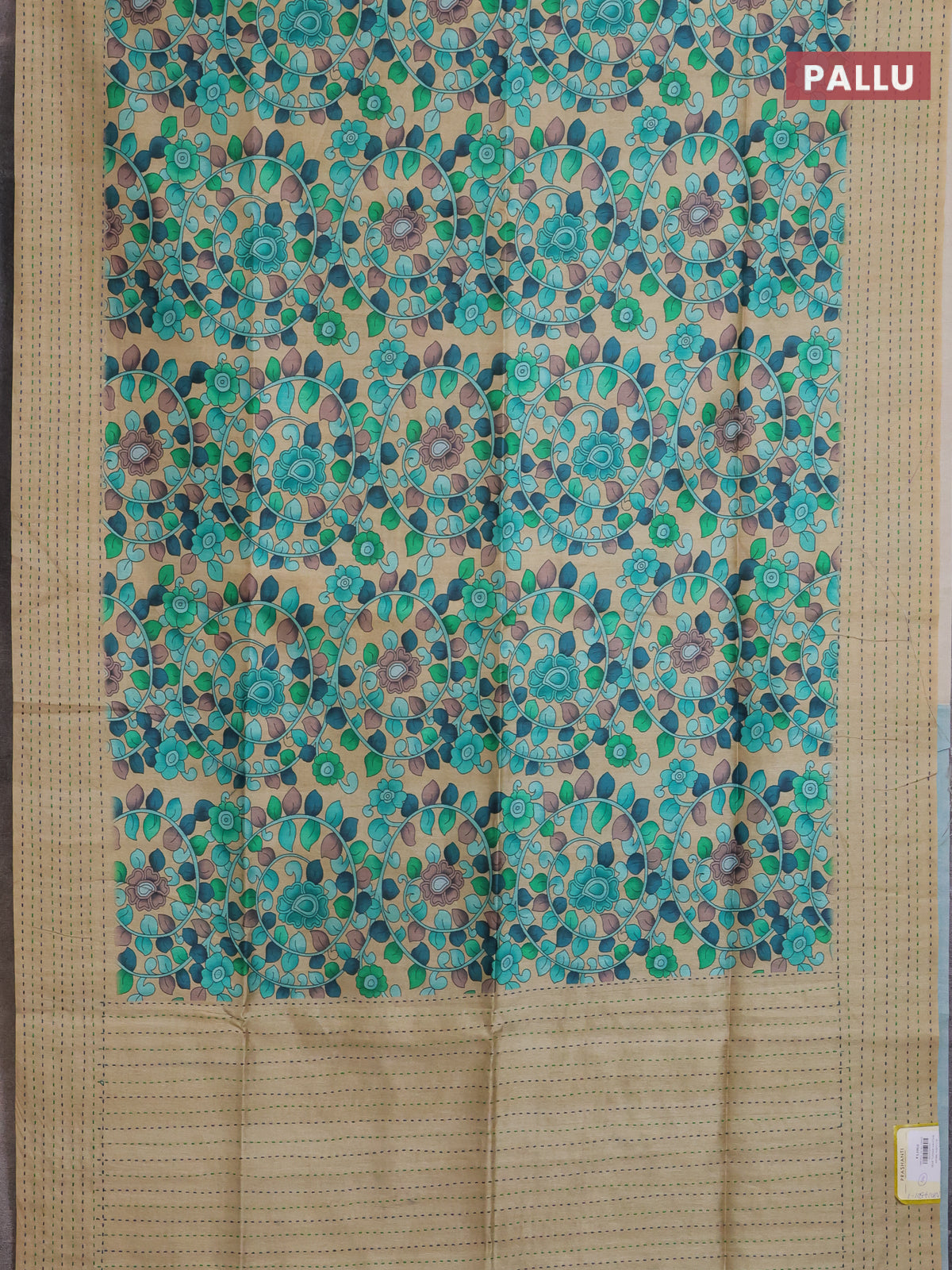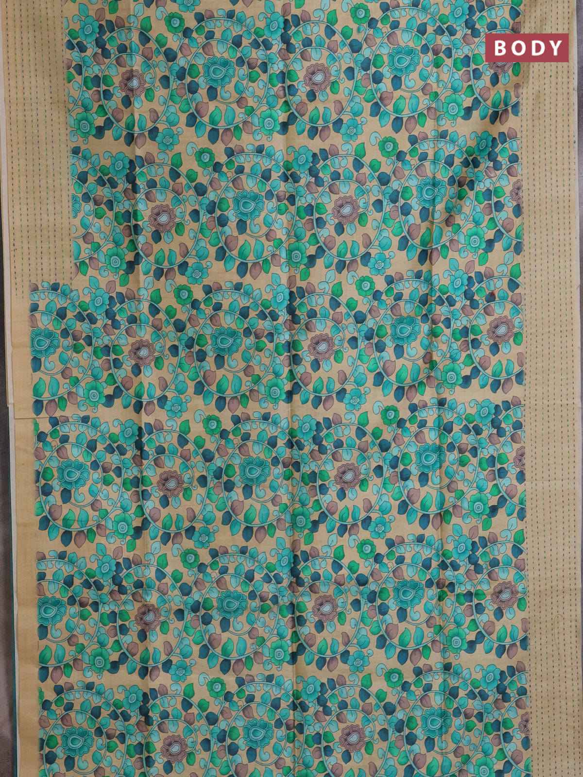 Semi tussar saree beige and teal green with allover kalamkari prints and katha stitch work pallu & border