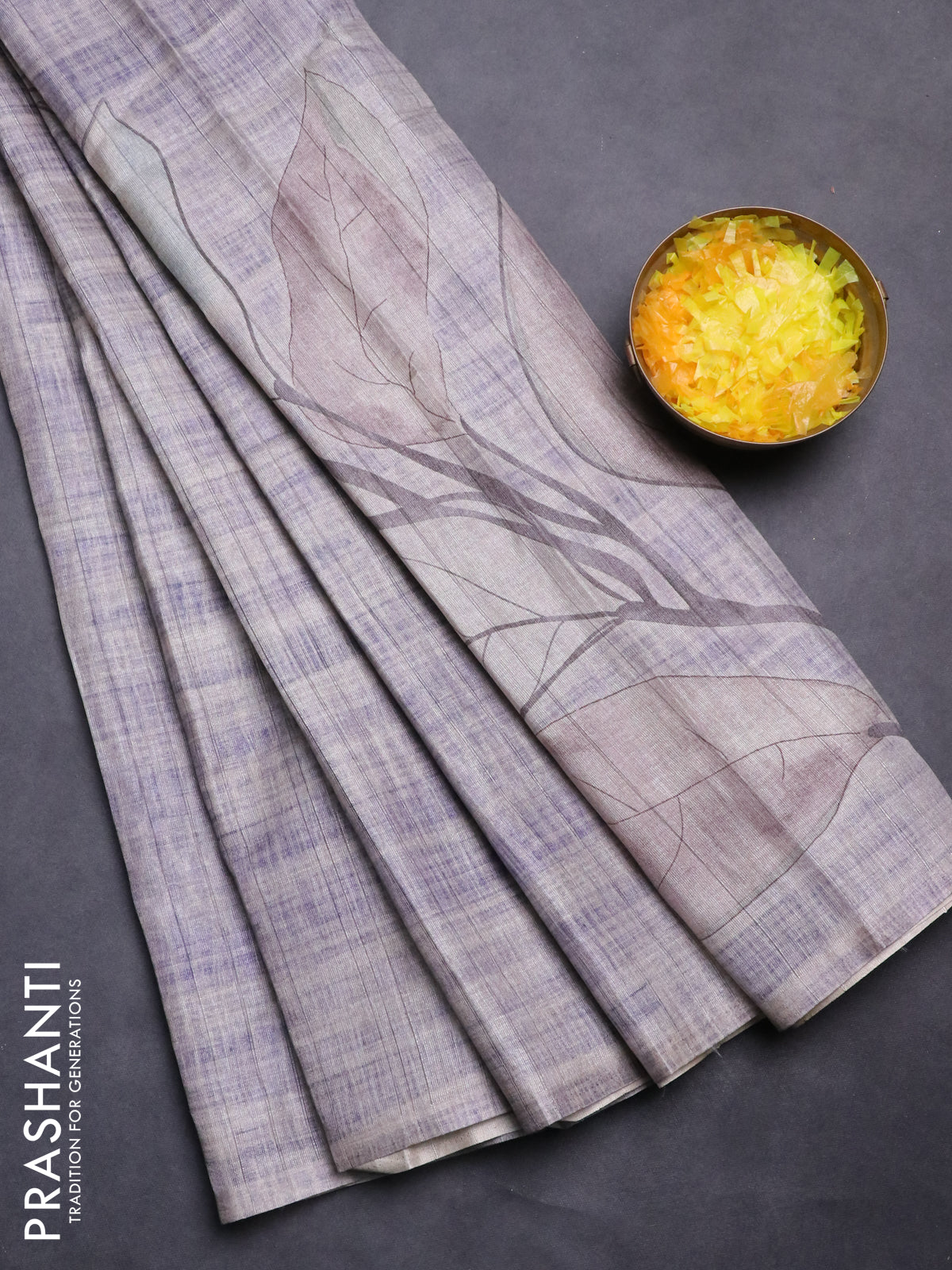 Semi tussar saree beige and violet shade with digital prints in borderless style