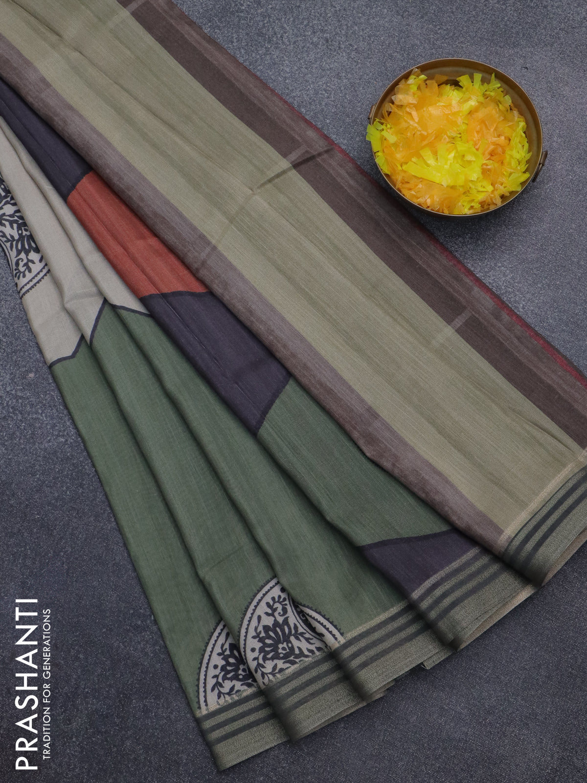 Semi tussar saree beige grey and sap green with allover prints and zari woven border