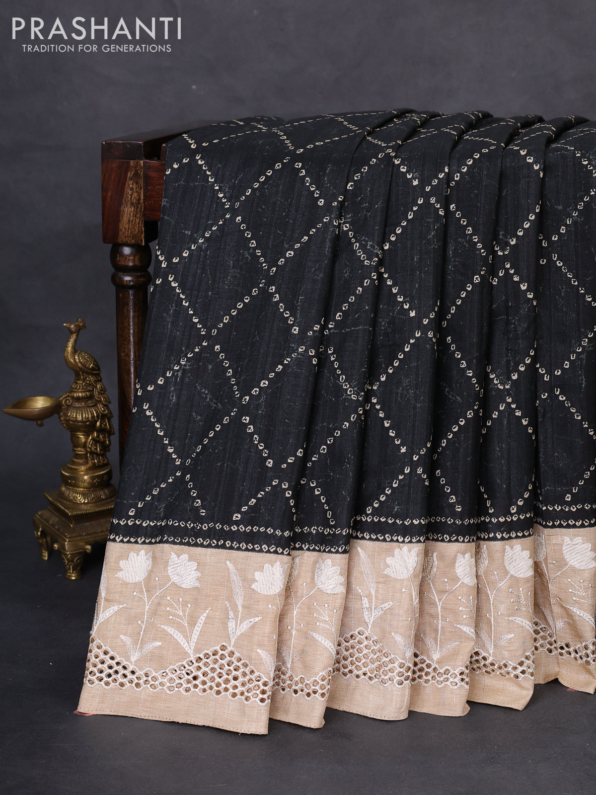 Semi tussar saree black and beige with allover bandhani prints and embroidery cut work border