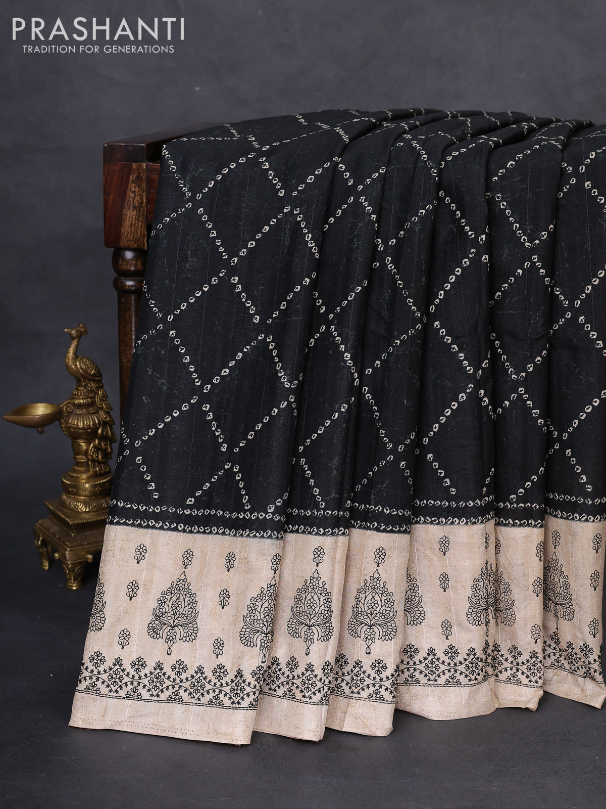 Semi tussar saree black and beige with allover bandhani prints and embroidery work border