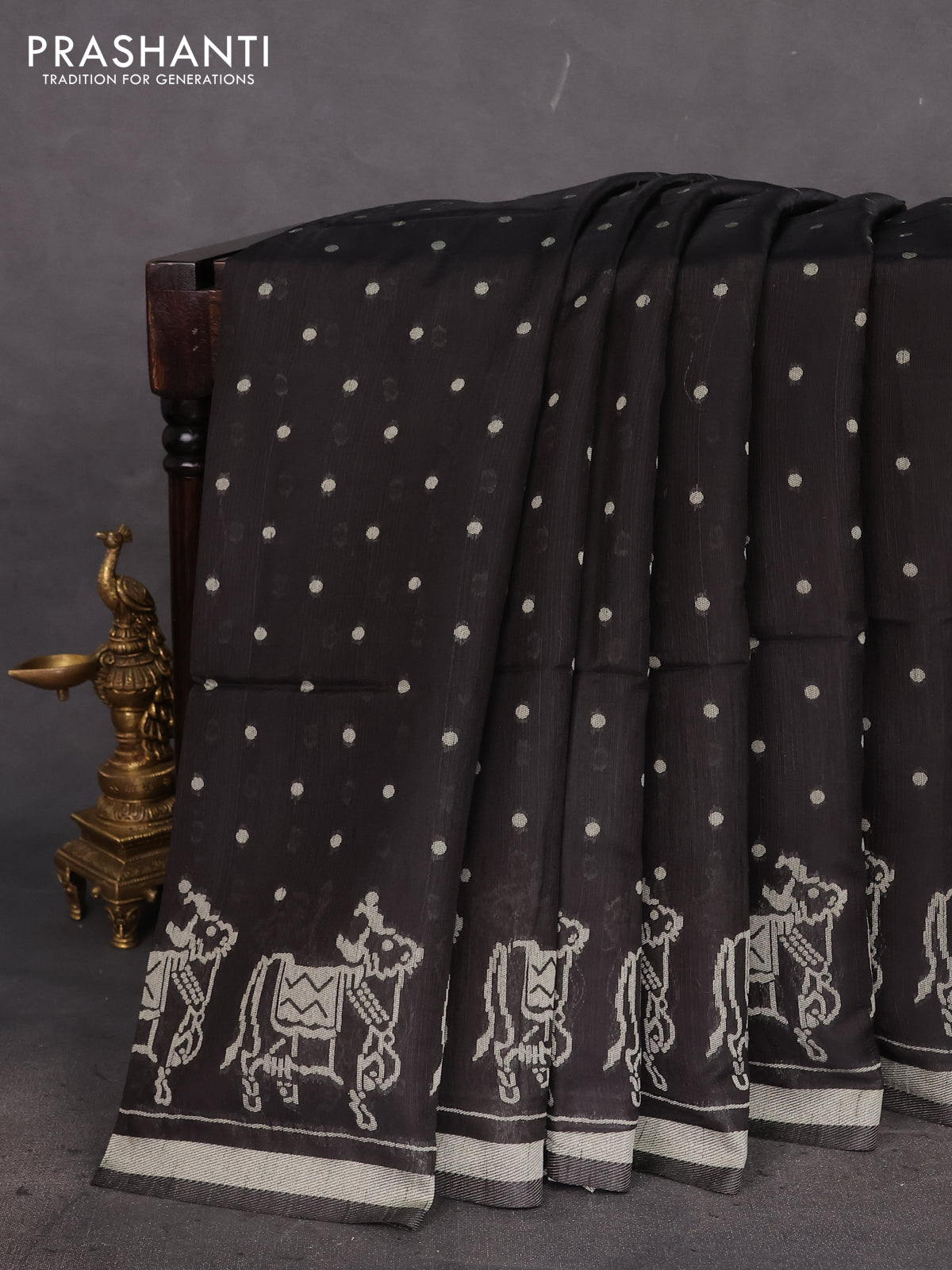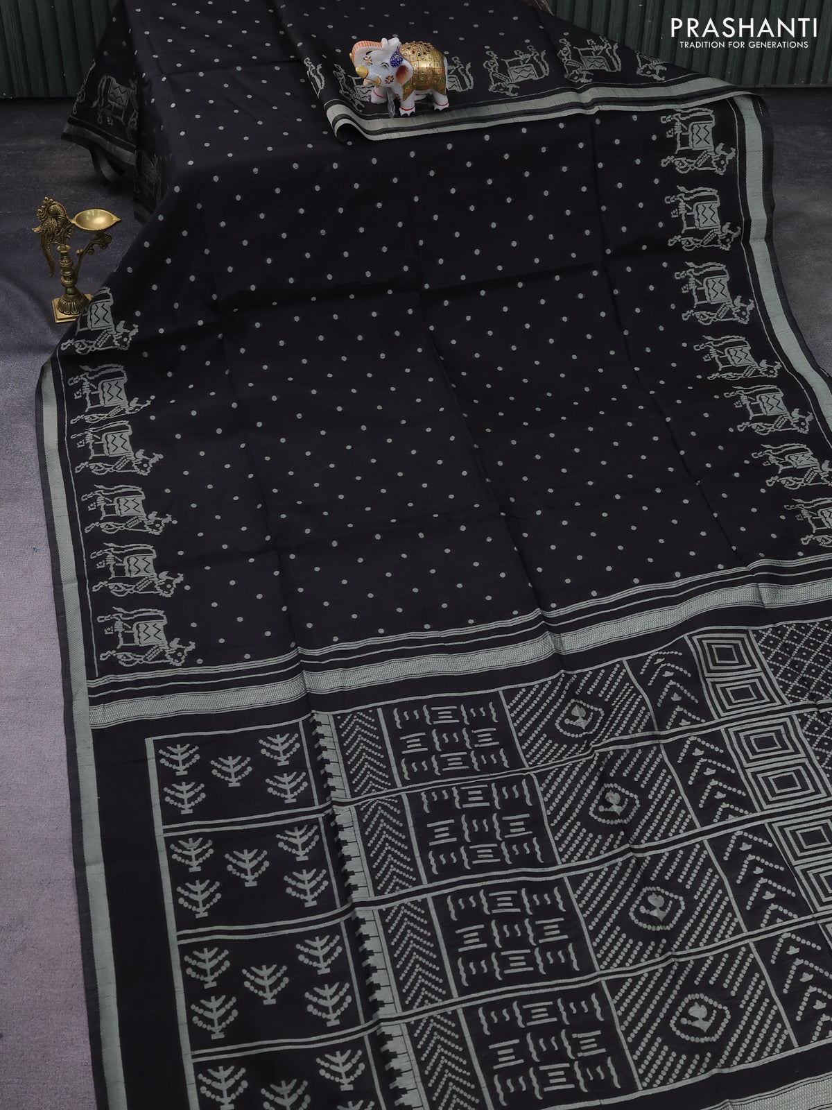 Semi tussar saree black with allover polka dot weaves and patola weaving pallu