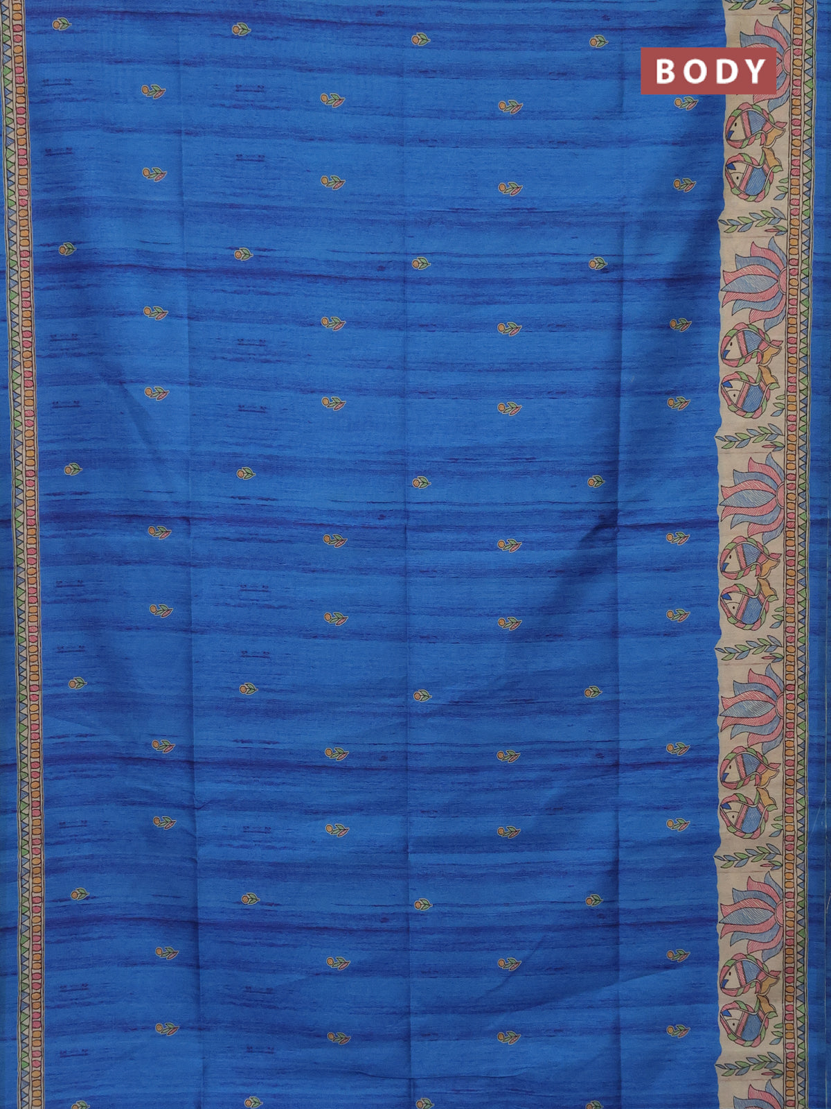 Semi tussar saree blue and beige with butta prints and madhubani printed pallu