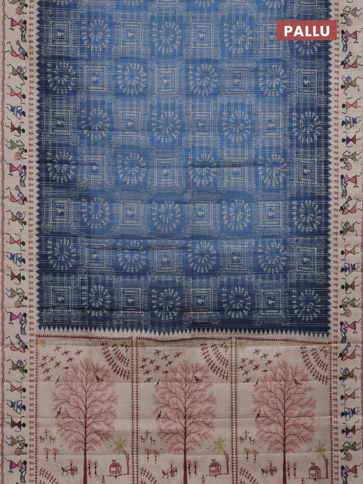 Semi tussar saree blue and cream with allover zari checks & warli prints and printed border