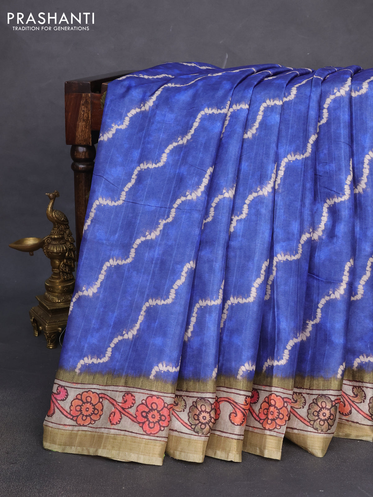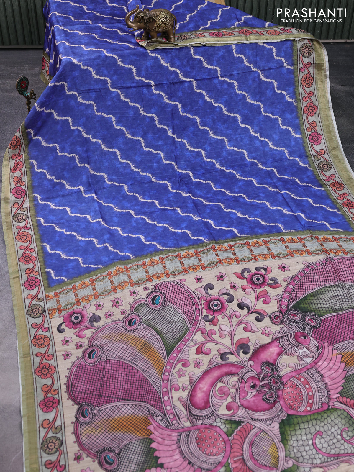Semi tussar saree blue and pastel green with allover shibori prints and kalamkari pallu & zari border