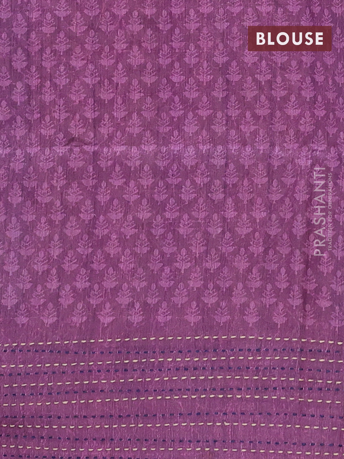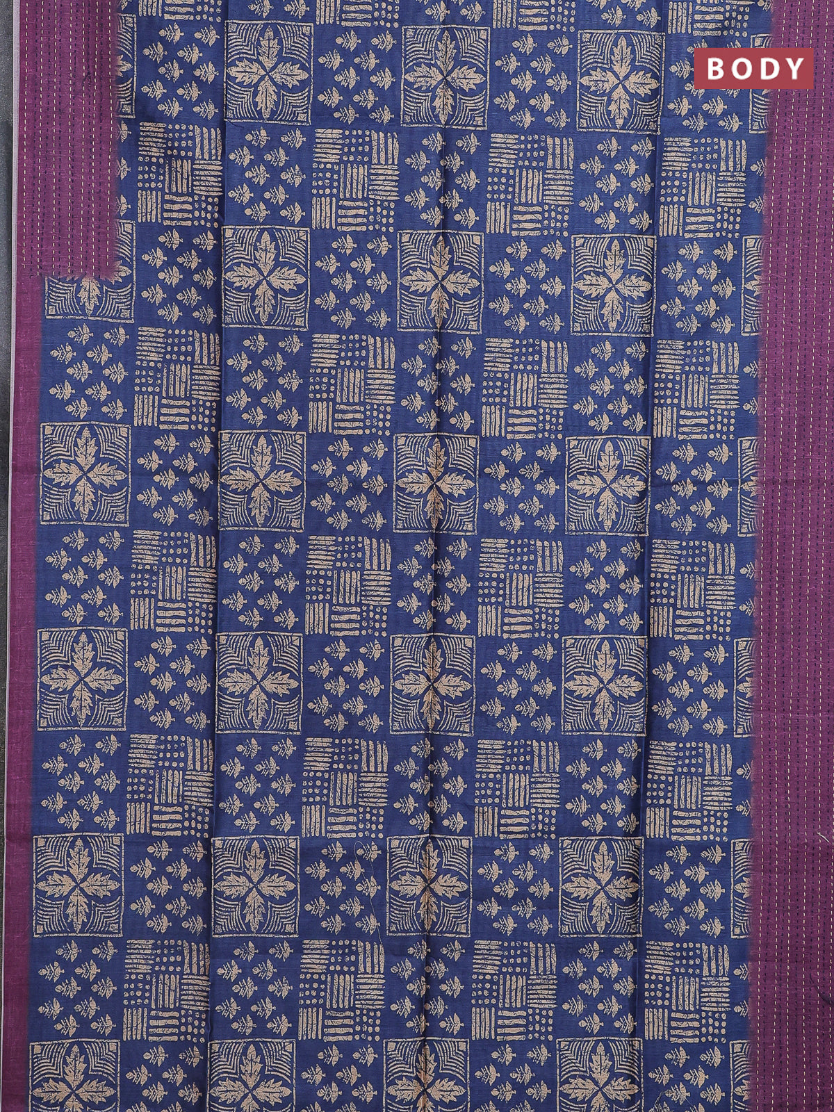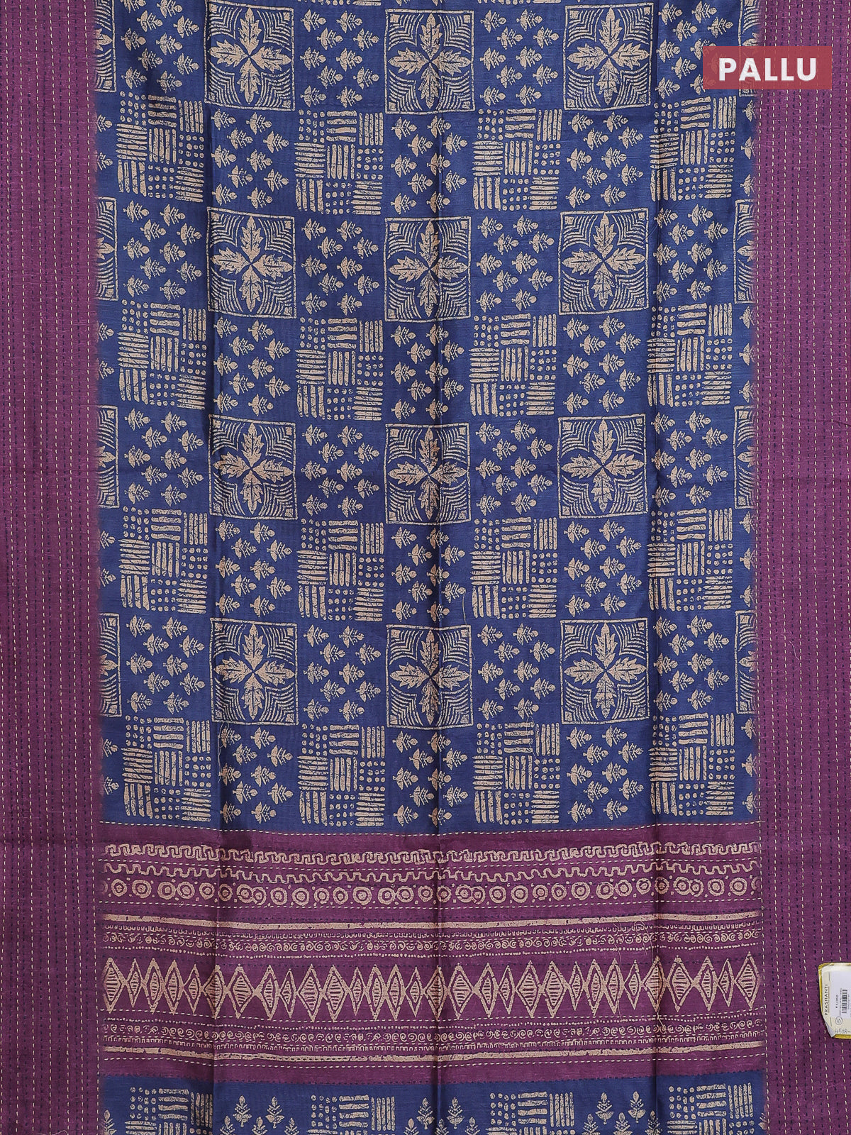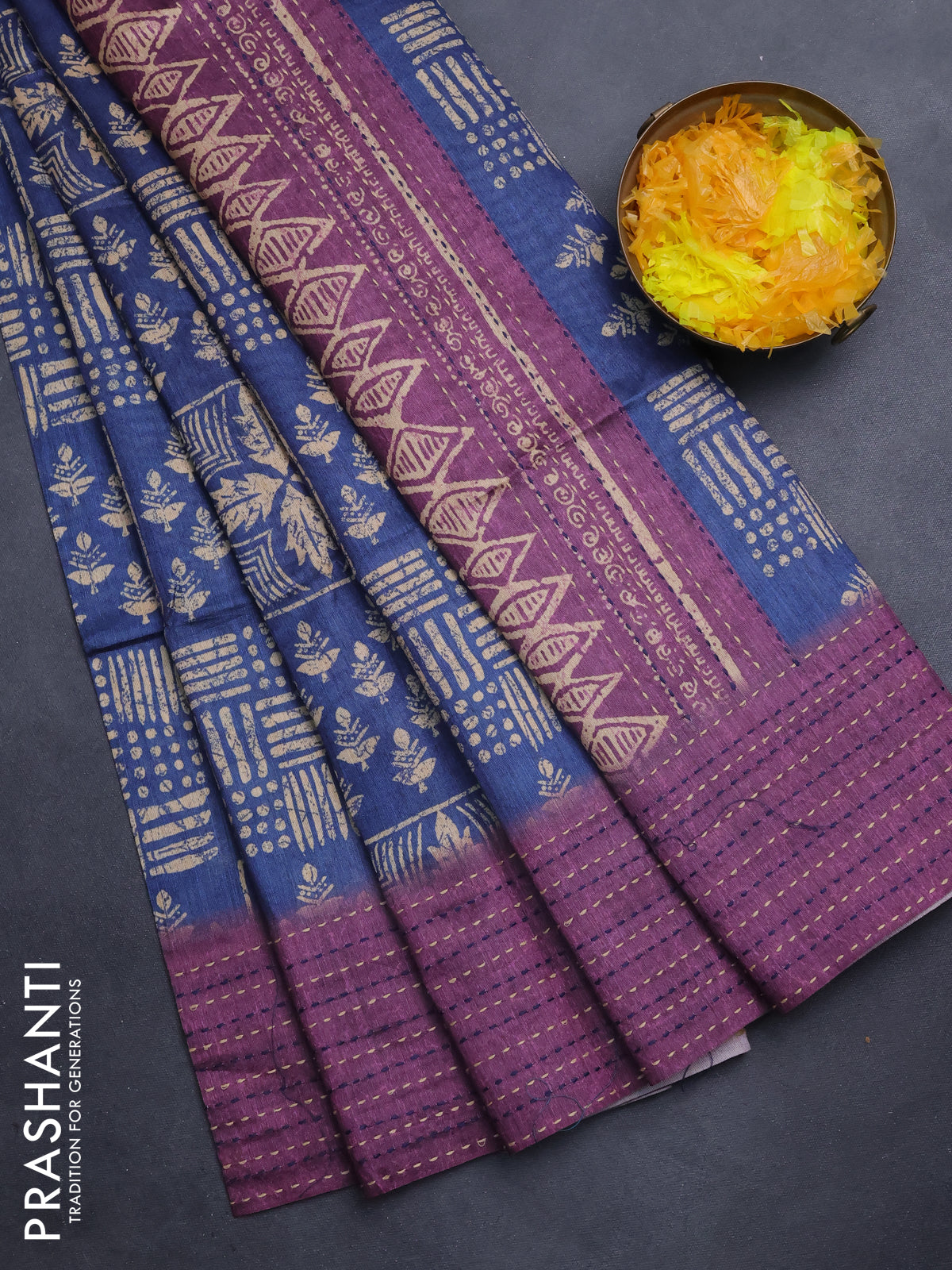 Semi tussar saree blue and purple with allover batik prints and katha stitch work pallu & border