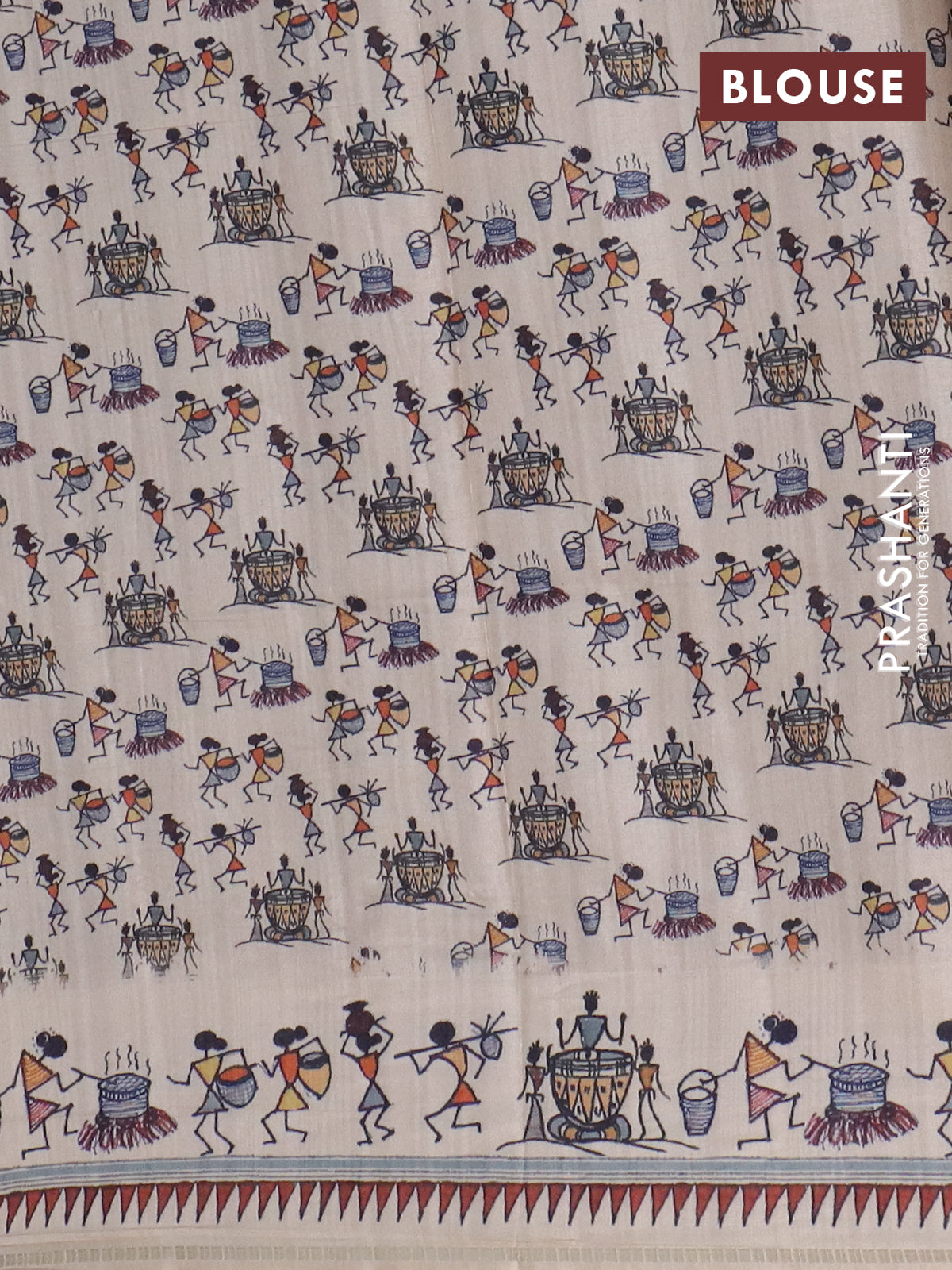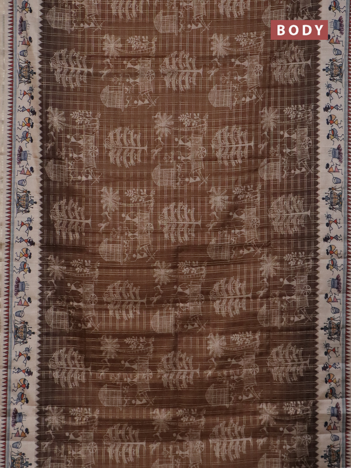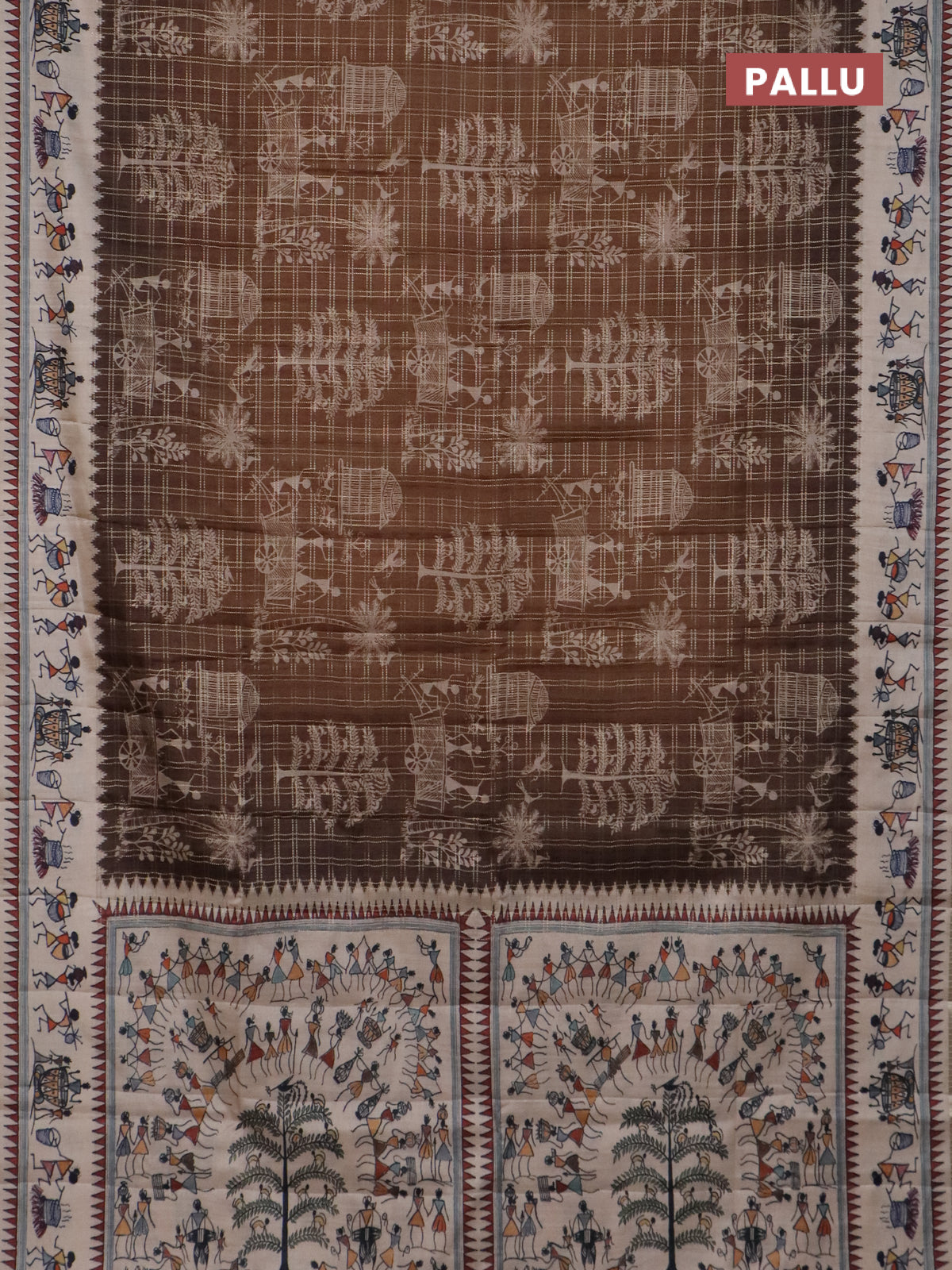 Semi tussar saree brown and cream with allover zari checks & warli prints and printed border