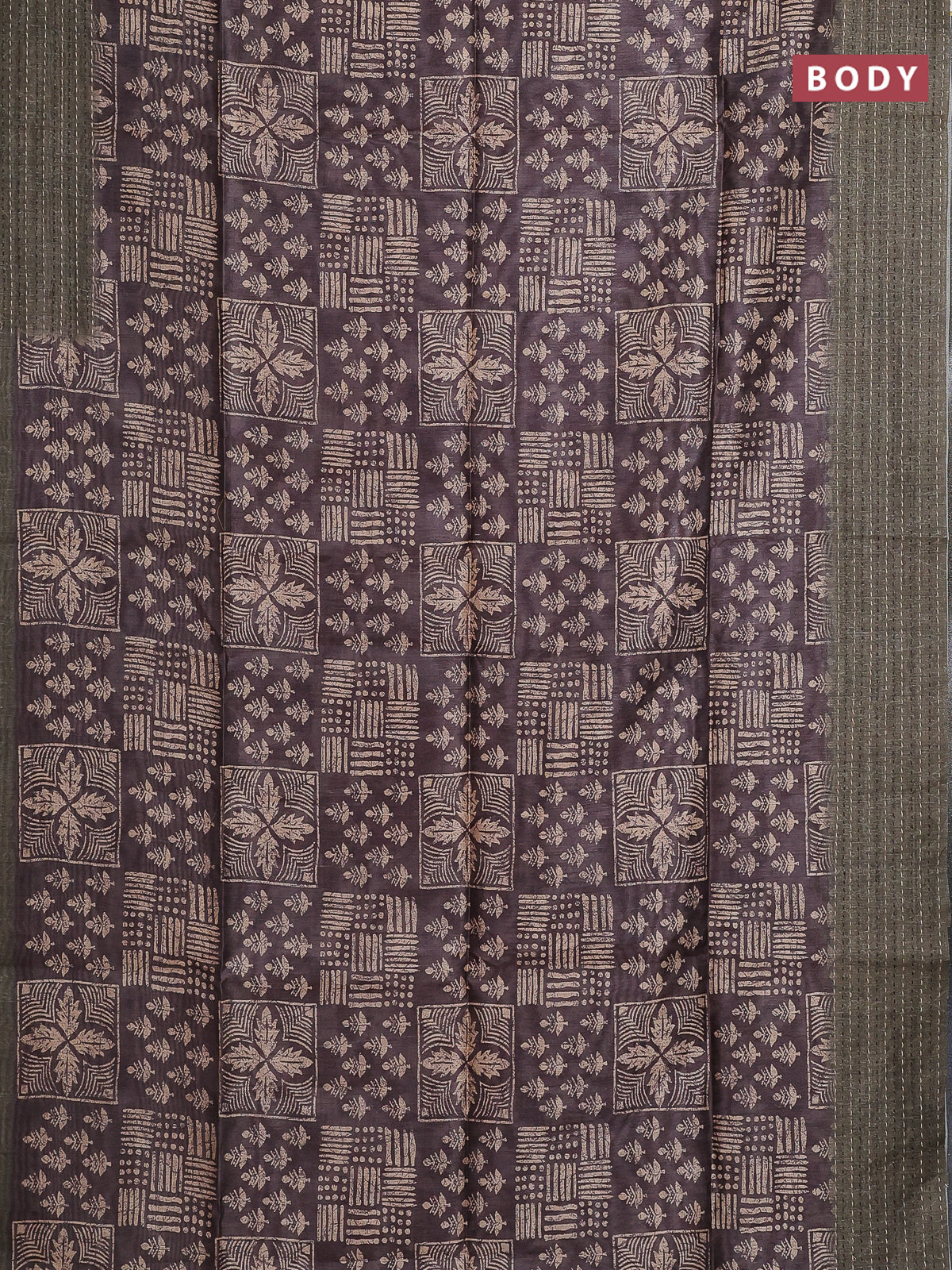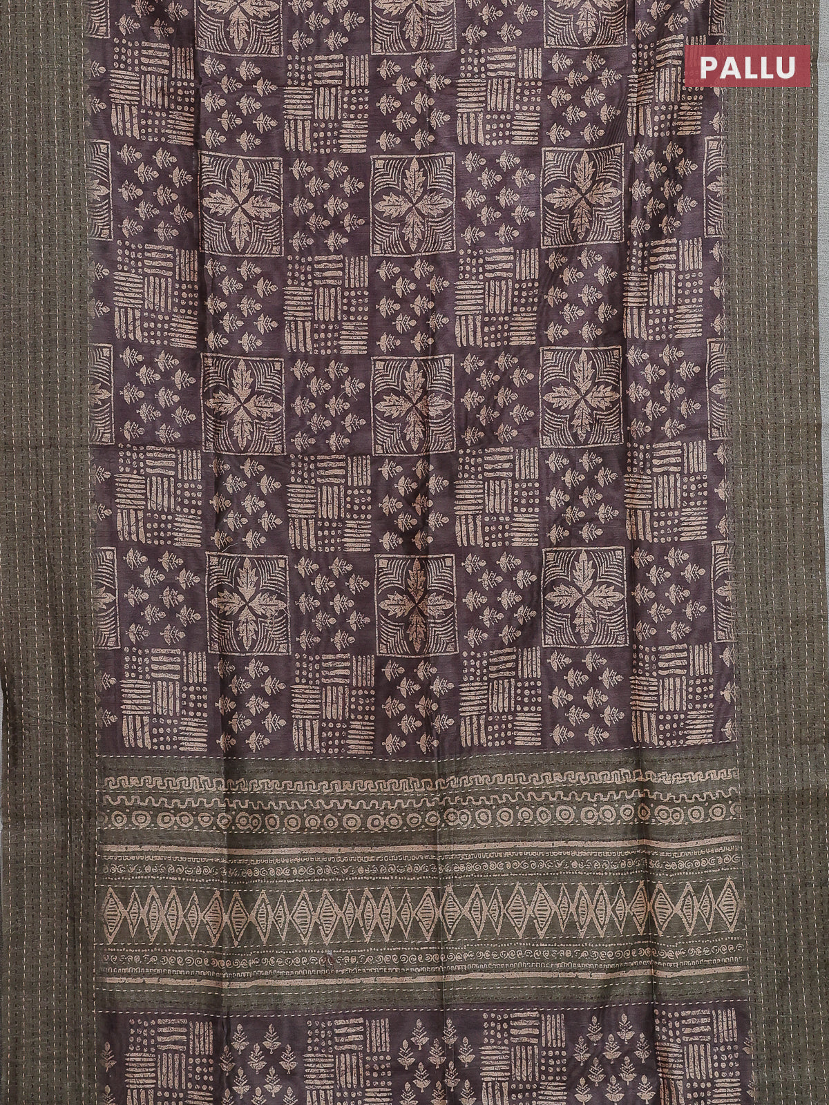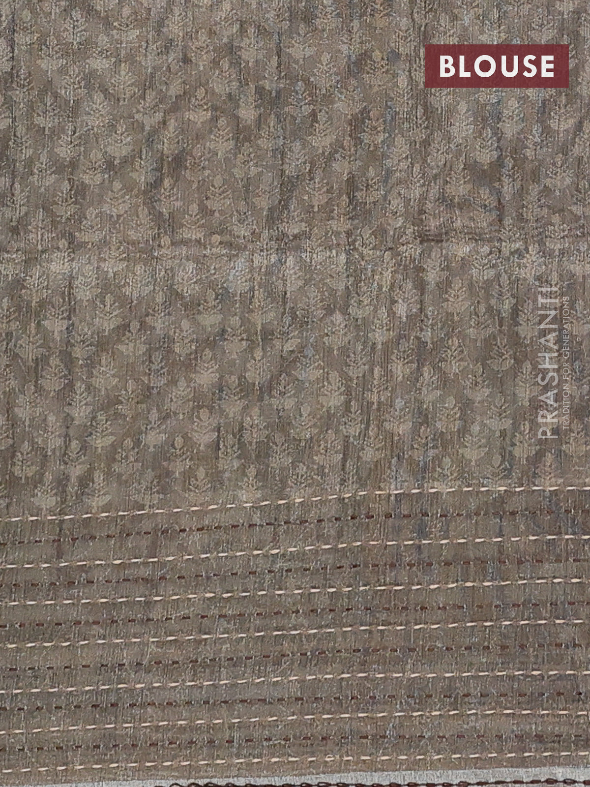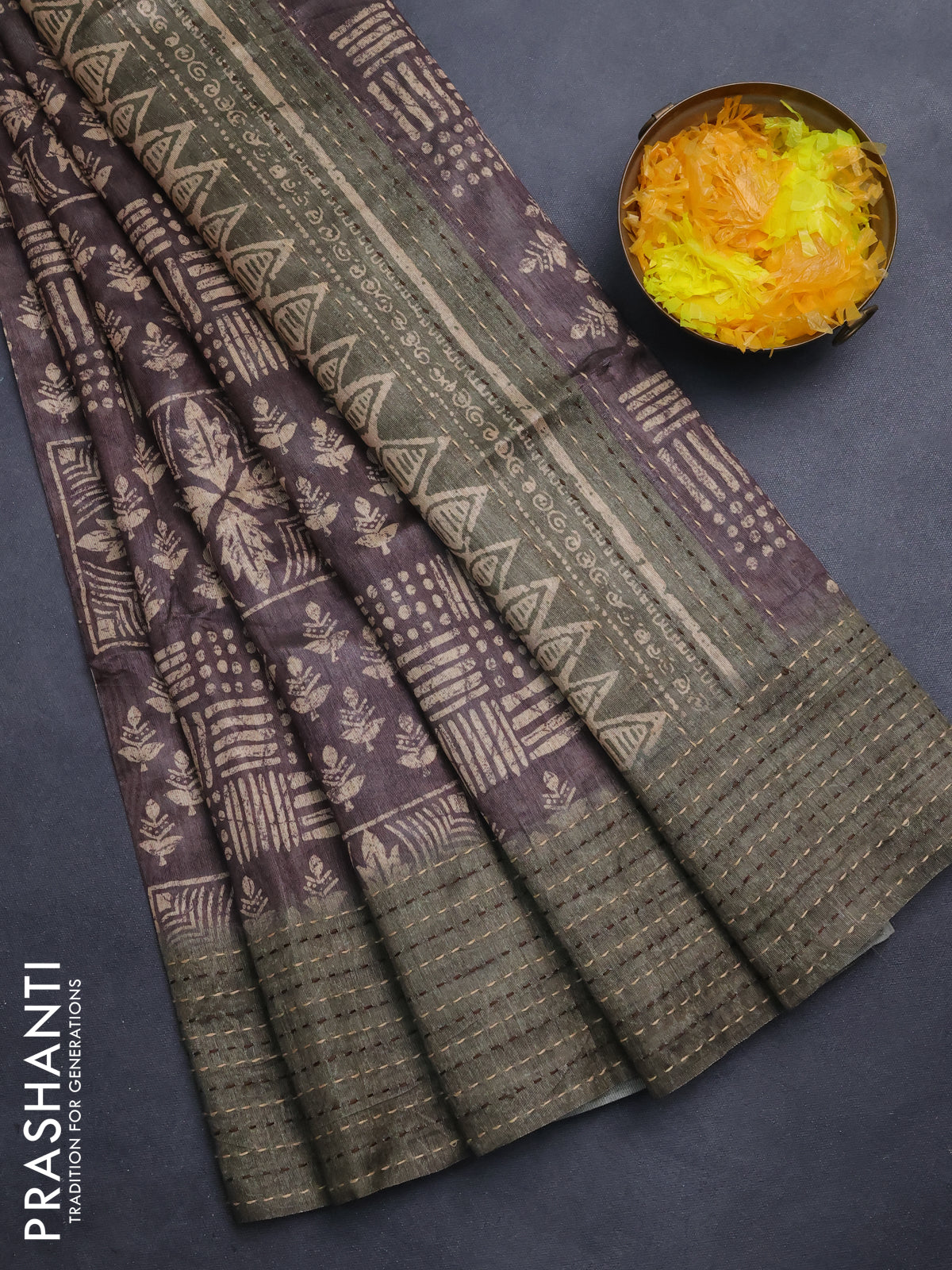 Semi tussar saree coffee brown and sap green with allover batik prints and katha stitch work pallu & border