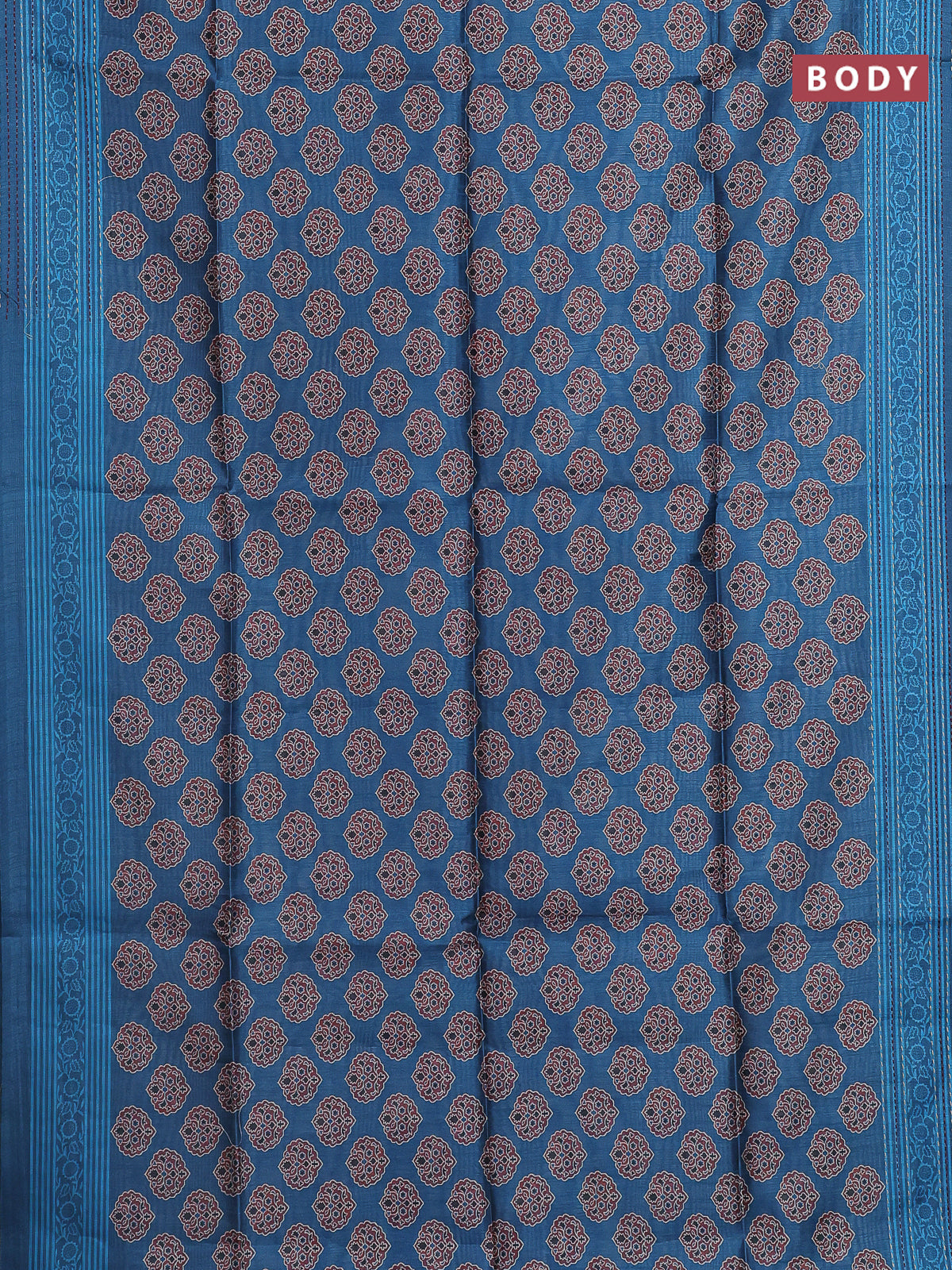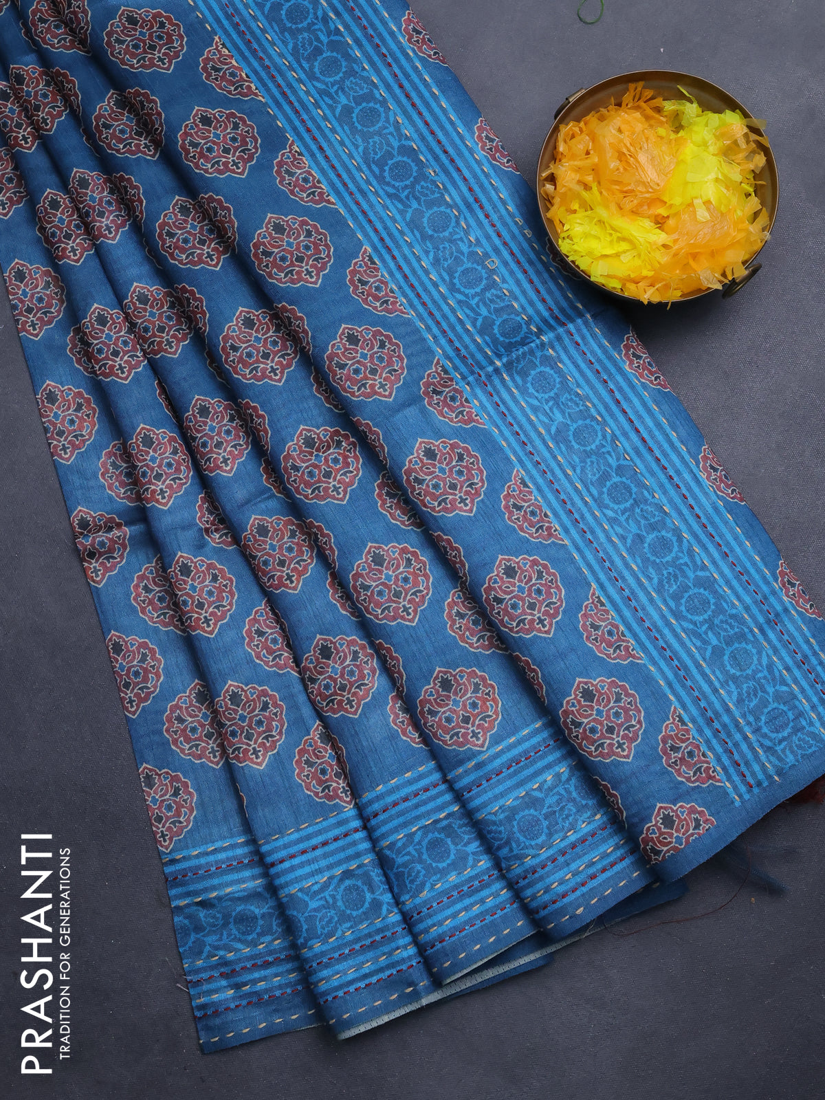 Semi tussar saree cs blue with allover ajrakh butta prints and katha stitch work pallu & border