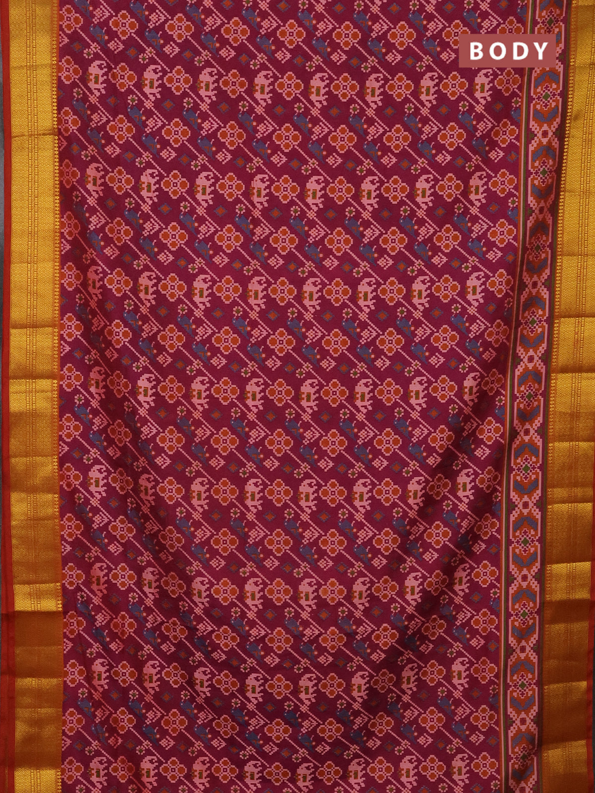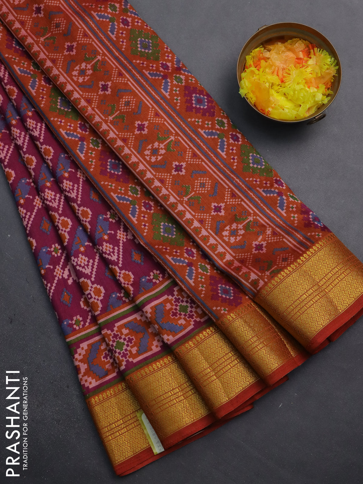 Semi tussar saree dark magenta pink and rust shade with allover patola prints and zari woven border
