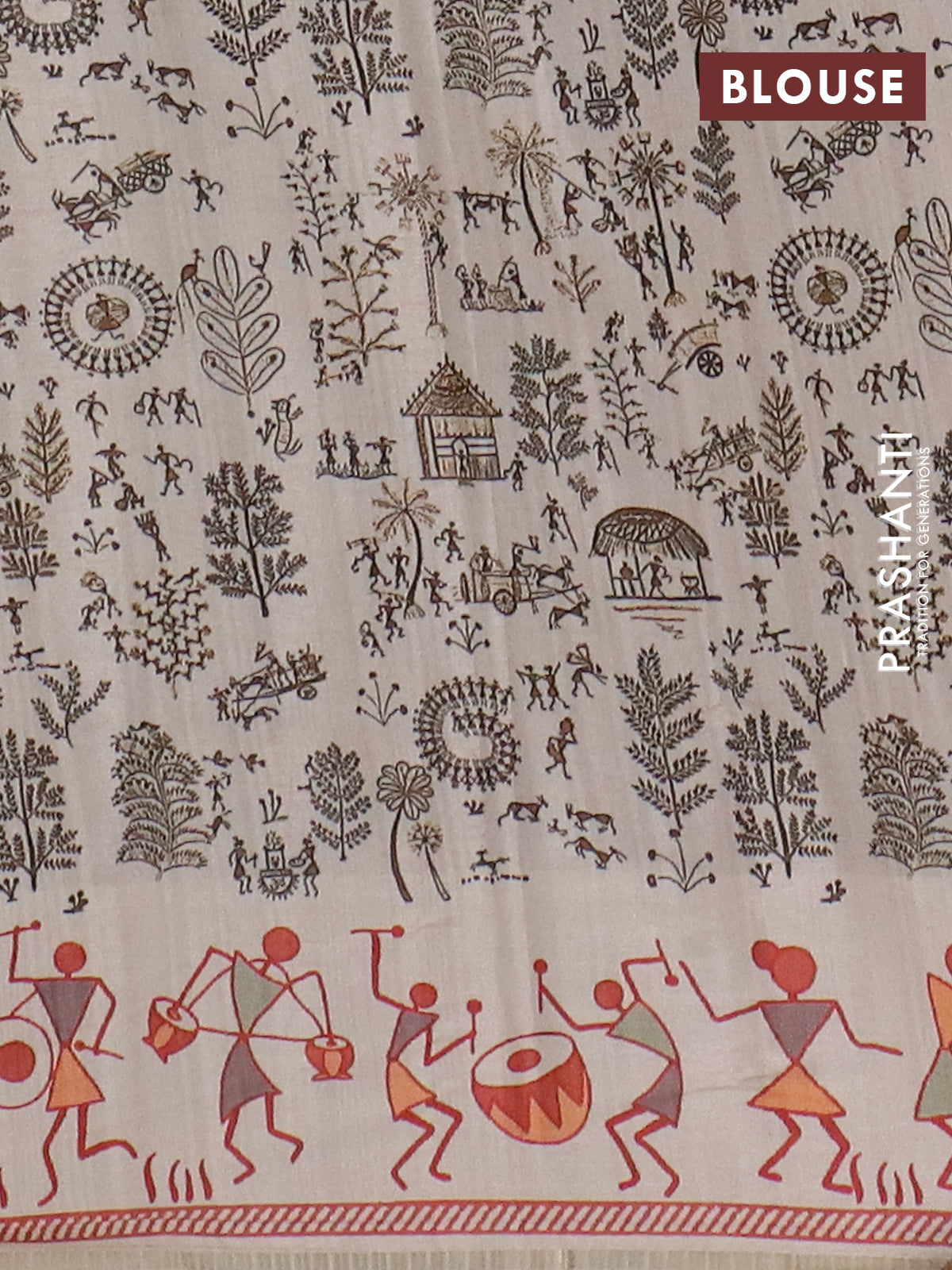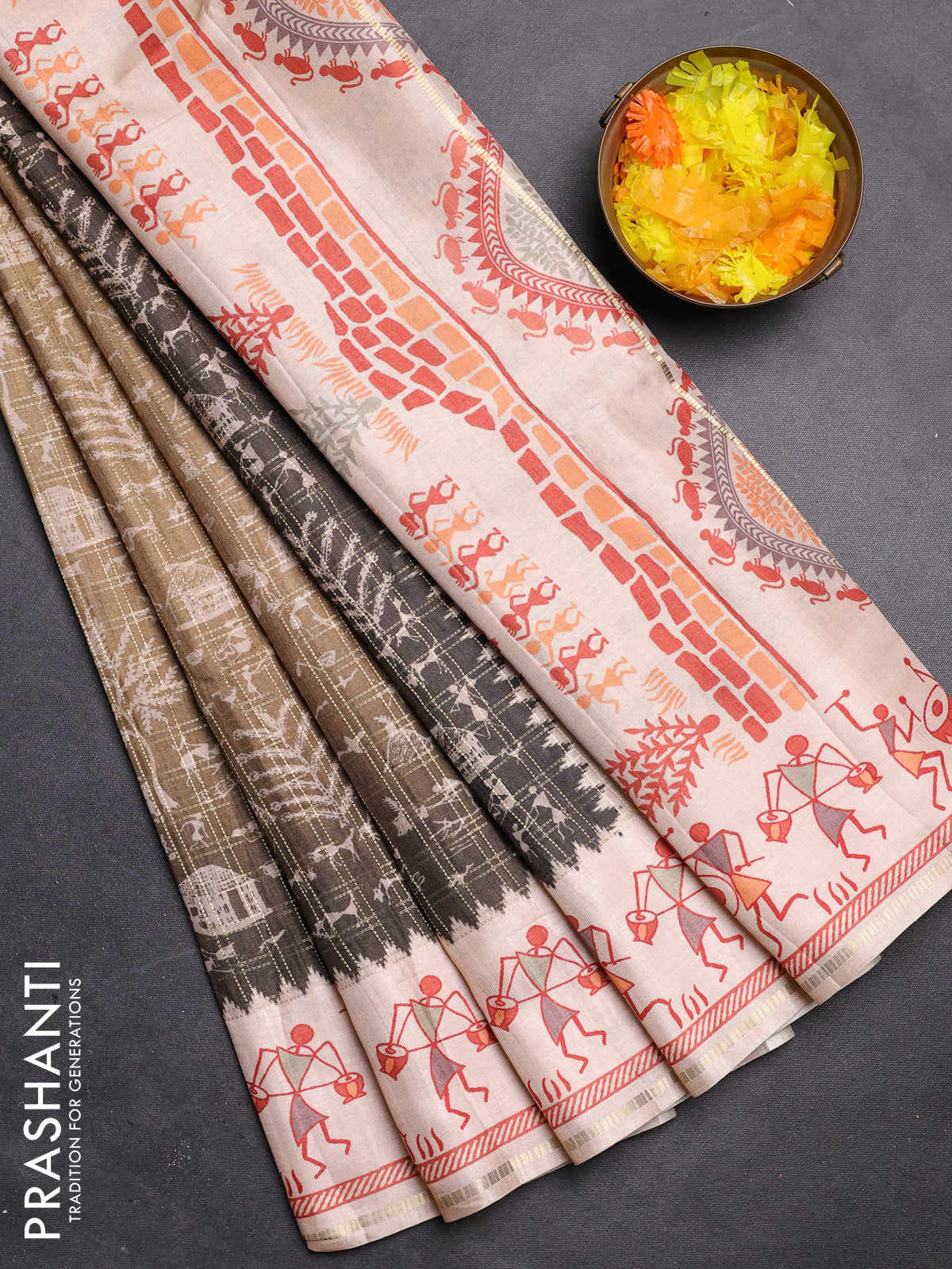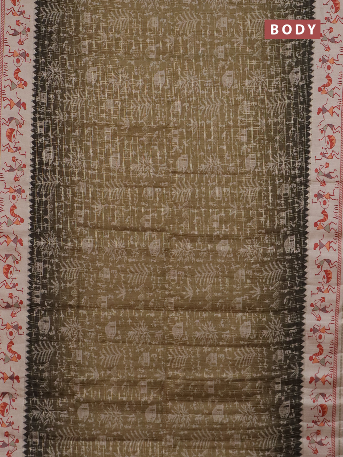 Semi tussar saree dark mehendi green and cream with allover zari checks & warli prints and printed border