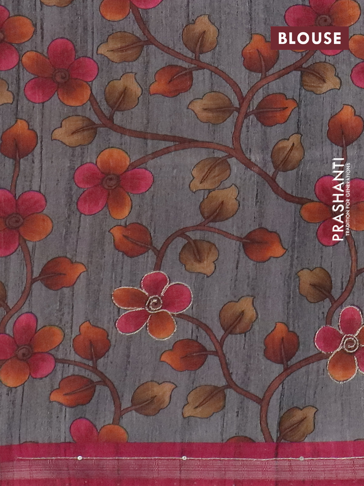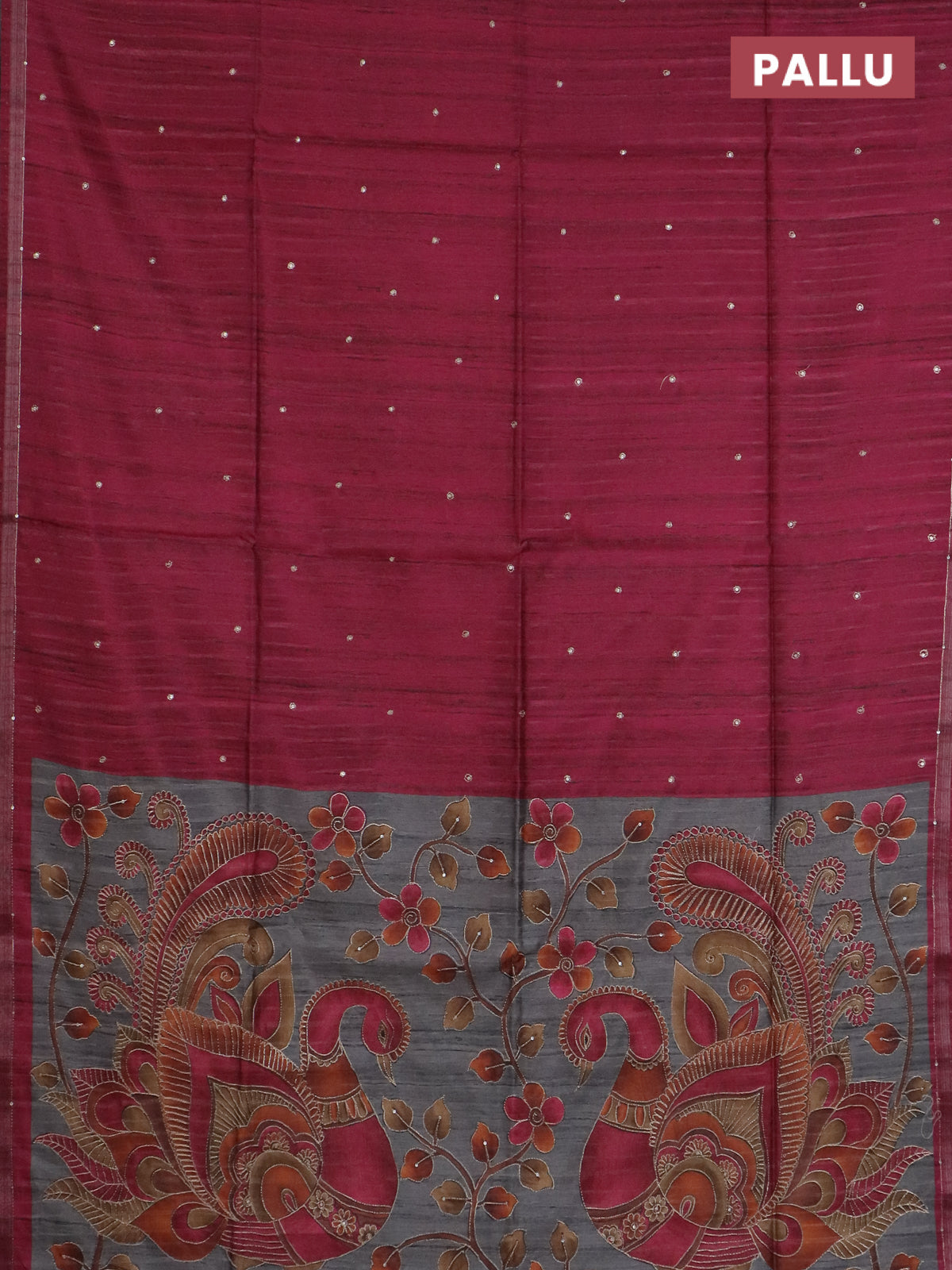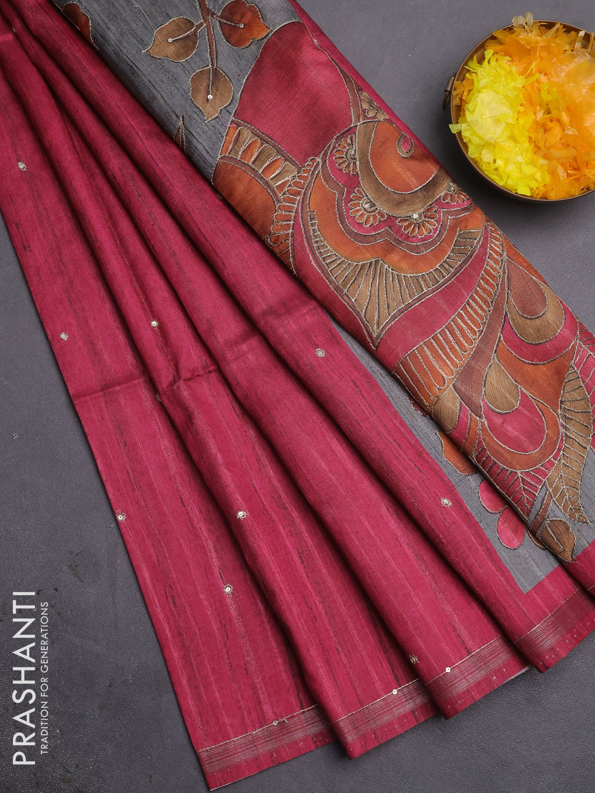 Semi tussar saree dark pink and grey with embroidery buttas and kalamkari prints & pita work pallu