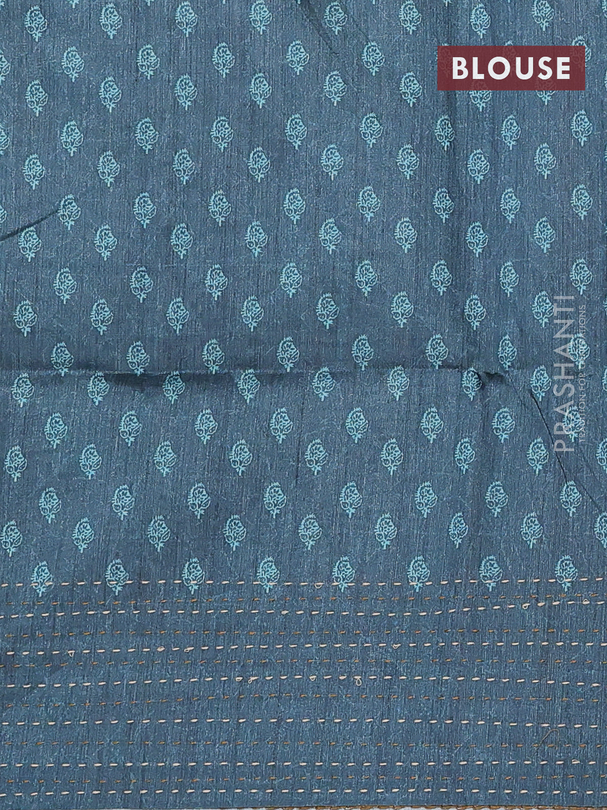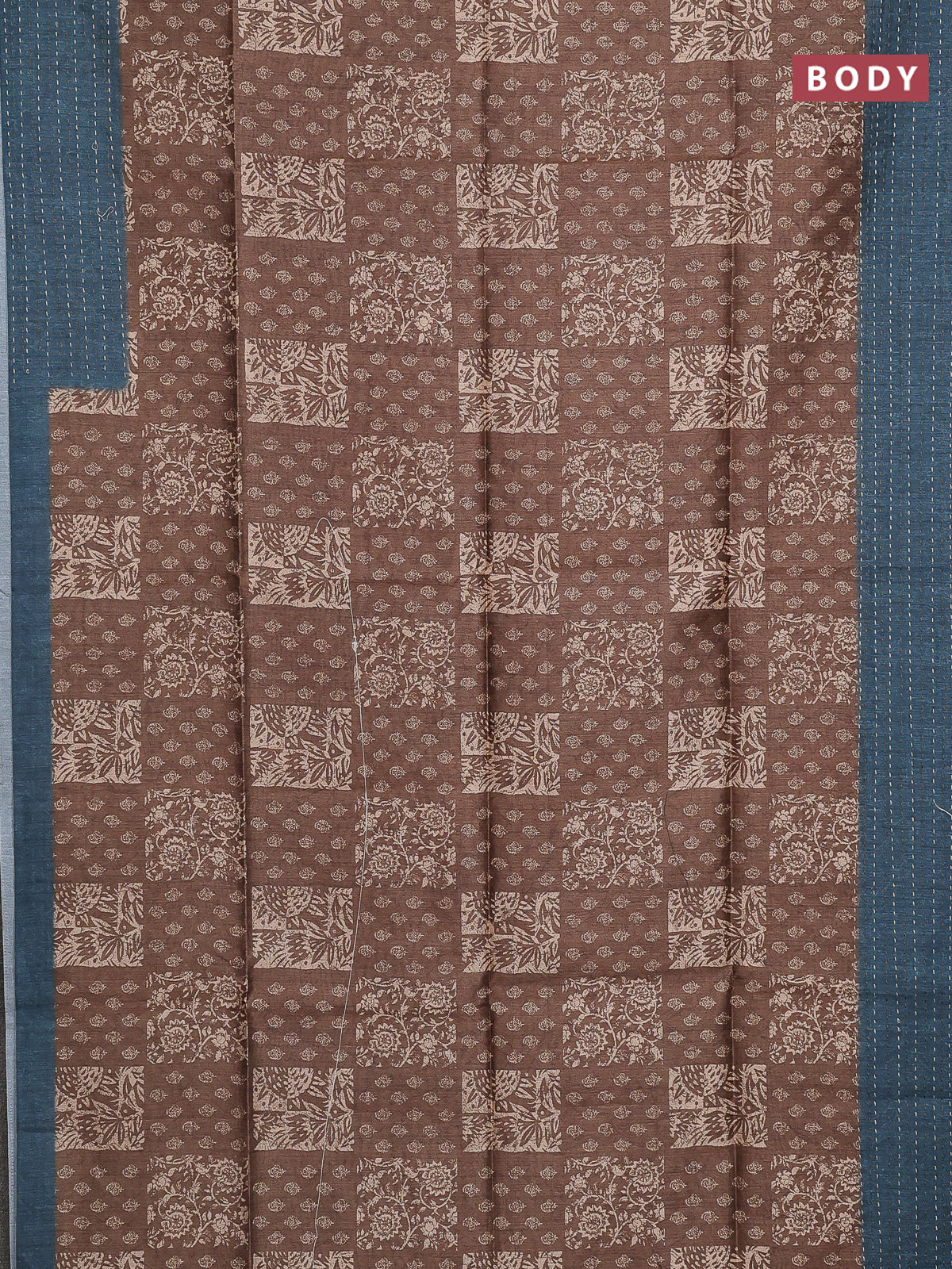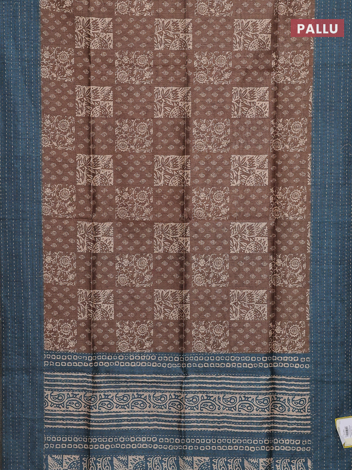 Semi tussar saree dark sandal and peacock green with allover batik prints and katha stitch work pallu & border