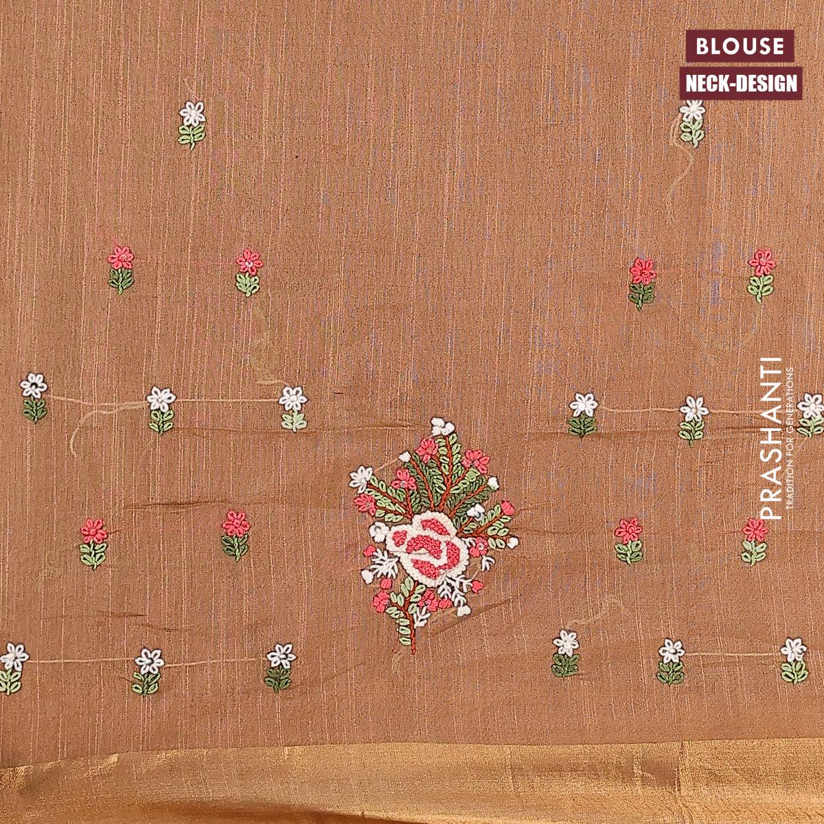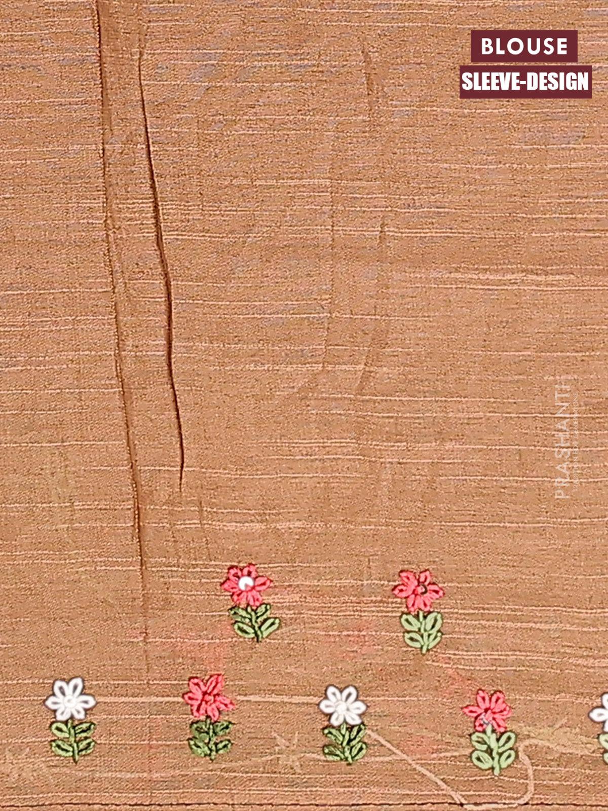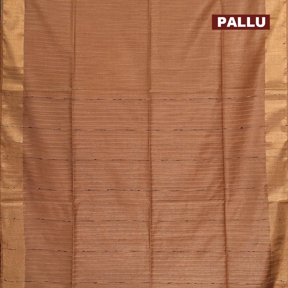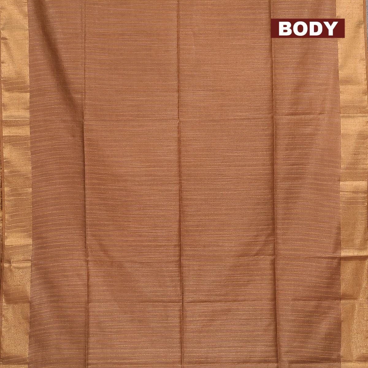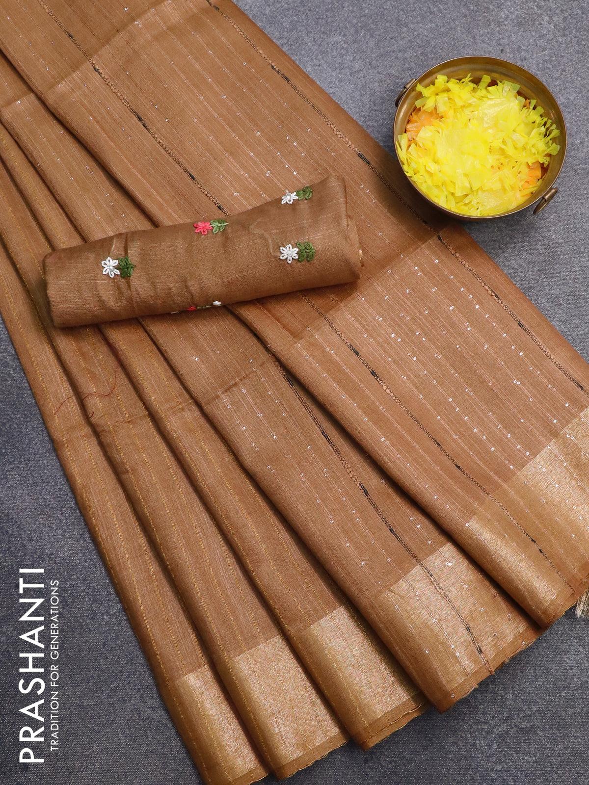 Semi tussar saree dark sandal with allover stripes pattern and seperate embroidery work blouse