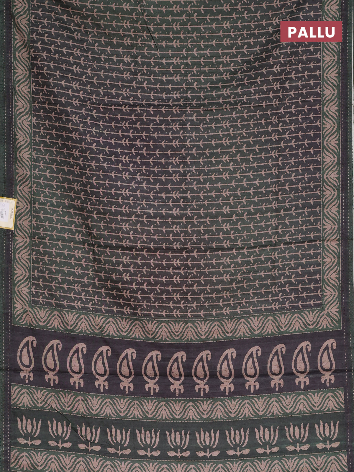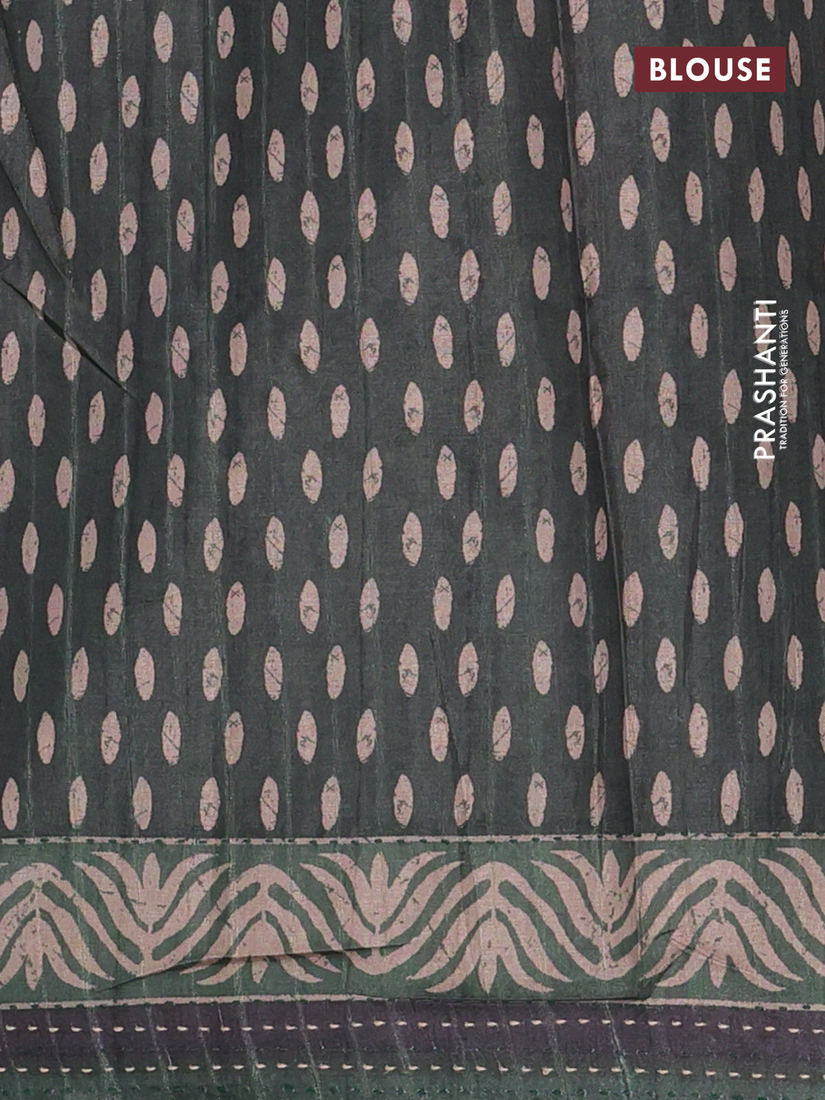 Semi tussar saree dark sap green with allover prints and kantha stitch work border