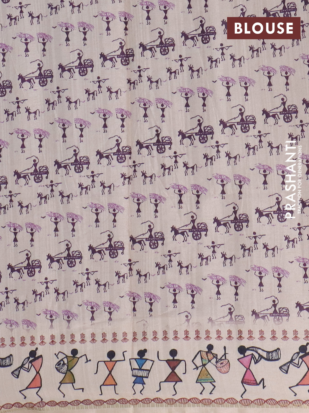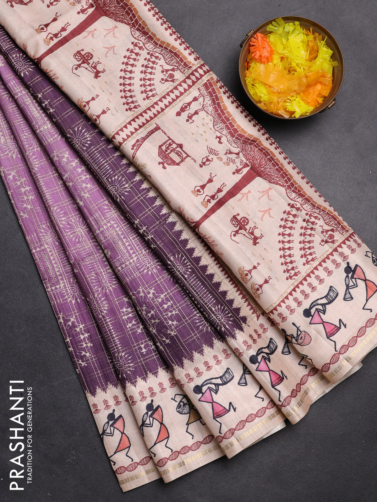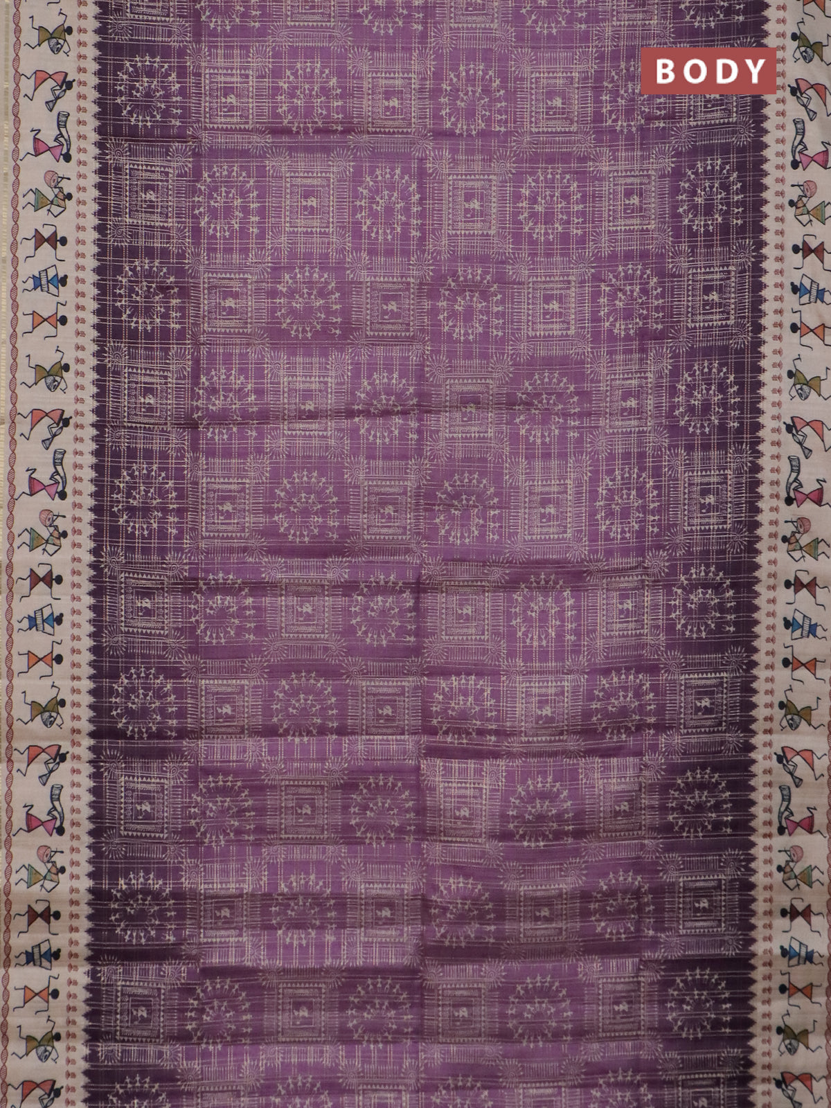 Semi tussar saree deap jamun and cream with allover zari checks & warli prints and printed border
