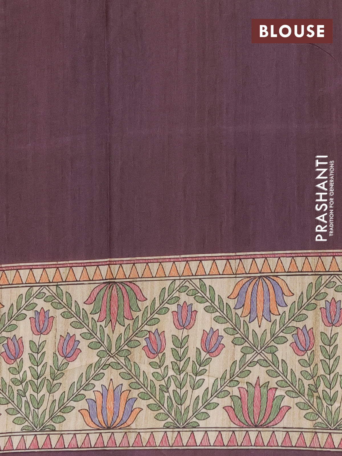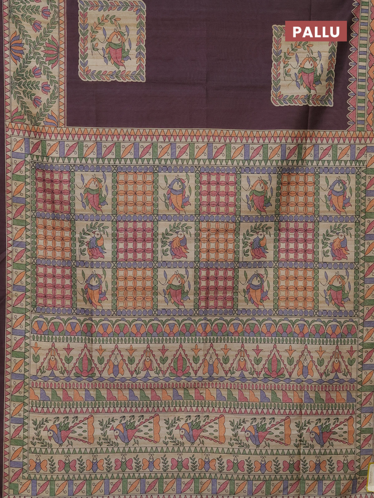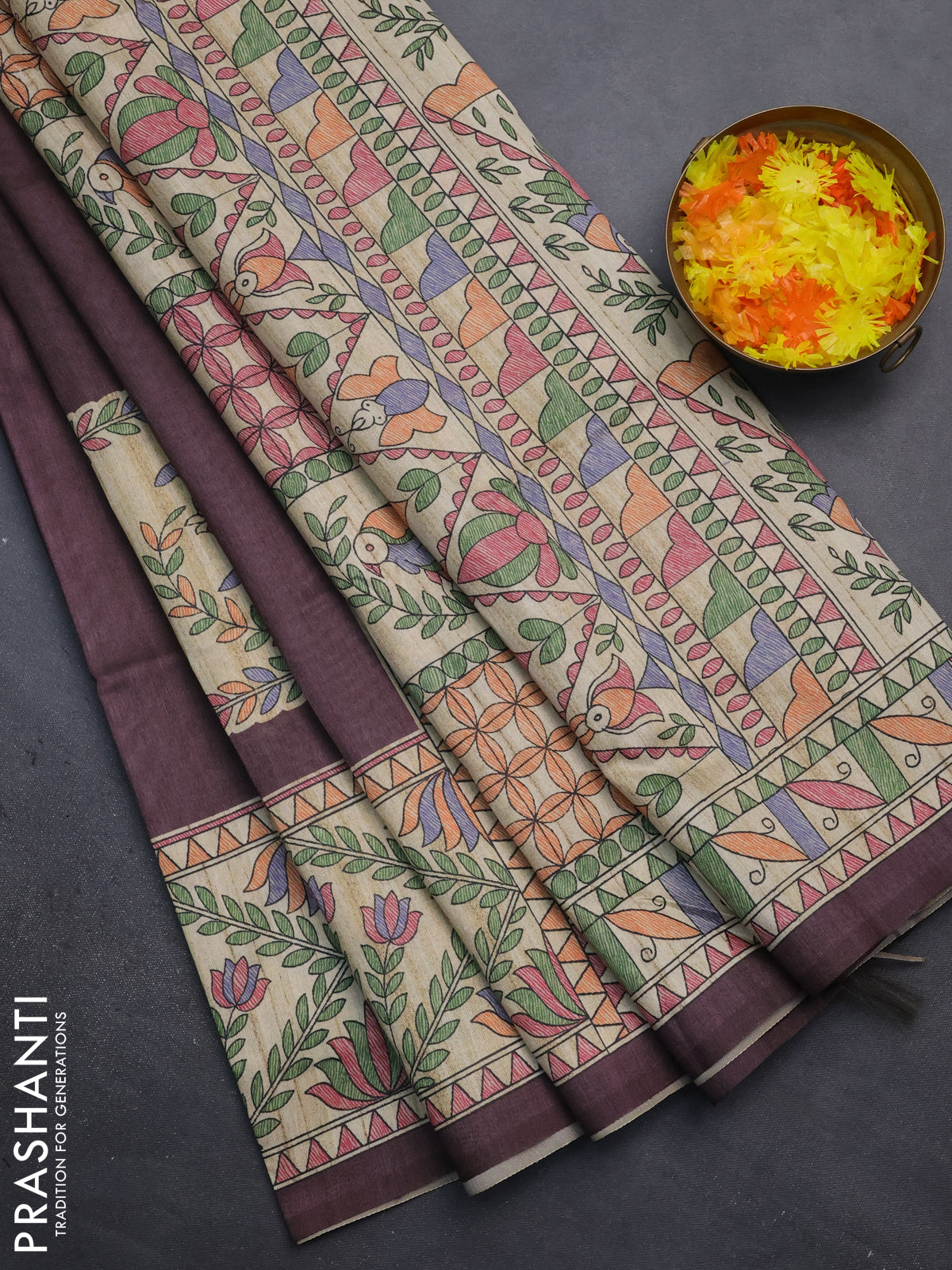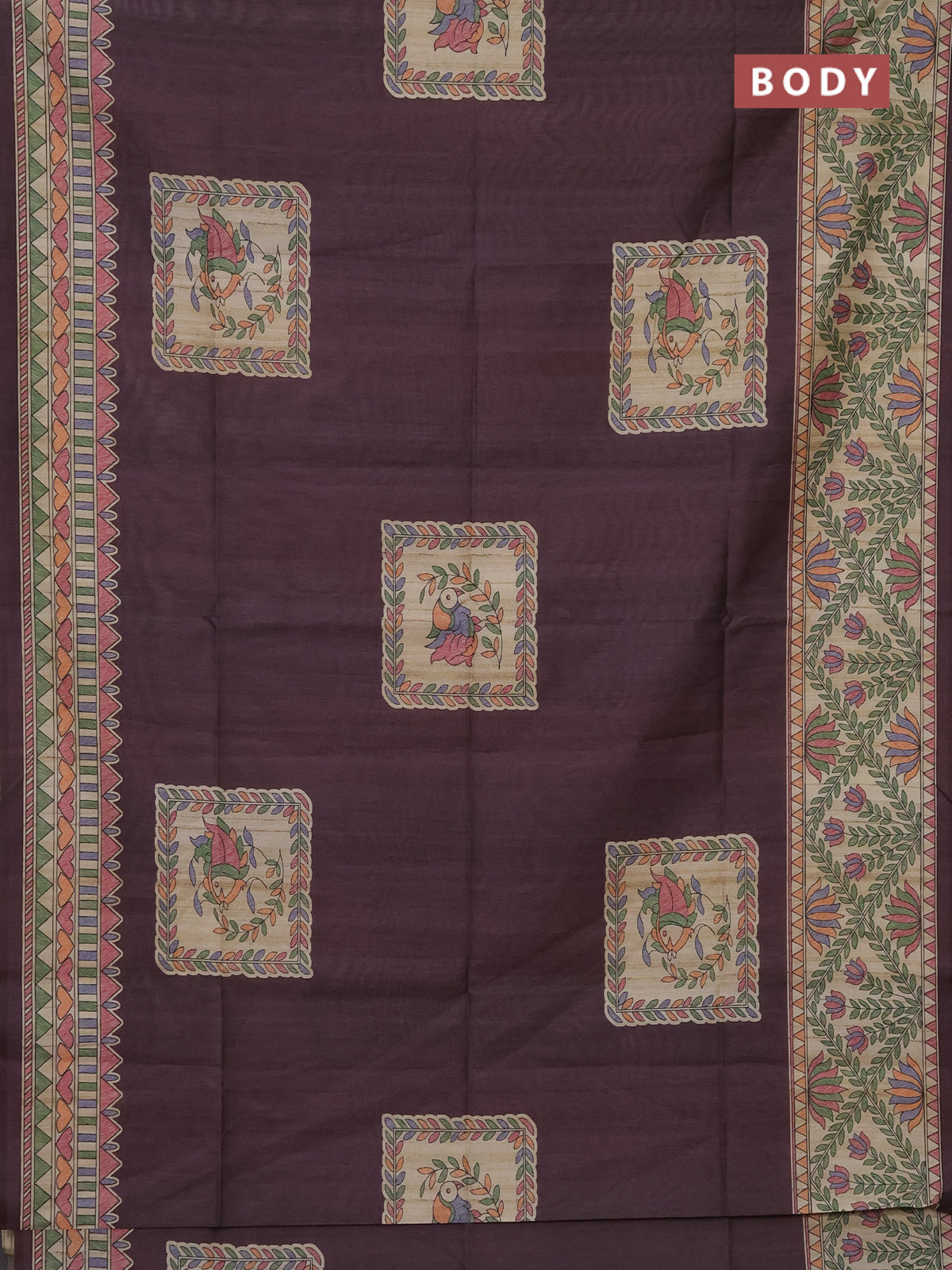 Semi tussar saree deep wine and beige with madhubani prints and printed border