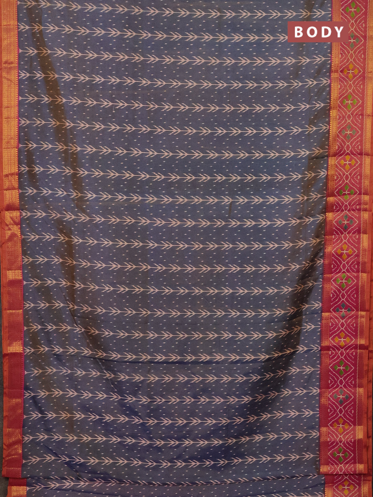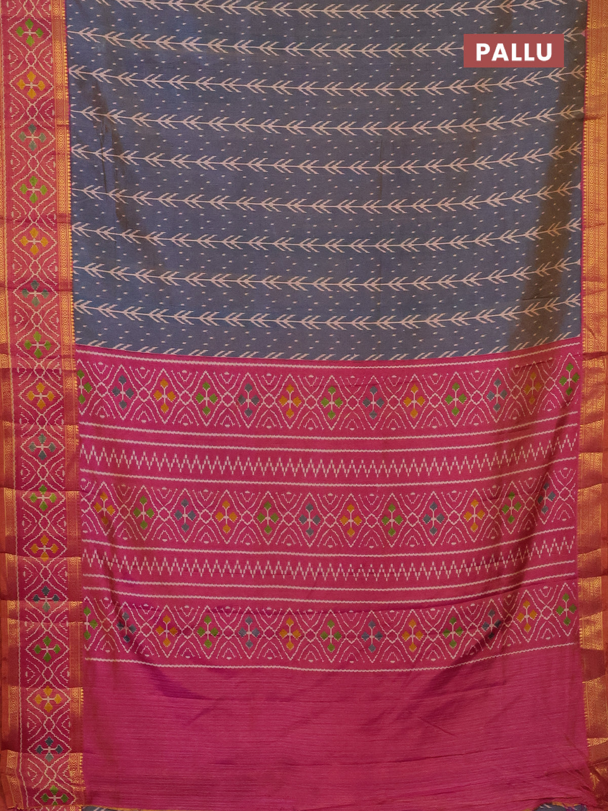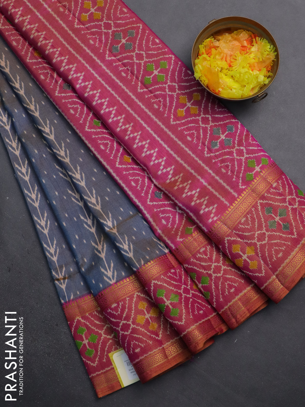 Semi tussar saree dual shade of bluish grey and pink with allover ikat prints and zari woven ikat border