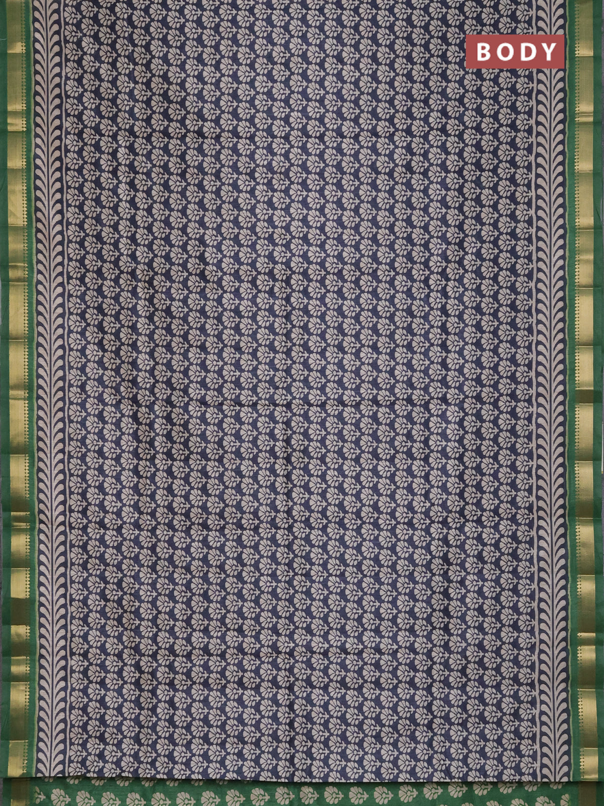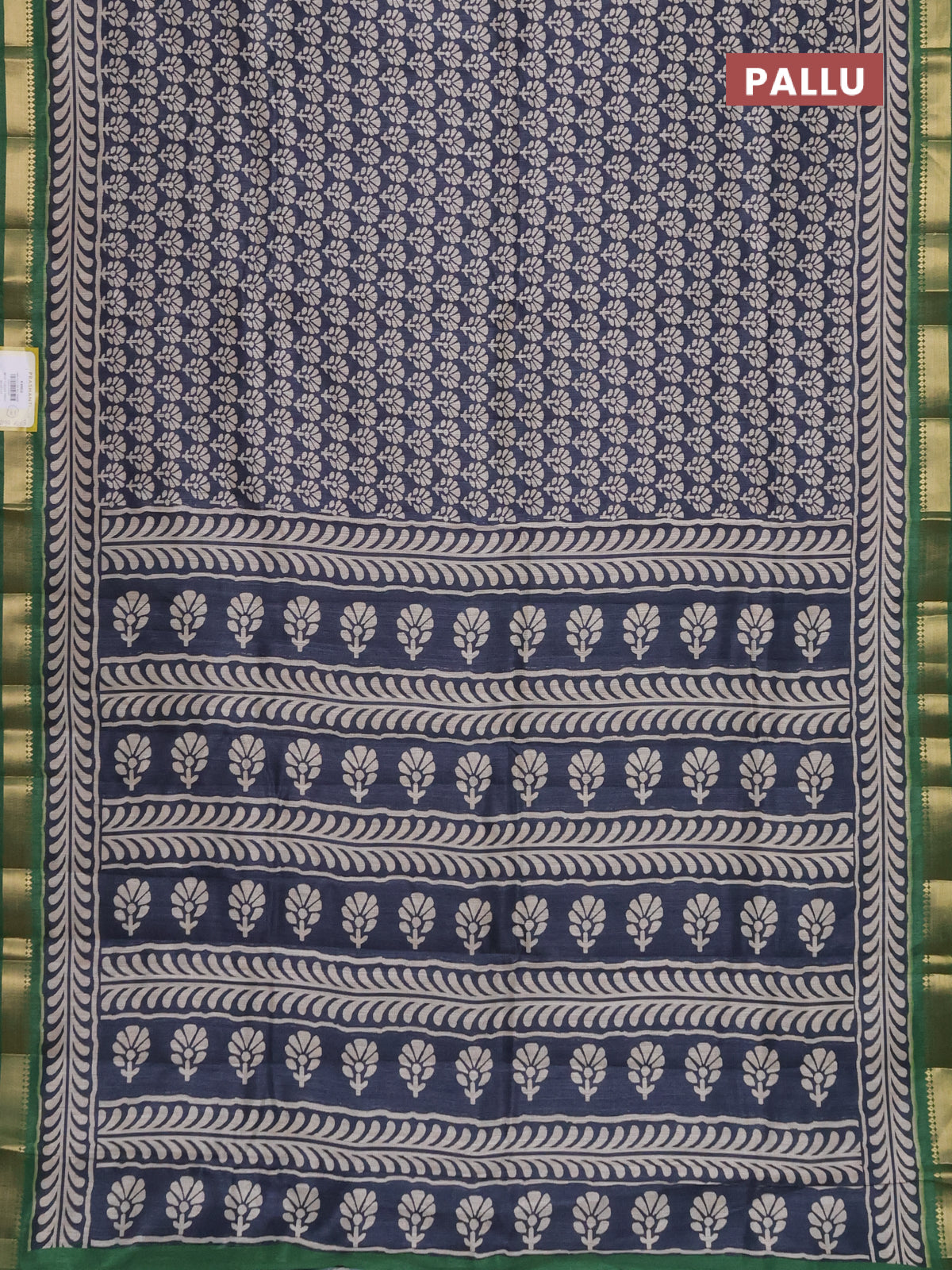 Semi tussar saree elephant grey and green with floral butta prints and zari woven border