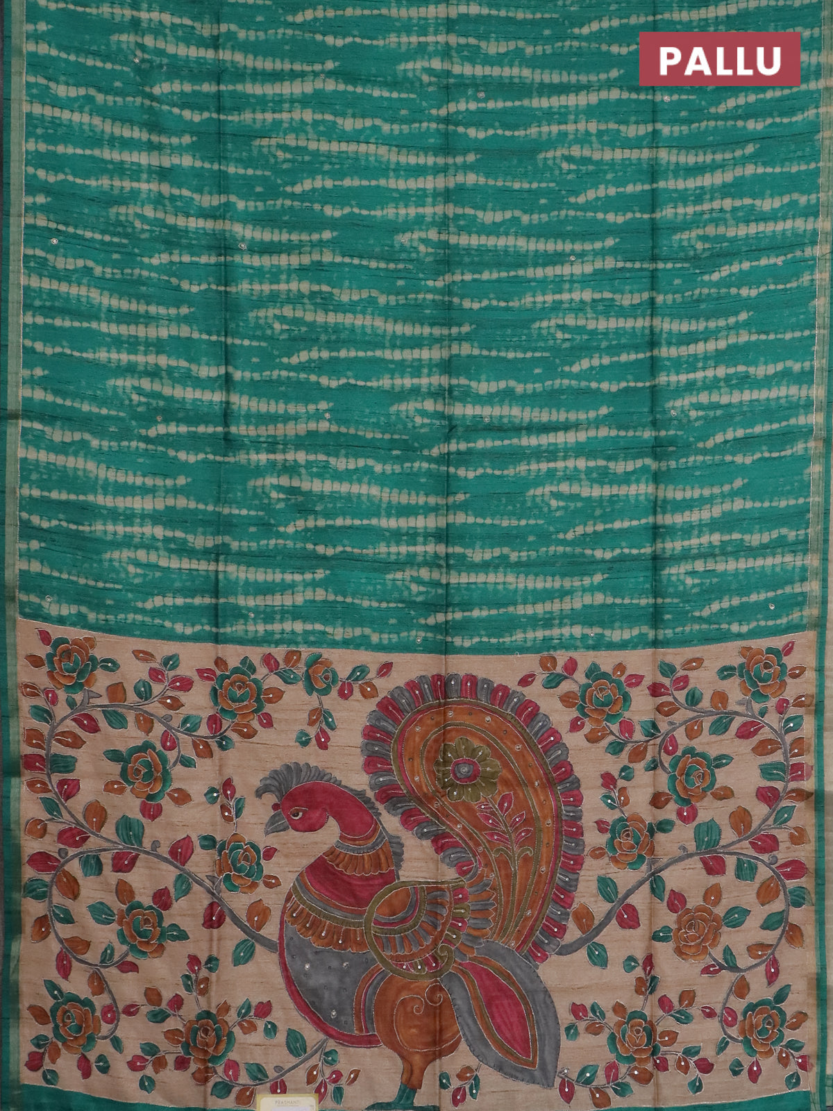 Semi tussar saree green and beige with allover tie & dye prints and kalamkari prints & pita work pallu