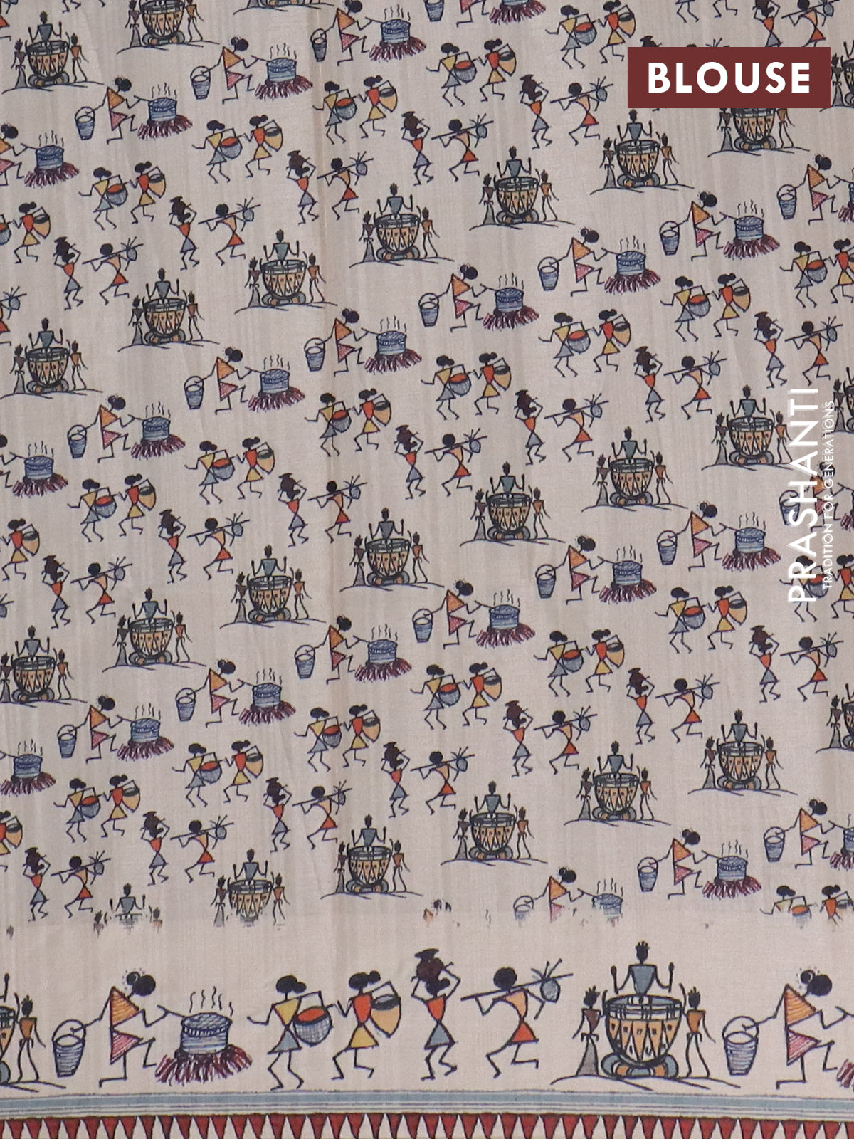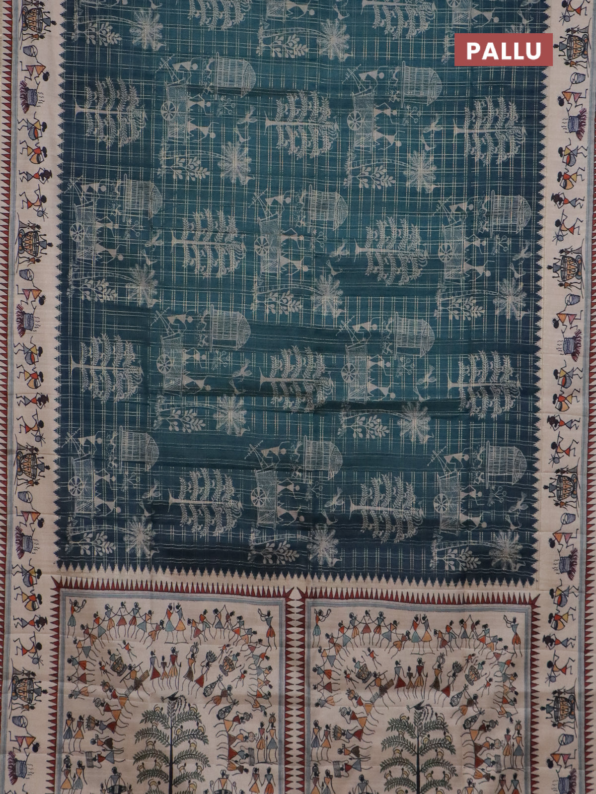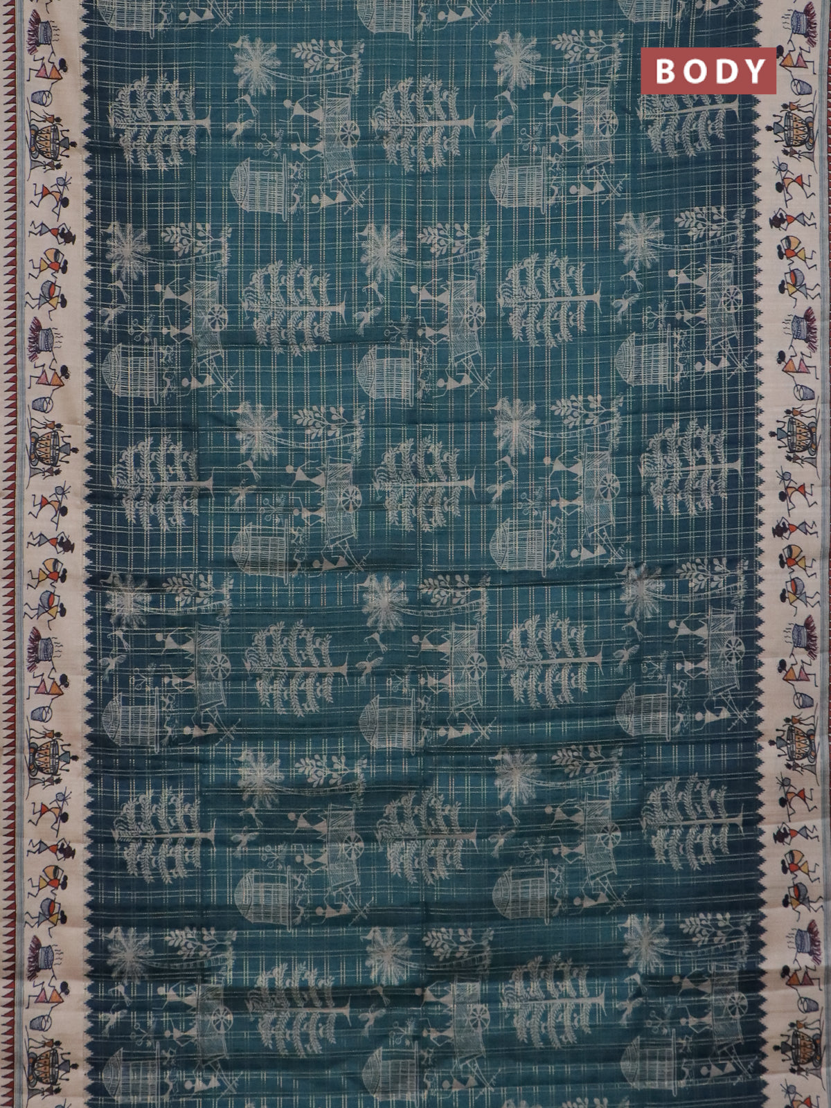 Semi tussar saree green and cream with allover zari checks & warli prints and printed border