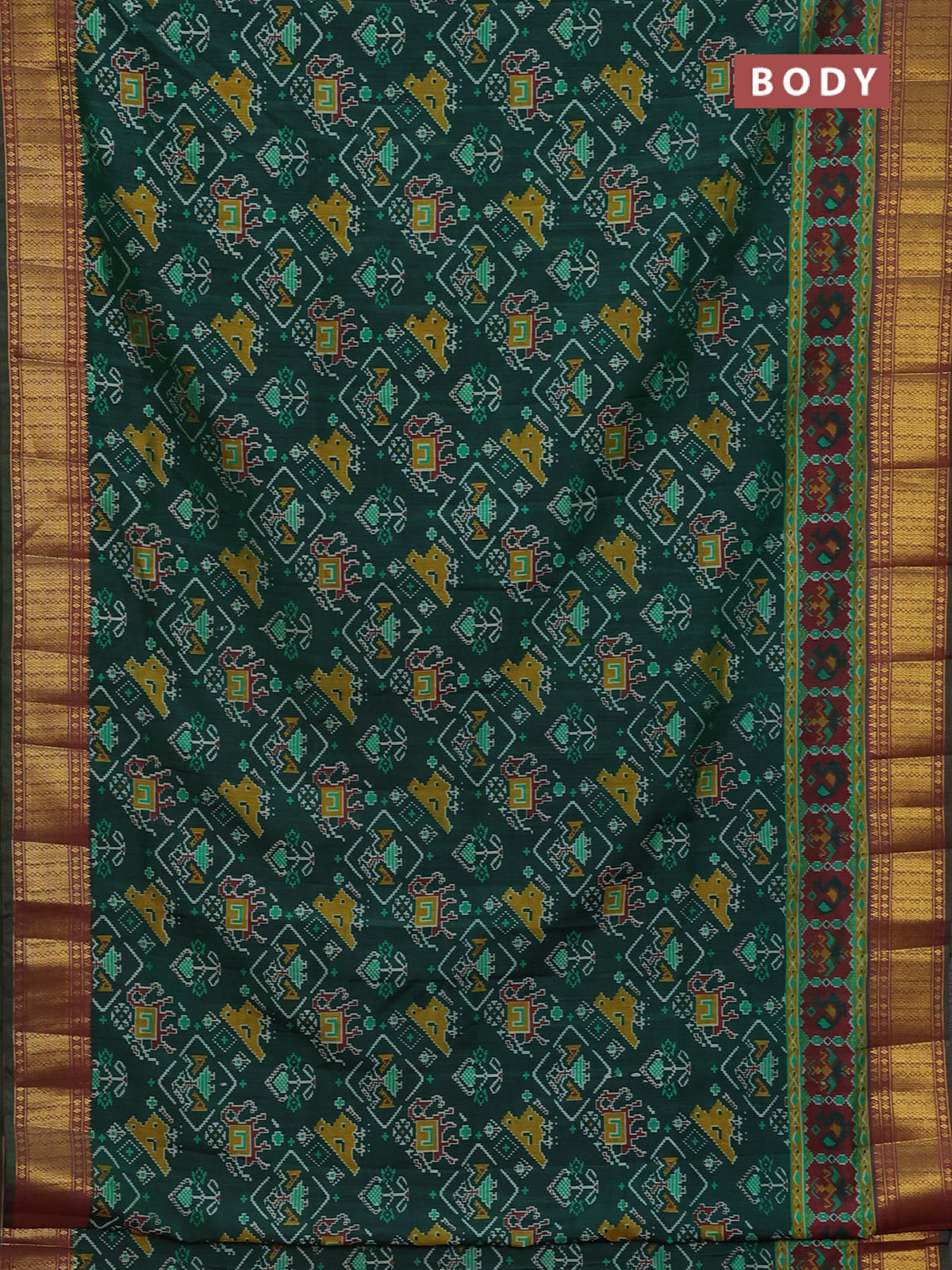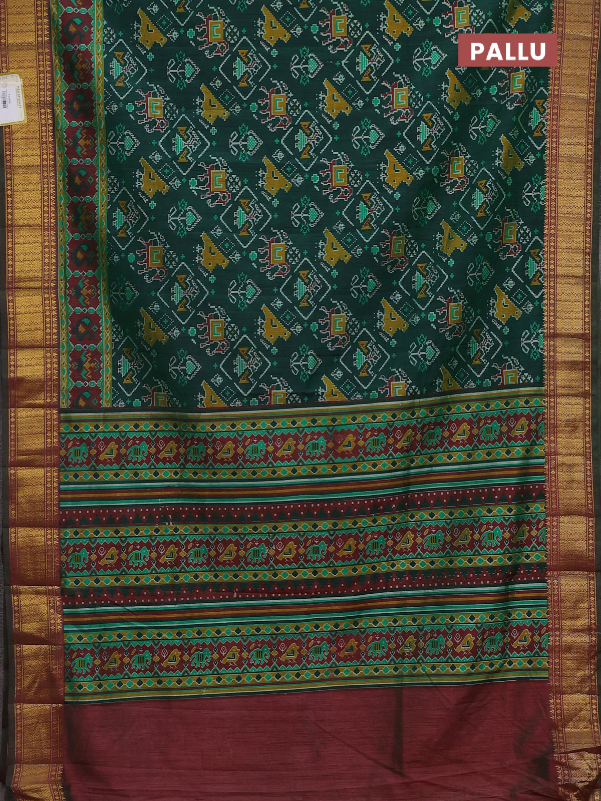 Semi tussar saree green and maroon with allover ikat prints and zari woven border